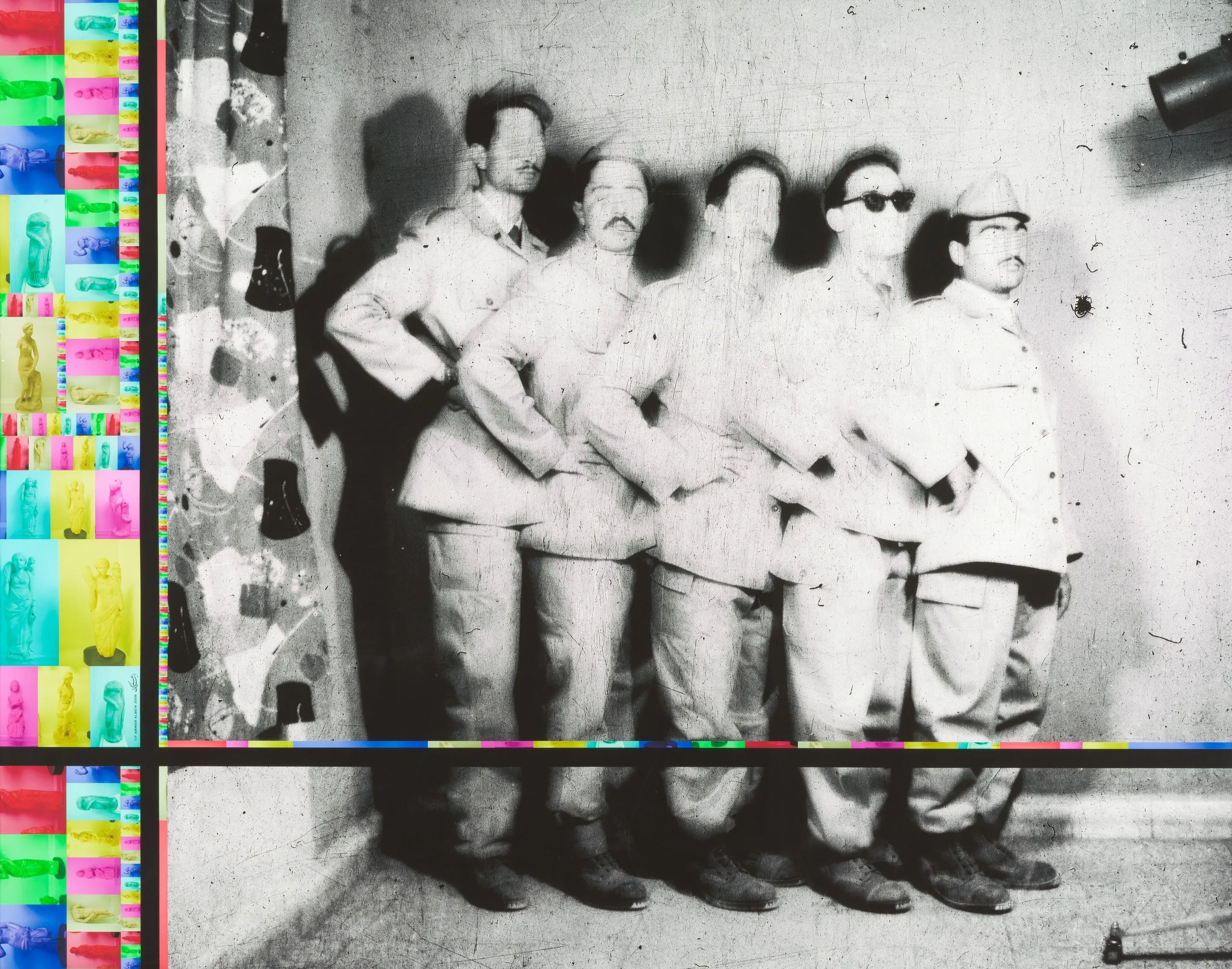 Ammar Al Beik is one of a growing group of Arab artists whose work focuses on the state of image making, past and present, by incorporating old archival and found photographs. These remade images document, conflate, and obscure ideas of history and memory in a society that has been in almost constant turmoil for decades. In these two prints (see M.2013.39.5), which are part of a larger series, old black-and-white images, each with five young men—one showing a troupe of bodybuilders striking poses and the other a studio shot of uniformed but unarmed soldiers—capture a happier, seemingly playful time that is contradicted by the ominously contemporary titles given to the works. As a frame, Al Beik uses wildly chromatic thumbnail depictions of ancient goddesses preserved in the National Museum, Damascus.