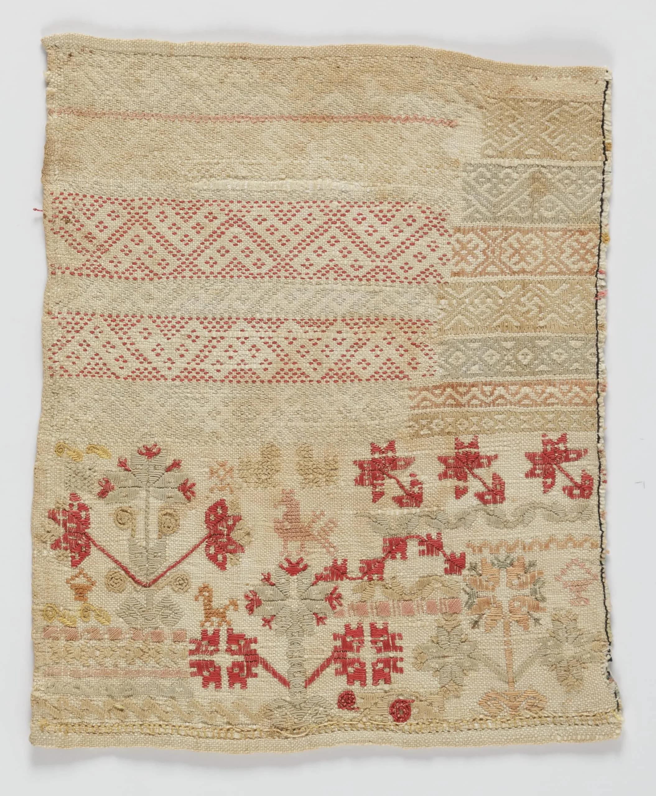 Embroidered textile sampler on cream woven ground, with horizontal geometric bands in red and tan thread in the upper section and scattered floral and star motifs in red, green, and yellow below