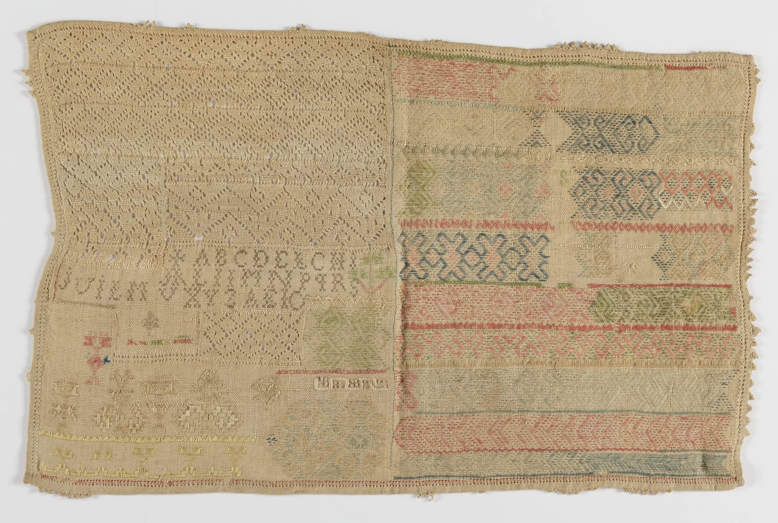 Embroidered linen sampler with pulled-thread lacework on the left half and horizontal bands of geometric cross-stitch patterns in faded pink, blue, and green on the right, with an alphabet inscription