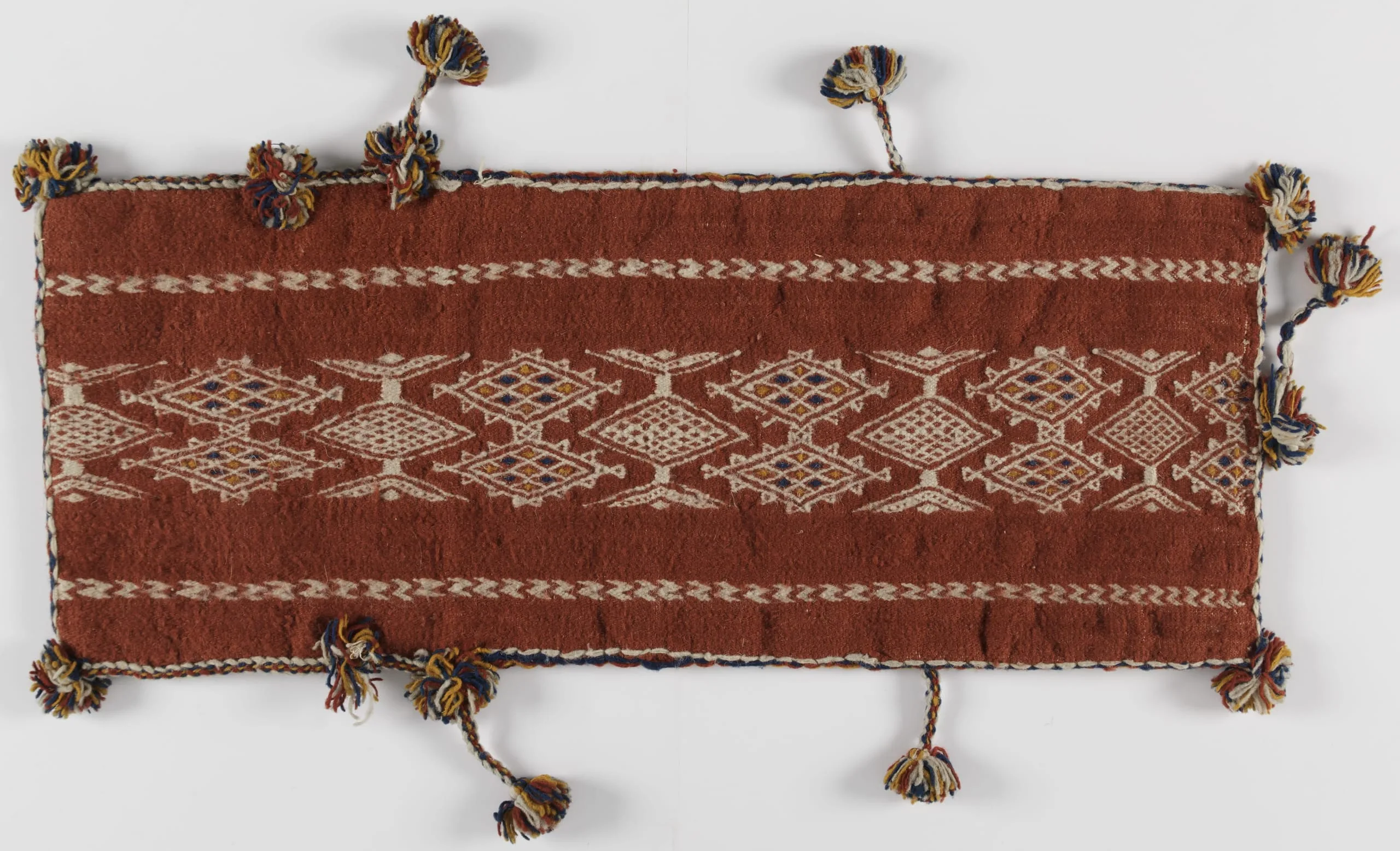 - Wool and cotton plain weave with supplementary-warp patterning and wool tassels