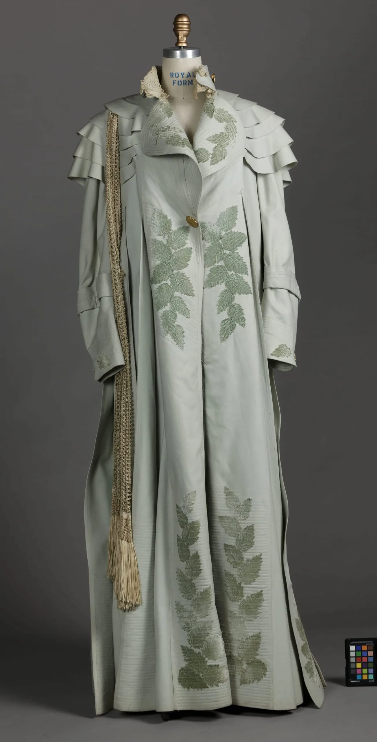 - Wool plain weave (broadcloth) with silk velvet appliqués, cotton lace, figured metallic buttons, silk thread and silk braid openwork