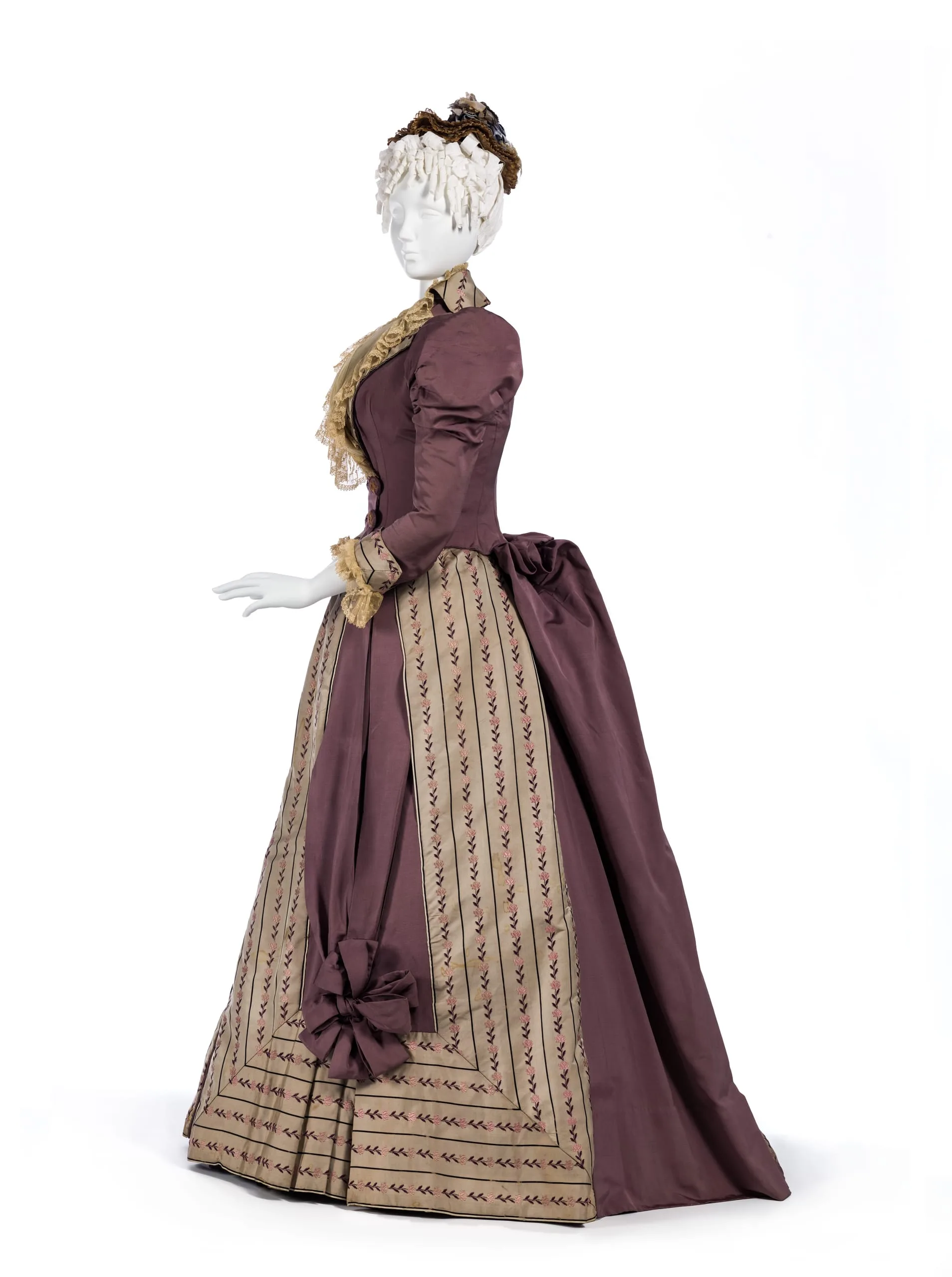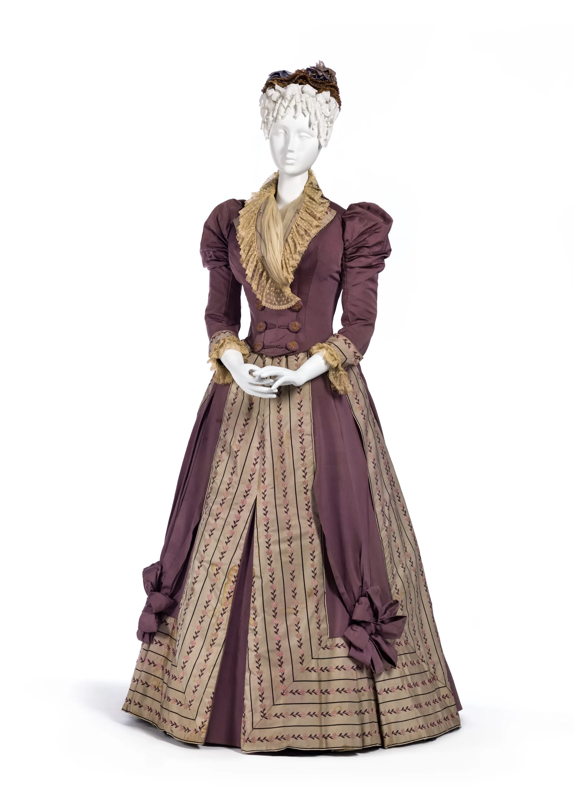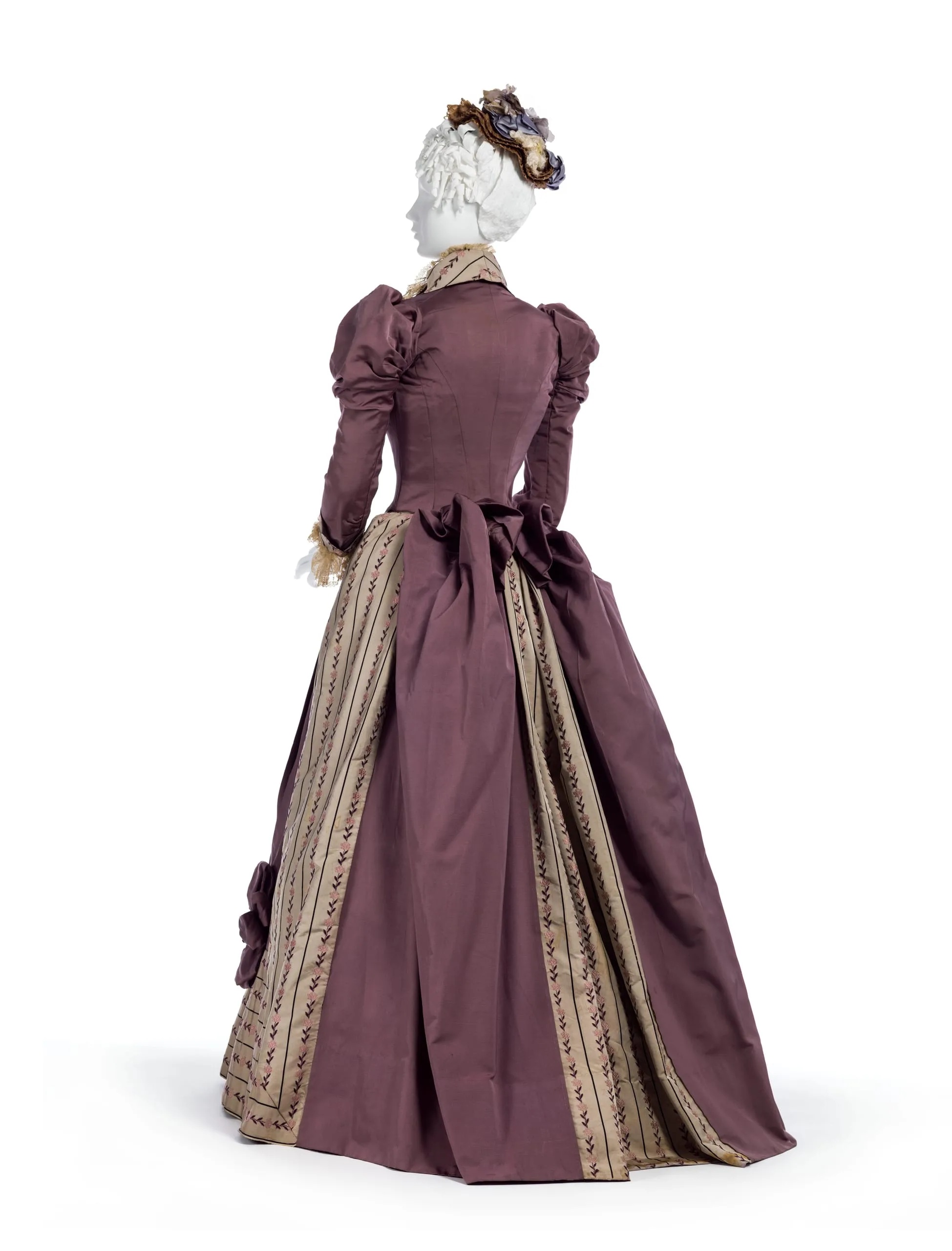 - Bodice: silk plain weave (faille) and silk twill with silk embroidery, linen lace, and silk plain weave trim; Skirt: silk plain weave (faille) and silk twill with silk embroidery