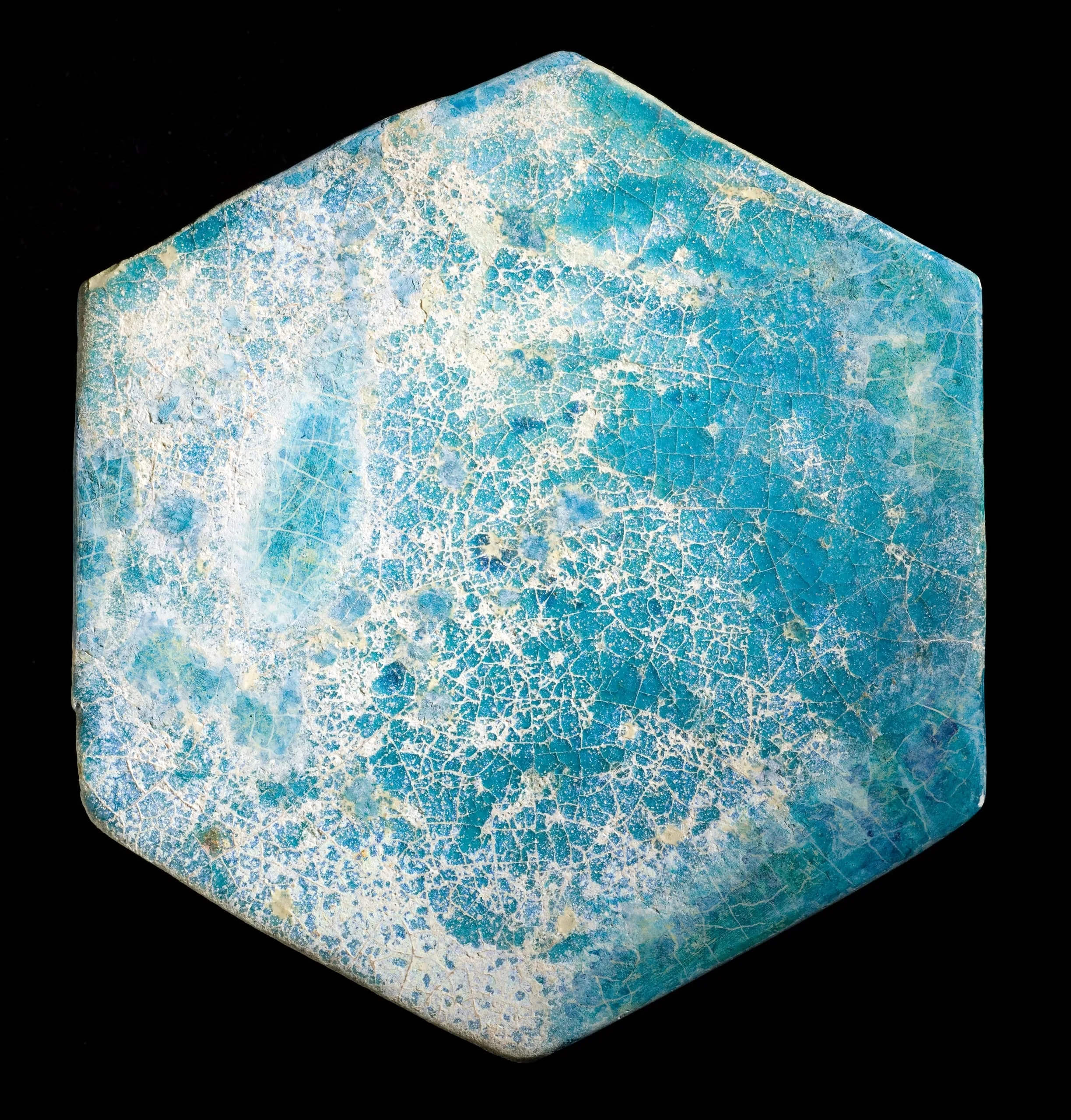 Hexagonal ceramic tile with turquoise glaze heavily crazed into cream and white web-like cracks across the surface, photographed against a black background