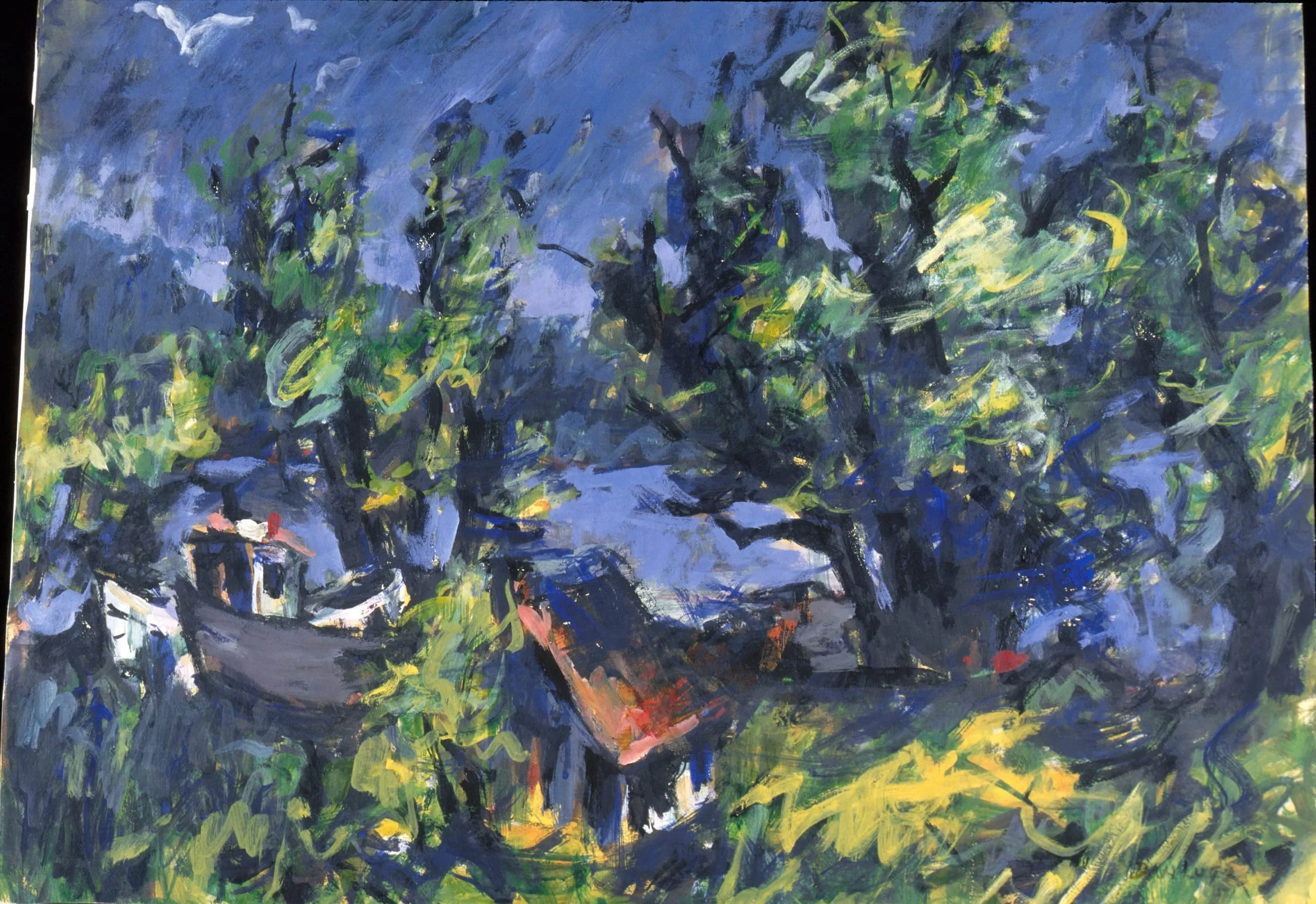 In 1940 Lutz taught at the Summer School of Painting in Saugatuck, Michigan, and returned there each summer until 1945 and then again from 1951 to 1953. Despite the identification of the locale in the title, it is insignificant, for by 1951 Lutz had all but relinquished representational subject matter. In Kalamazoo Lake Lutz moved closer to pure abstraction than he would ever again. At first glance the painting might be categorized as abstract expressionist. A house and lake become discernible only after long and careful observation. Lutz’s brush, filled with opaque paint, charged the painting with an organic vitality. The highly potent palette of blacks, bluish grays, white, greens, and yellows-almost garish in effect-was essential to the artist’s enthusiastic response to nature.