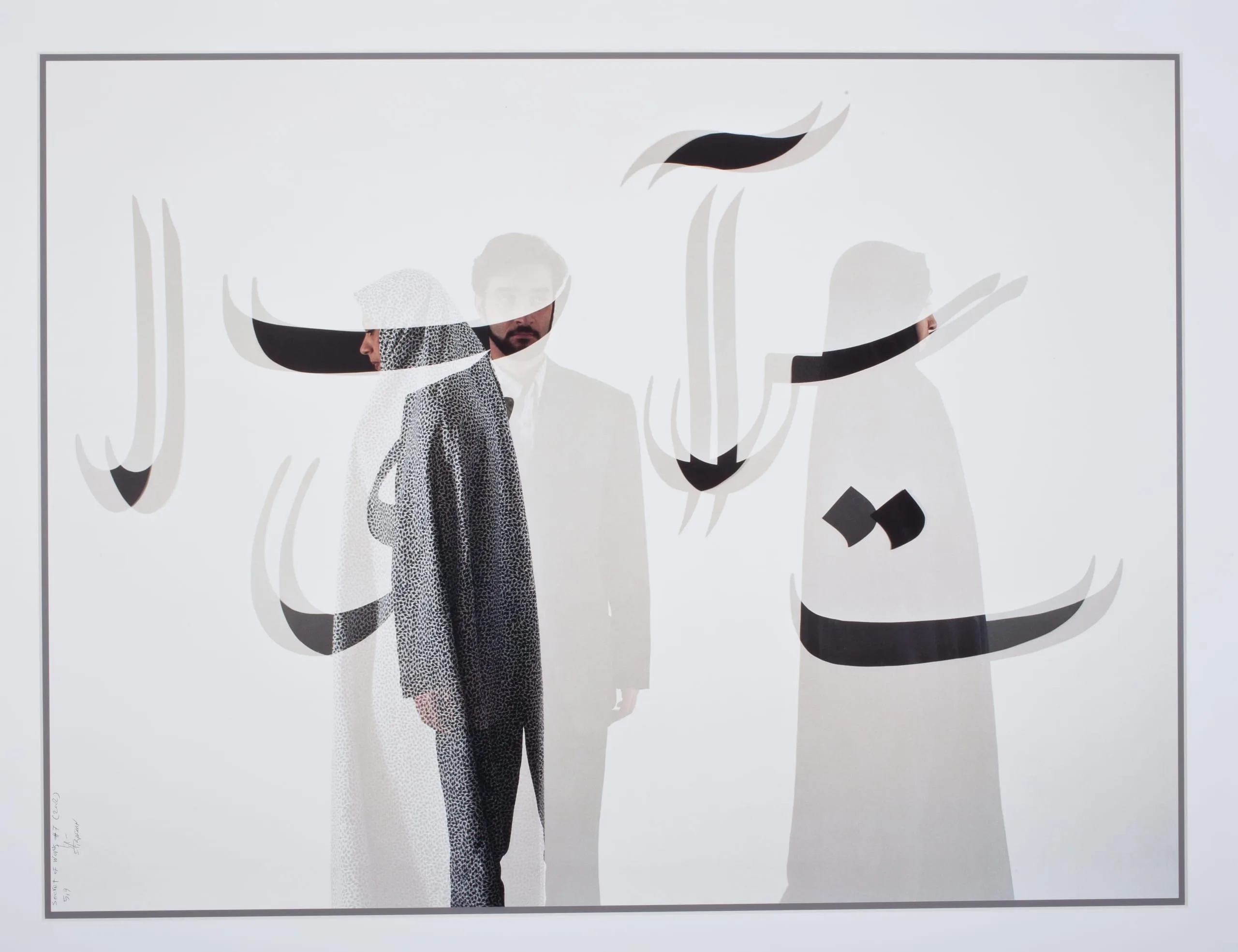Sadegh Tirafkan was one of Iran's best known contemporary artists and his art was shaped in part by the circumstances of his early life. Born in Iraq and forcibly repatriated to Iran in 1971, as a teenager Tirafkan joined the bassiji or youth militia and fought in the war against Iraq; he was one of the boys sent into battle with a plastic key to Paradise around his neck and little else. Unlike most of his young comrades he survived the war and went on to study photography at the University of Fine Arts, Tehran. Since the late 1980s, he has participated in numerous solo exhibitions and international group shows. Through his photographs, videos, and wire sculptures, Tirafkan, like other Iranian artists of his generation, captures a society caught between the present and the past. Perhaps because Tirafkan learned about loss at an early age, his work often emphasizes suffering and isolation rather than political commentary. This is especially true of his 2002 series ‘Secret of Words.’ Here, his subjects project the stories of their lives through their faces, which they allow us, the viewers, to read. The interrelationship between their physically expressed stories and unspoken words is revealed through the letters behind the figures or superimposed on top of them. The repetitive letters are meant to suggest something akin to our A, B, Cs.
