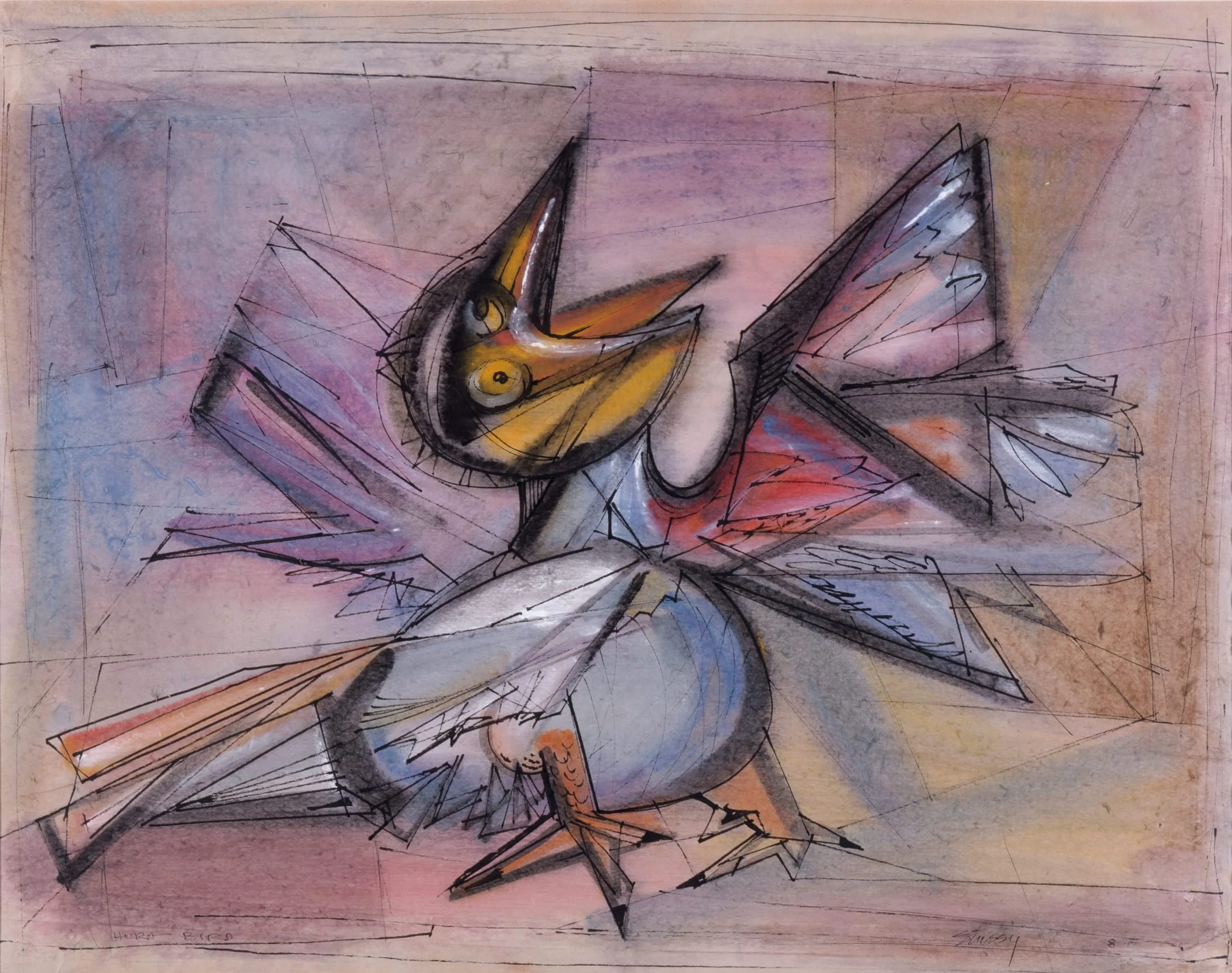 Hurt Bird recalls the art of ALBERT PINKHAM RYDER and Morris Graves (born 1910), two romantic artists, who, like Stussy, painted dead or dying birds and used the evocative formal elements of line and color. Stussy was as much a draftsman as a painter, having become interested in calligraphy as early as 1947, and line dominates many of his paintings. Moreover, when he used color, as in Hurt Bird, it is secondary to the graphic elements. In this watercolor the palette is limited and was applied in delicate tints, the lines and washes forming transparent, intersecting planes.