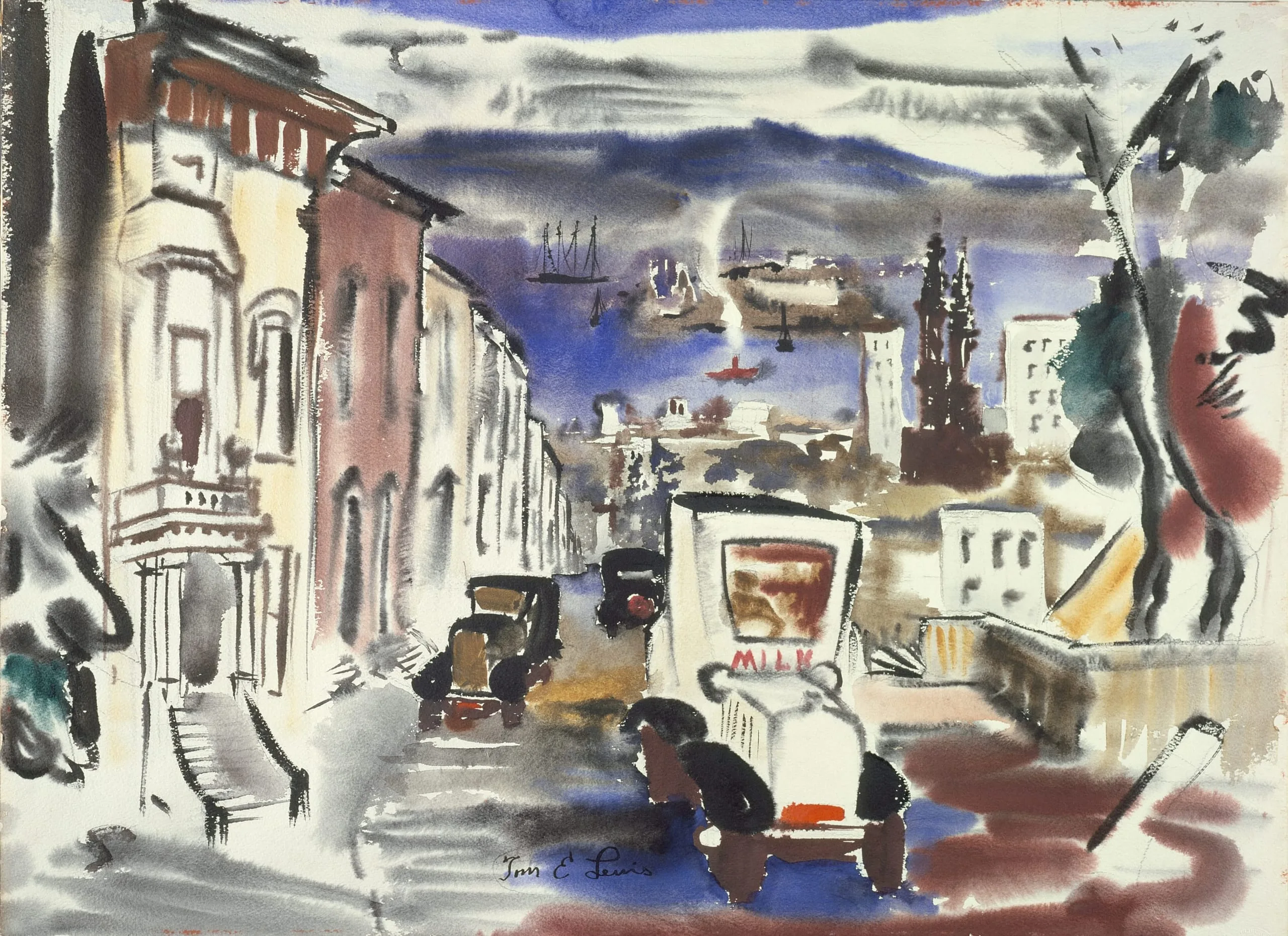 During the 1930s Lewis painted several Victorian houses in California settings. His fascination with picturesque buildings stemmed no doubt from his early aspirations to be an architect. The crowded San Francisco streets with rows of houses with steep front steps were particularly appealing and might have been one reason for his move to that city, where he lived on Telegraph Hill. In this watercolor Lewis utilized an open view, painting from high atop a hill, looking down toward the bay and Alcatraz Island. From this position he was able to dwell on more than just the houses, handsomely capturing the character of the Bay Area. The entire composition is presented in cool colors with large amounts of white paper exposed or luminously appearing through thin washes. Lewis painted the scene very wet, applying one pigment over a wet wash, so that the overall effect becomes extremely soft, suggesting the hazy light and overcast skies of San Francisco.