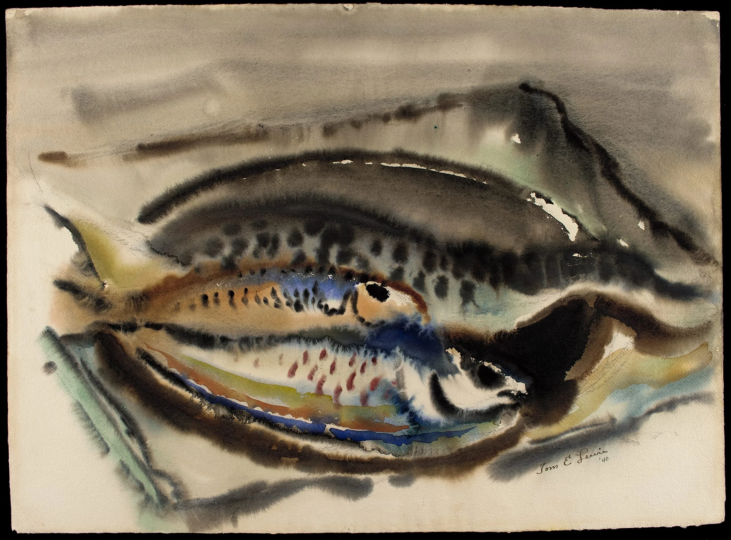 In the late nineteenth century WILLIAM M. CHASE glorified the glistening, pearly scales of fish in numerous still-life paintings. In this watercolor Lewis likewise extols the moist, opalescent surface of the fish by introducing different colors into small areas so that the fish seem to sparkle iridescently.