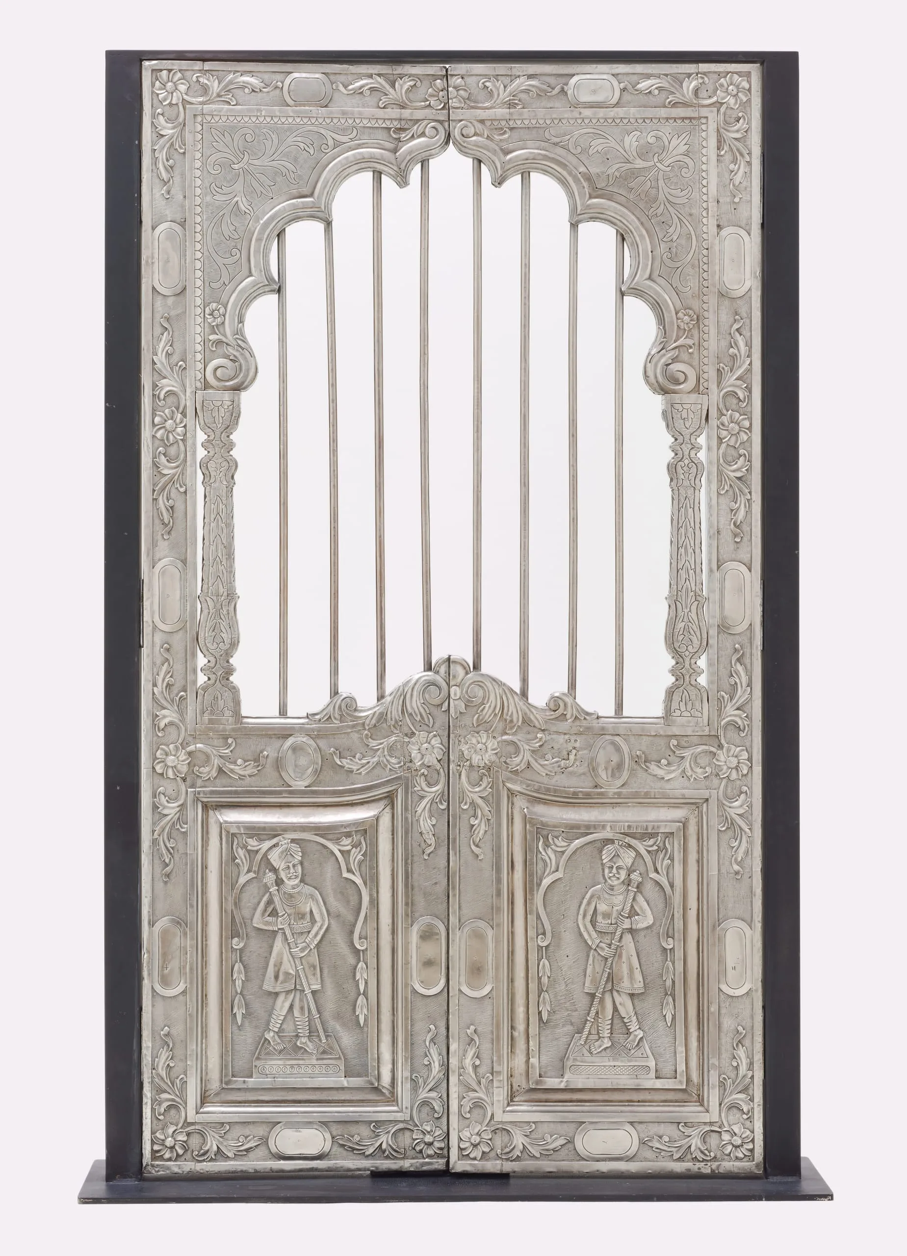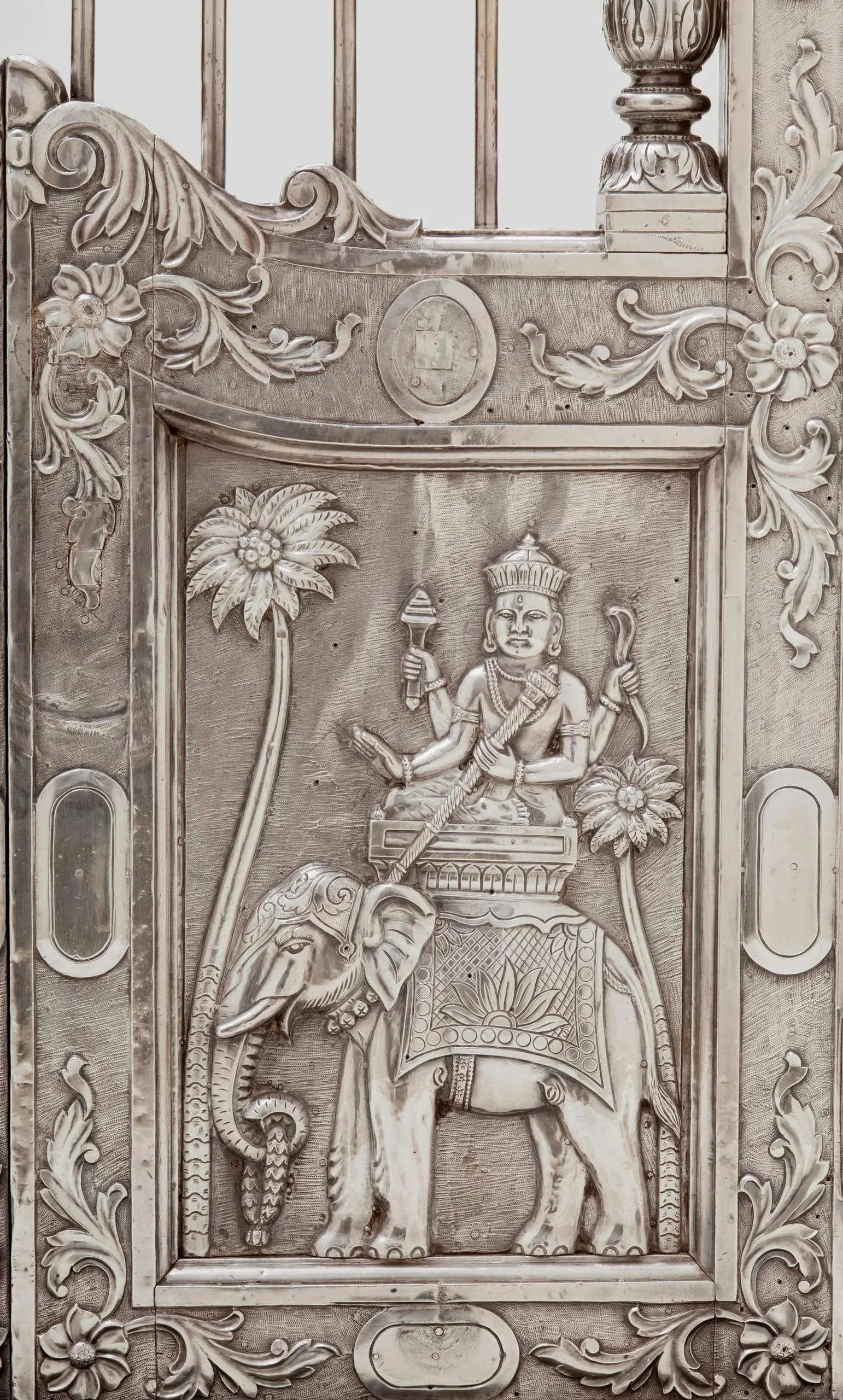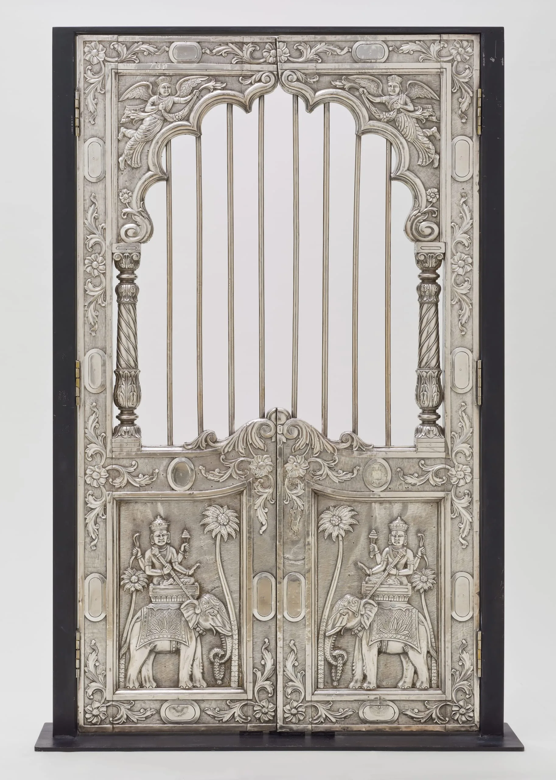 These silver shrine doors can be stylistically attributed to western India, most likely Gujarat, and date from circa 1850-1900. The doors are in the form of a cusped niche supported by baluster columns, the latter element a distinctive characteristic of northern Indian Mughal architecture and paintings from the early reign of Emperor Shah Jahan (r. 1628-58) through the end of the Mughal dynasty in 1858. On the obverse, the lower panels depict the four-armed Hindu deity Indra in his auxiliary role as the Divine Regent of the East. The spandrels are graced with angel-like flying figures carrying garlands, which represent a class of semidivine divinities called vidyadharas (bearers of wisdom). On the reverse, the lower panels portray male guardians in contemporary western Indian garb, who serve to protect the sacred threshold and inner sanctum.