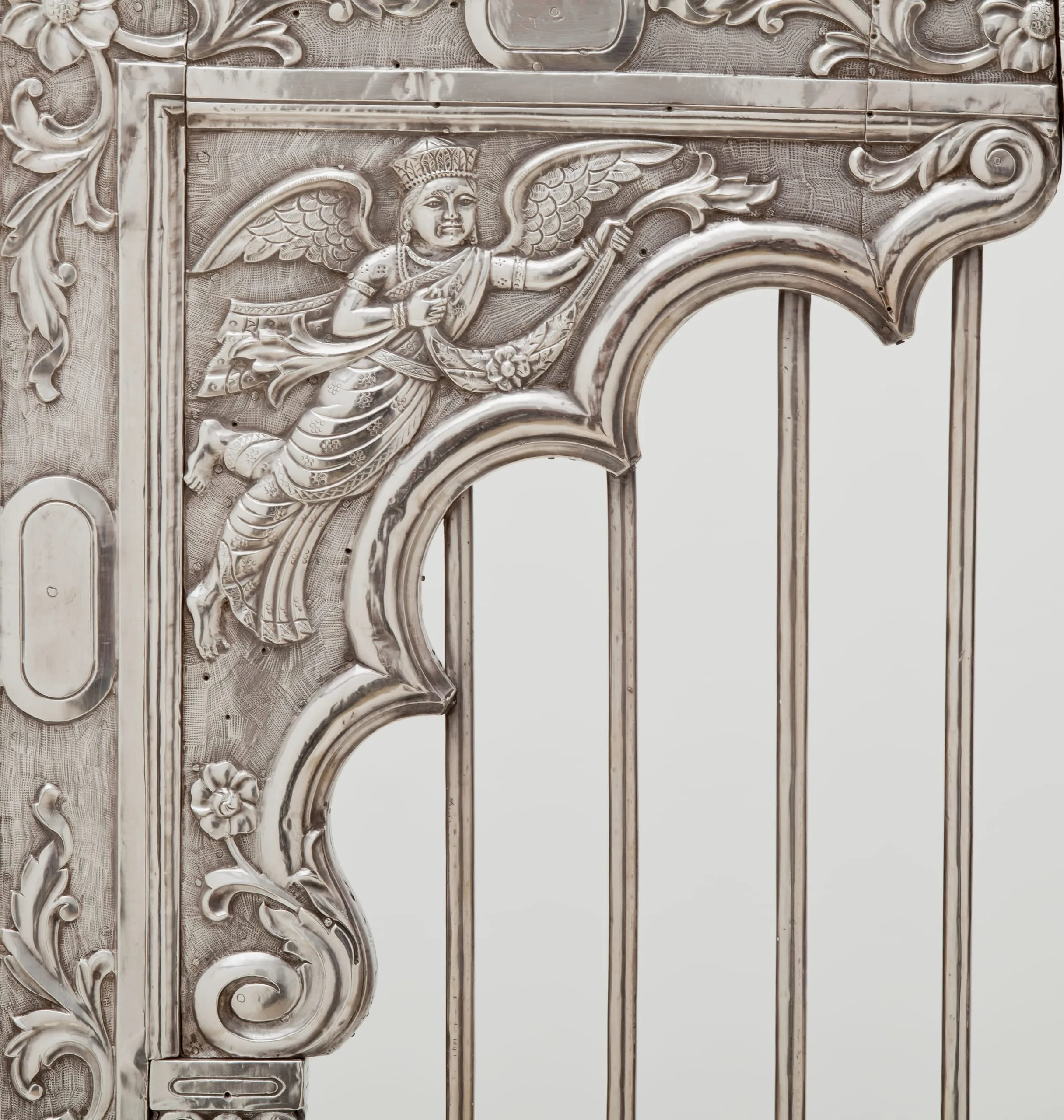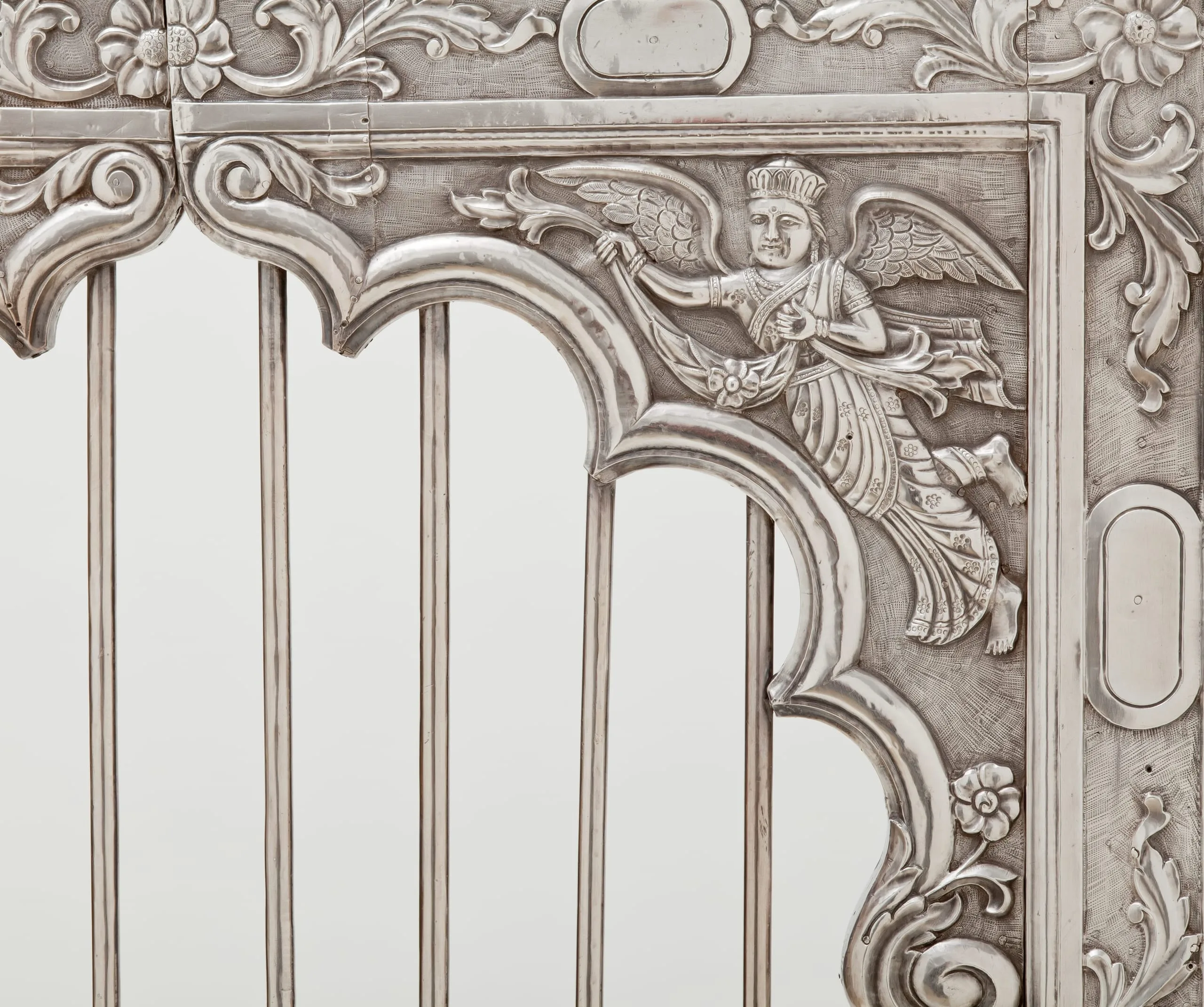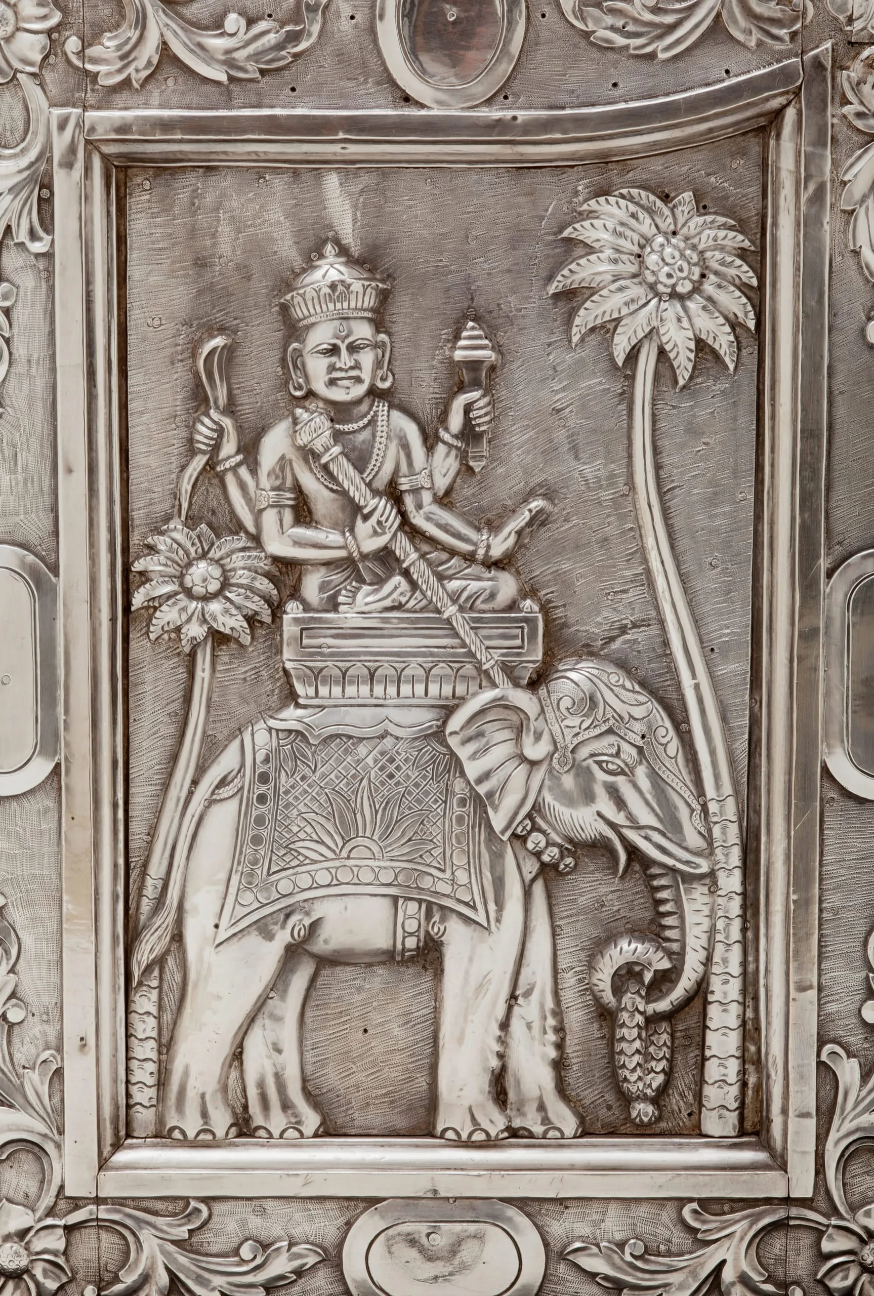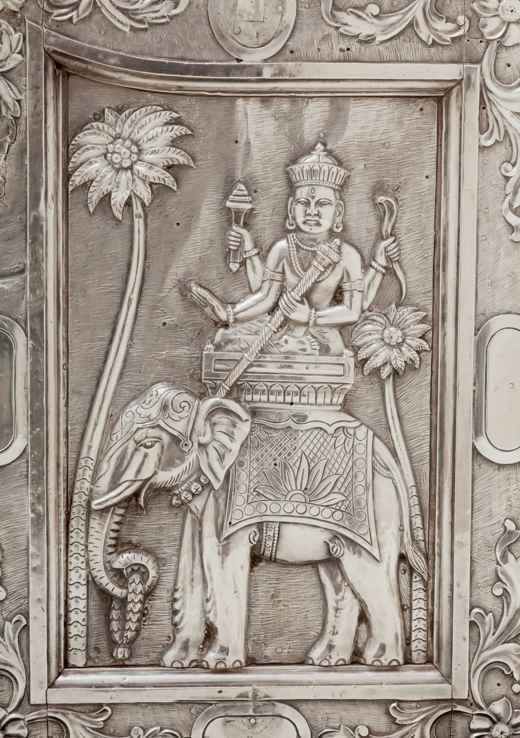 These silver shrine doors can be stylistically attributed to western India, most likely Gujarat, and date from circa 1850-1900. The doors are in the form of a cusped niche supported by baluster columns, the latter element a distinctive characteristic of northern Indian Mughal architecture and paintings from the early reign of Emperor Shah Jahan (r. 1628-58) through the end of the Mughal dynasty in 1858. On the obverse, the lower panels depict the four-armed Hindu deity Indra in his auxiliary role as the Divine Regent of the East. The spandrels are graced with angel-like flying figures carrying garlands, which represent a class of semidivine divinities called vidyadharas (bearers of wisdom). On the reverse, the lower panels portray male guardians in contemporary western Indian garb, who serve to protect the sacred threshold and inner sanctum.