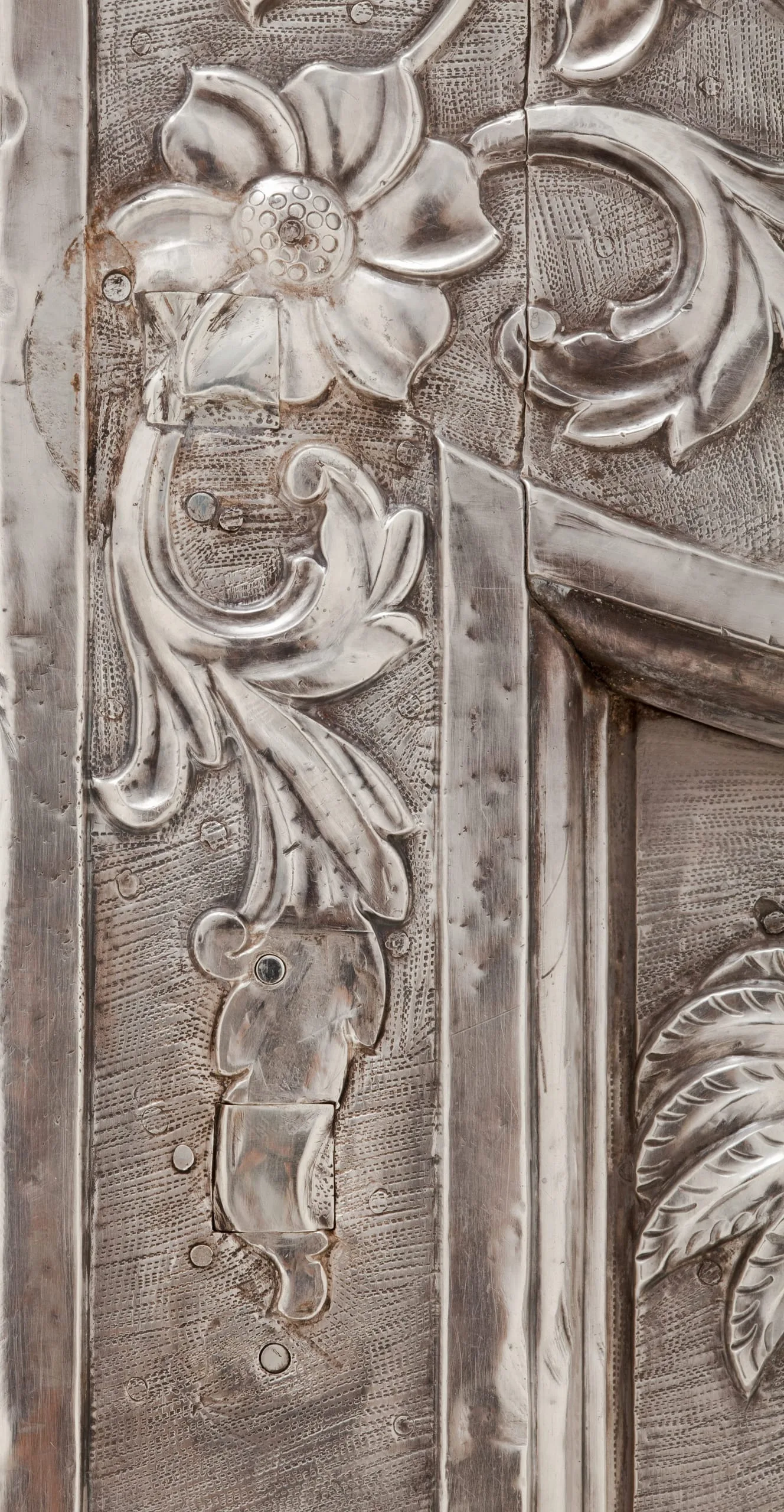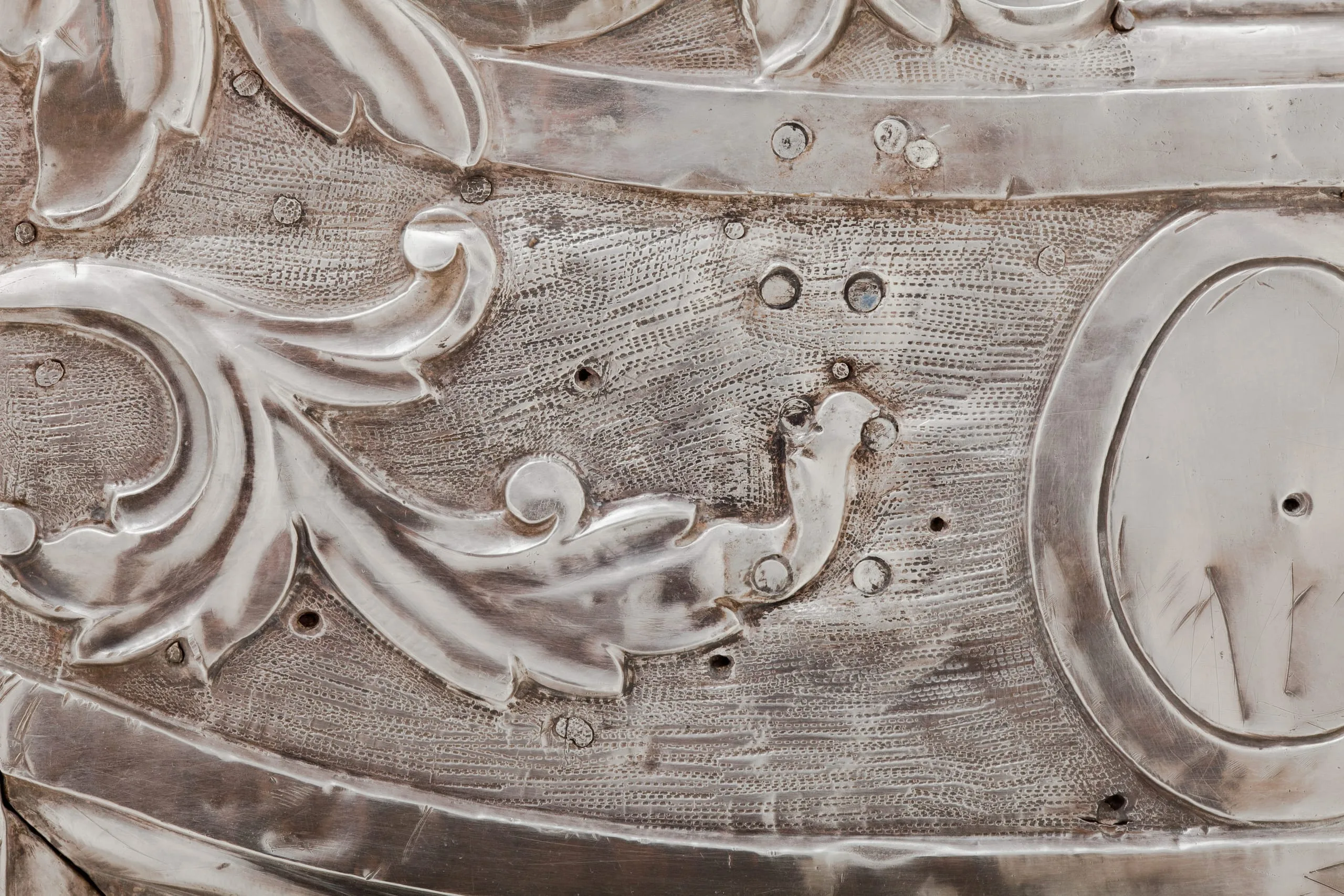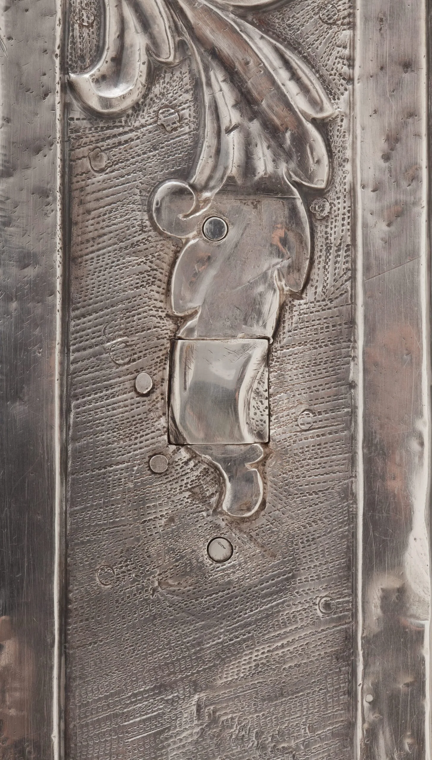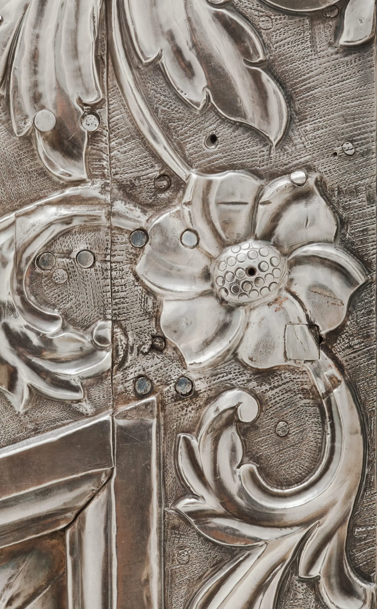 - Repoussé silver sheet over wood