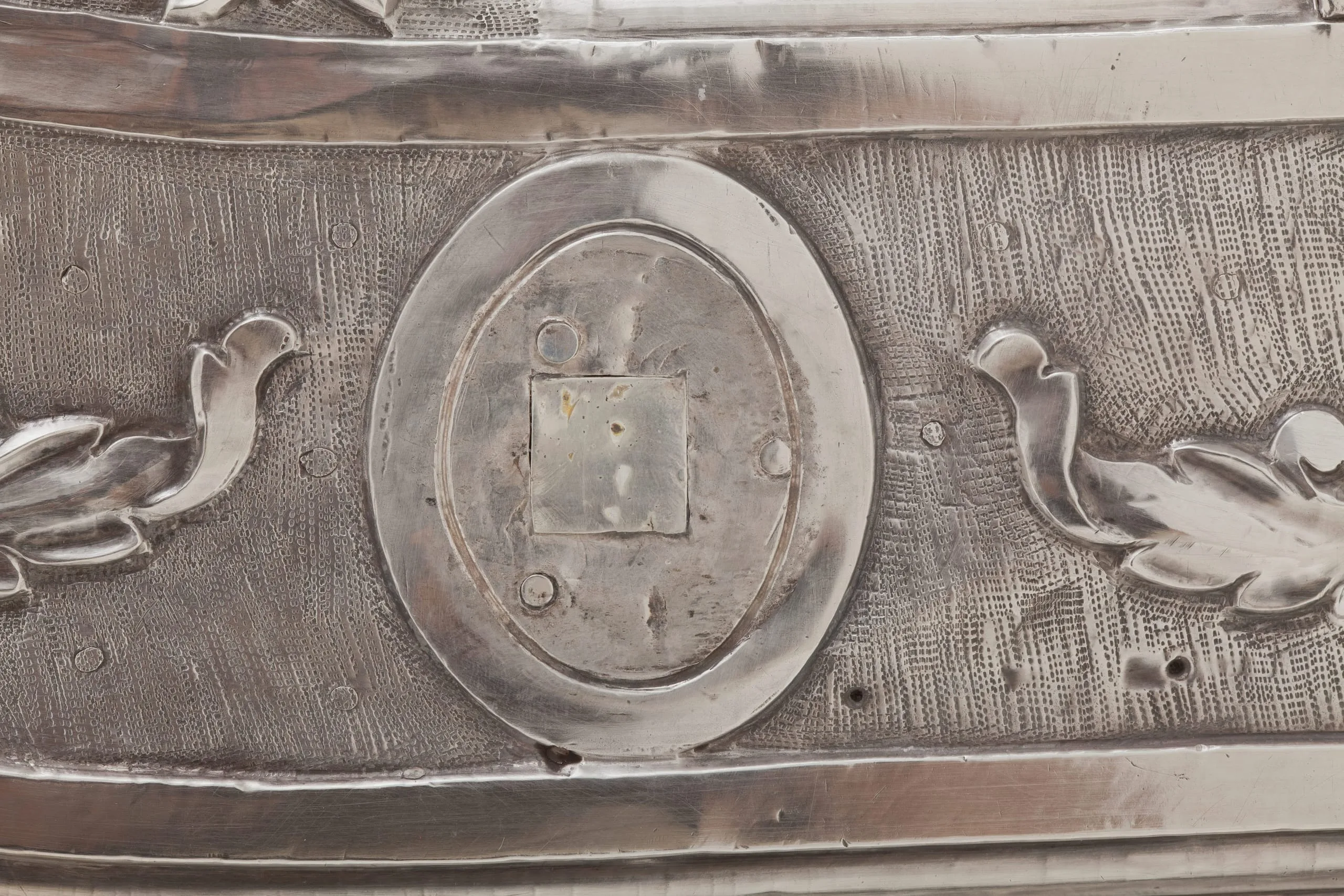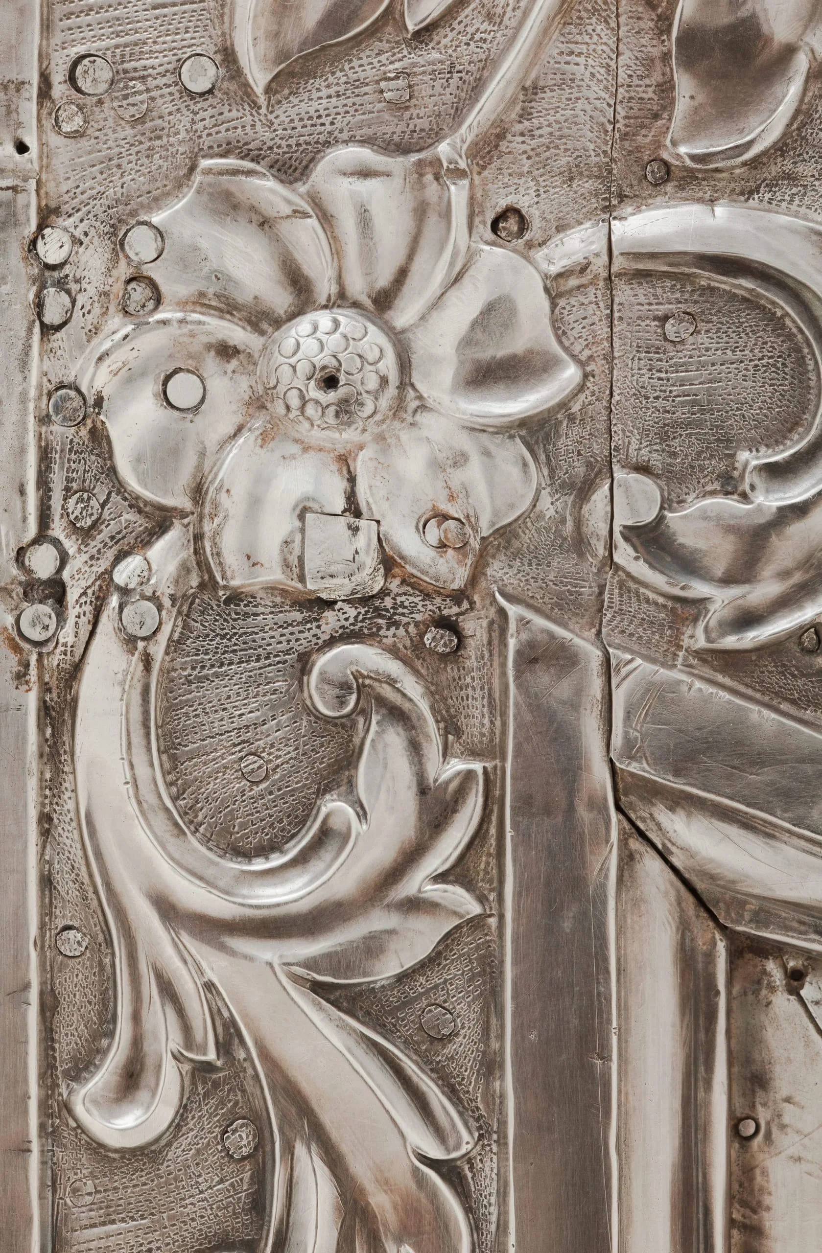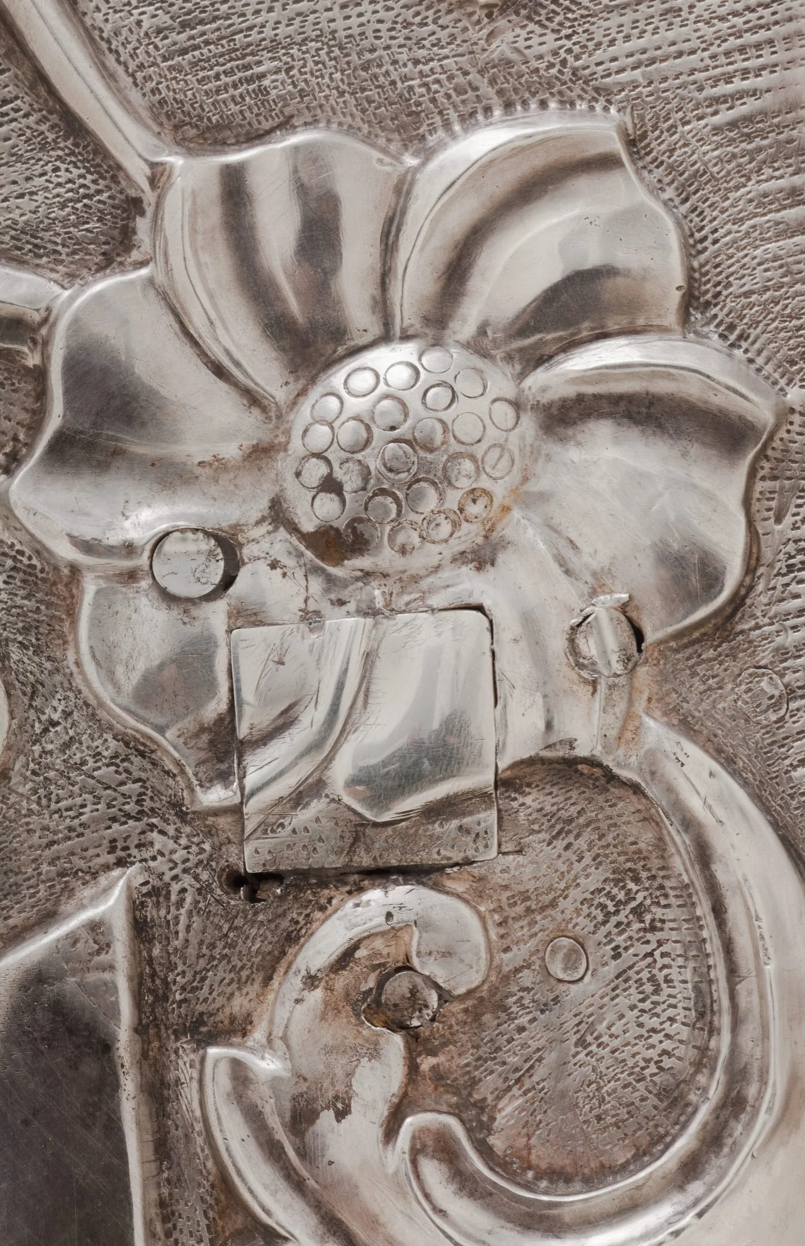 - Repoussé silver sheet over wood