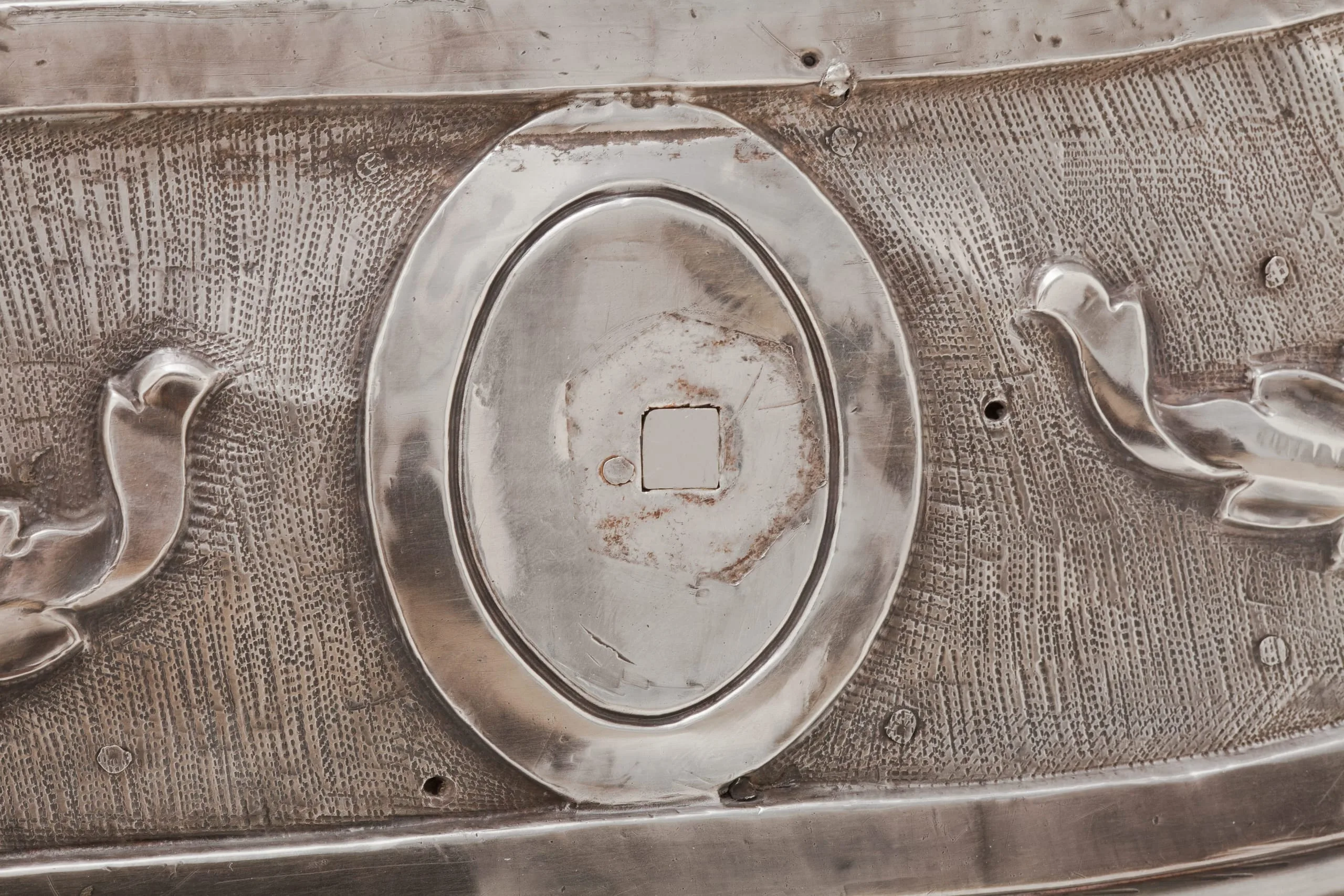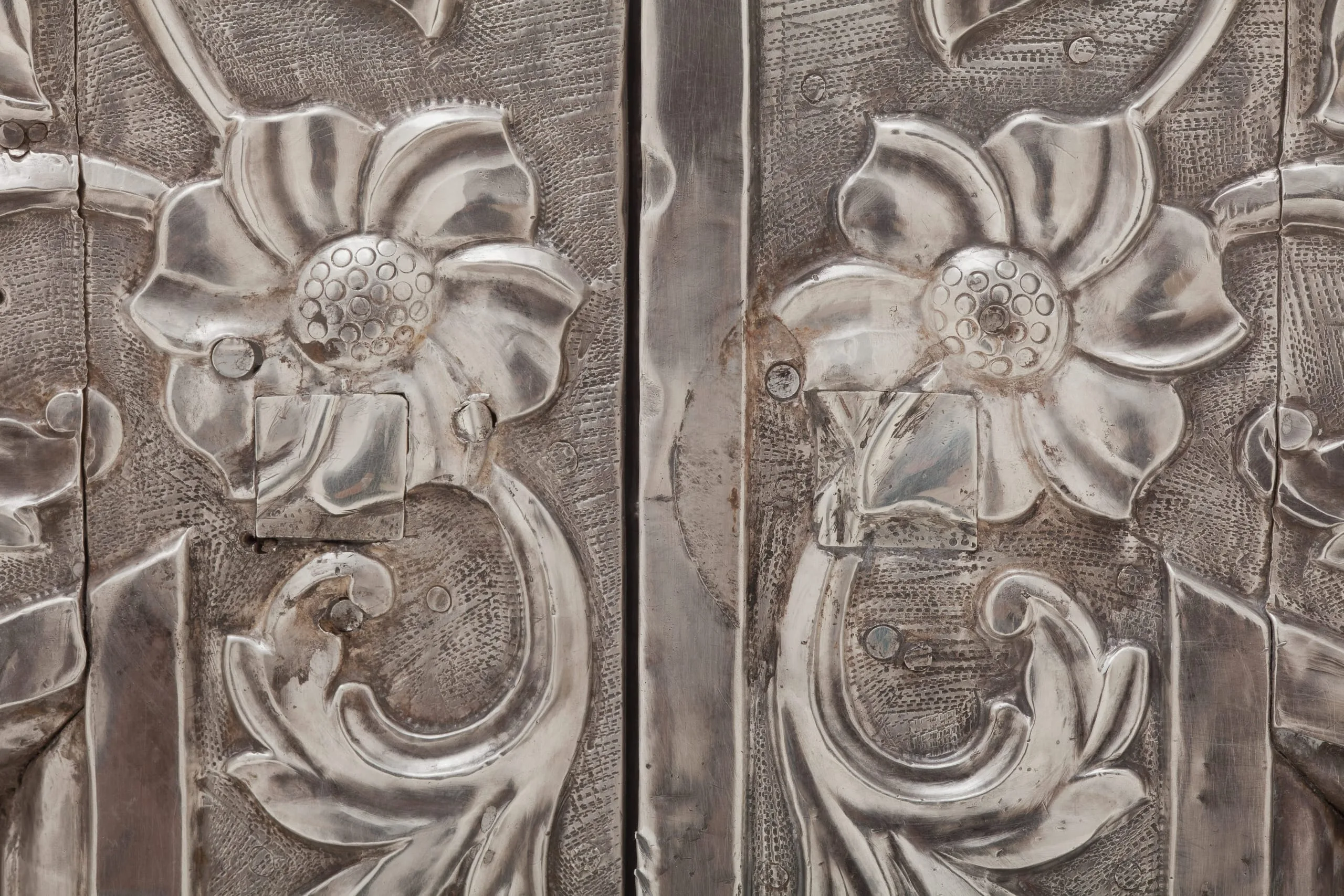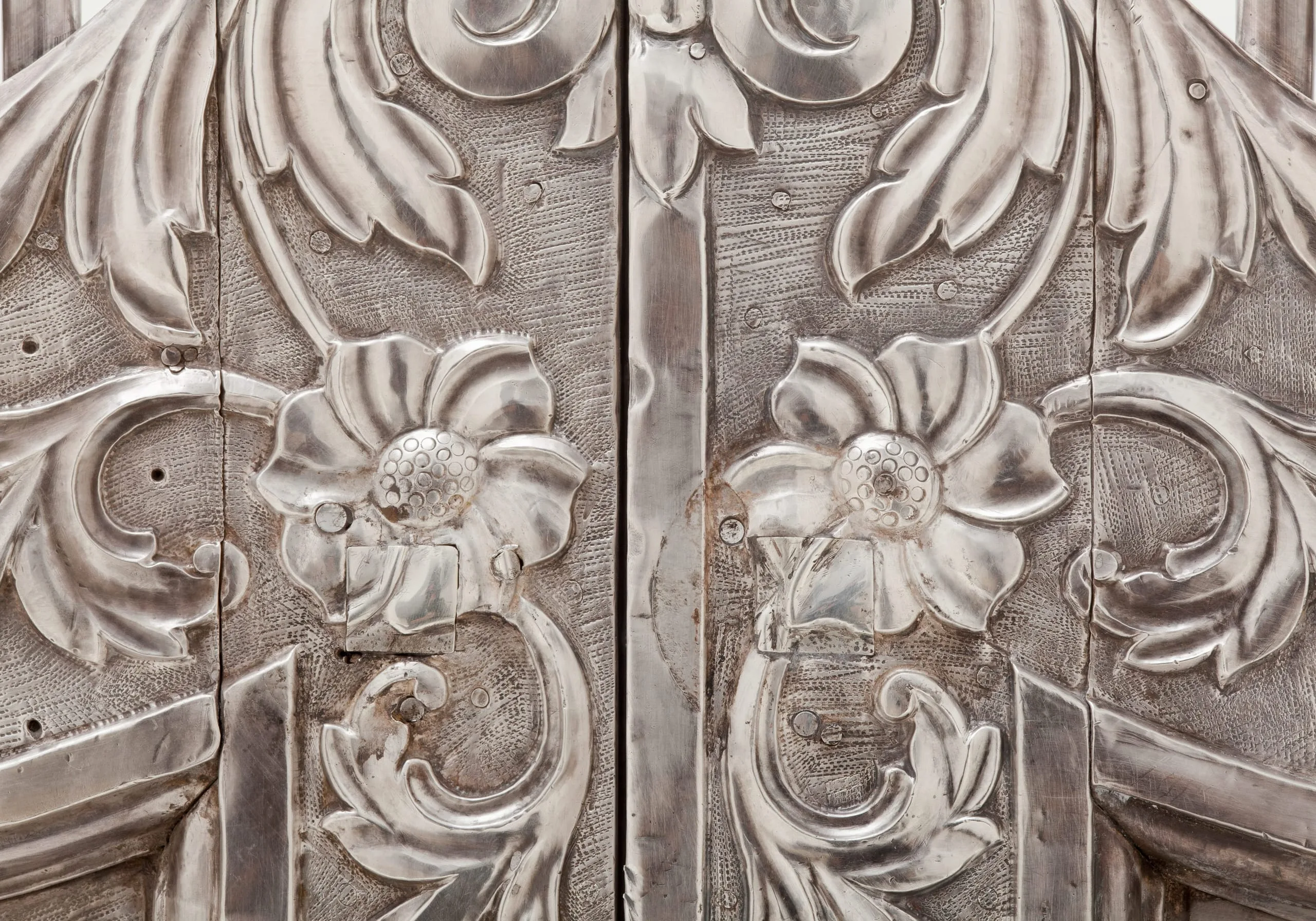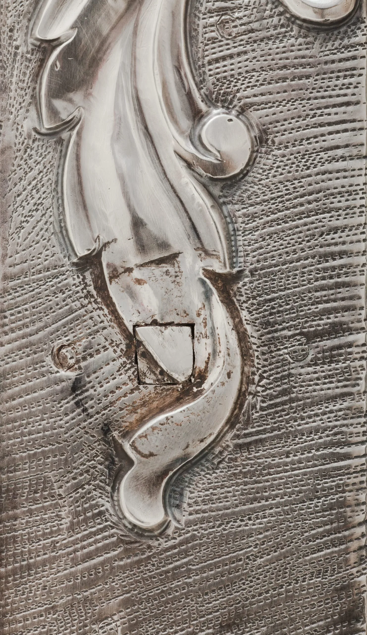 - Repoussé silver sheet over wood