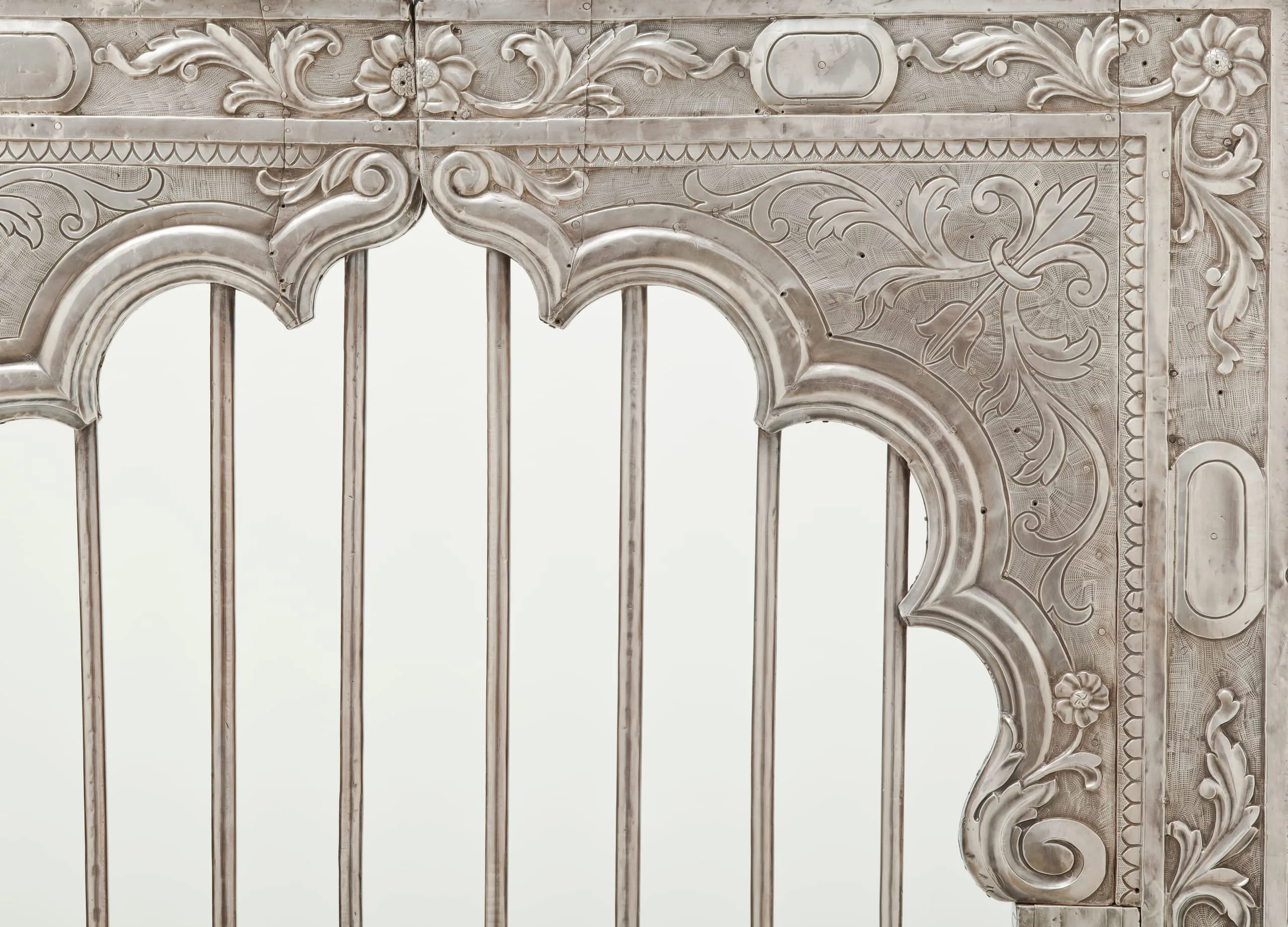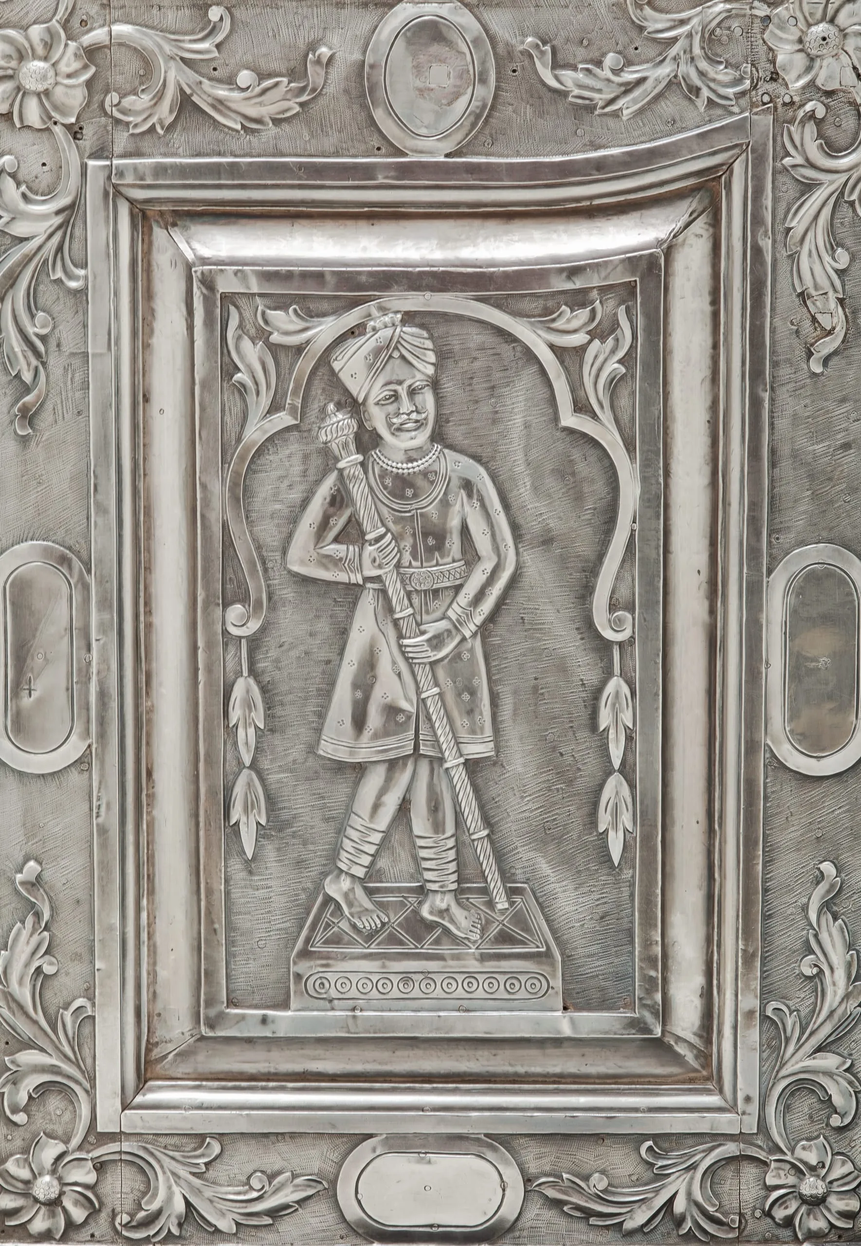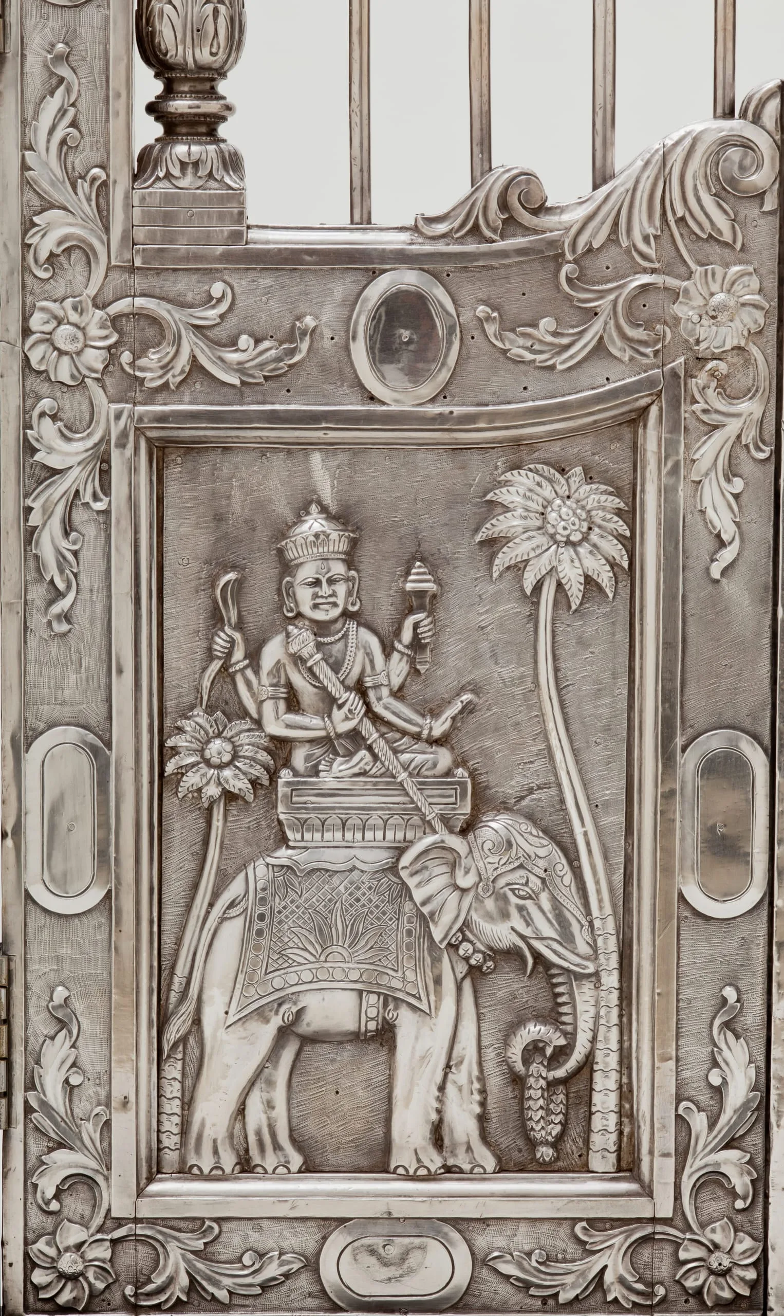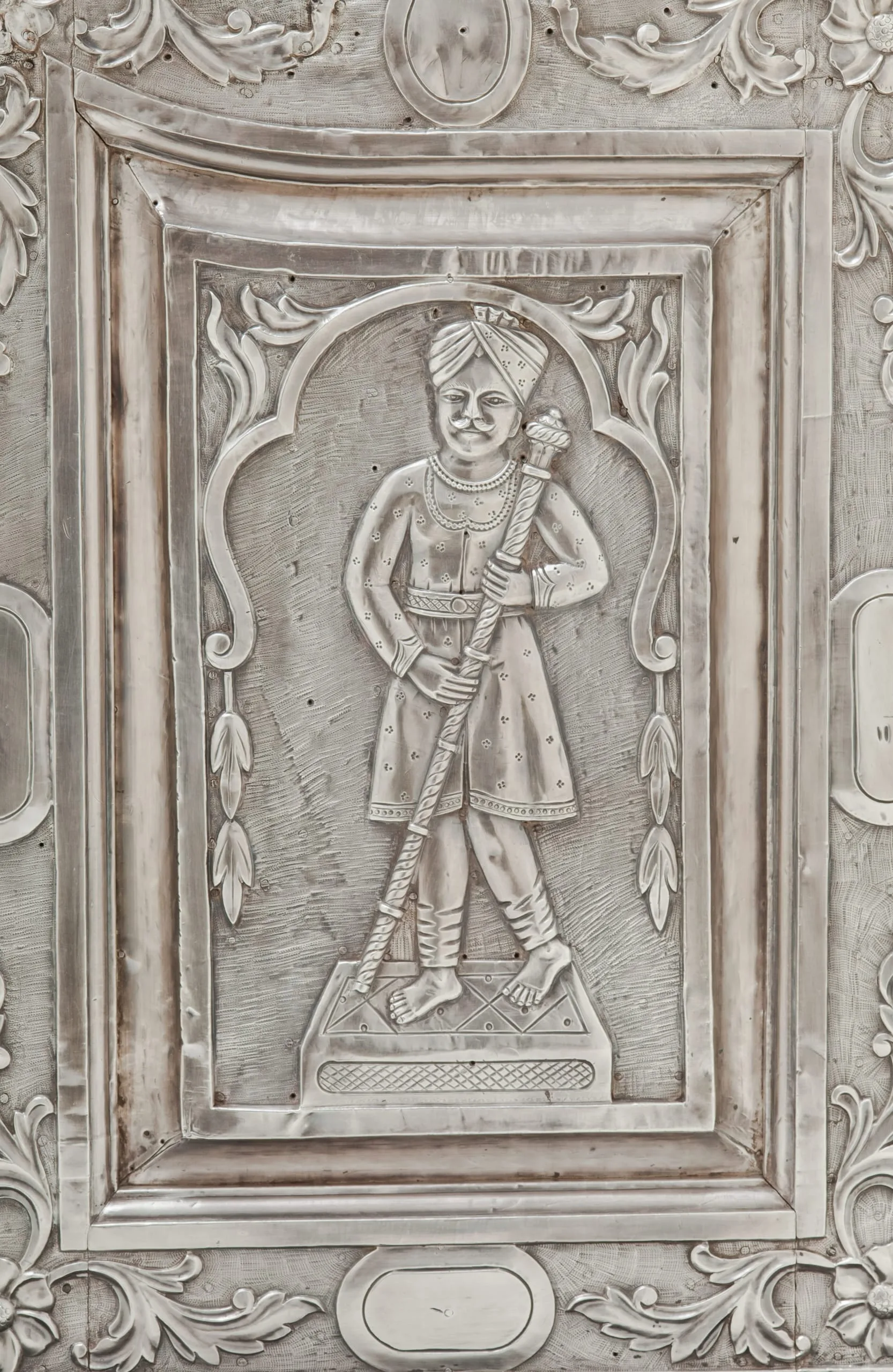 Silver shrine portals can be found throughout South Asia. Made of repoussé silver sheet over wood, they are a well-known, albeit little studied, feature of later South Asian religious and palatial architecture. They were created out of a shared artistic tradition, rather than a particular religious affiliation, as silver shrine portals are found at sites sacred to various sects of Hinduism, Jainism, Sikhism, and Islam. Although the medium and technique are constant, the individual portals and sets of doors are thematically differentiated according to the patron’s desires by appropriate variations in iconography and decorative motif.
