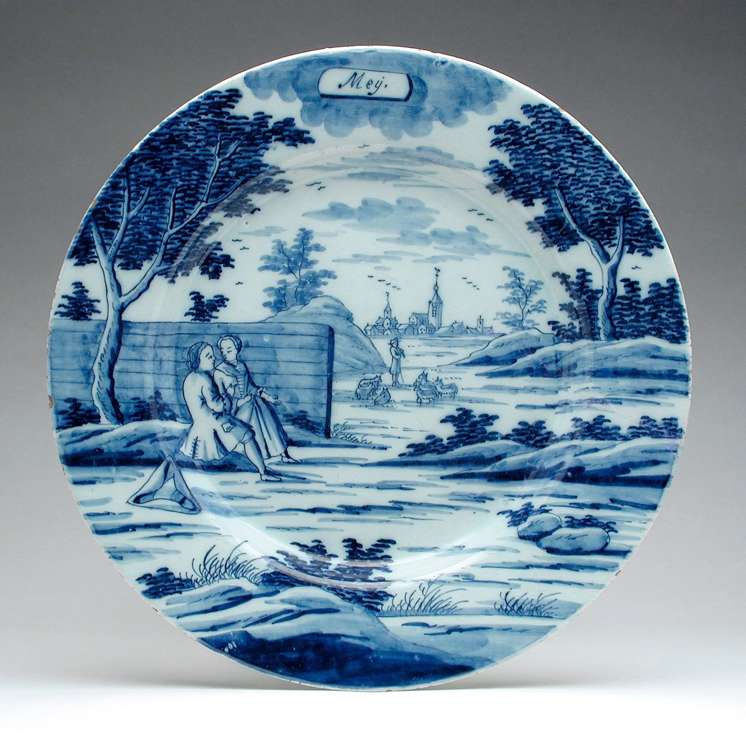 Circular Delftware plate painted in cobalt blue and white with a landscape scene, two figures seated by a fence, a shepherd with animals, and a village in the distance; labeled 'Mey.' at top