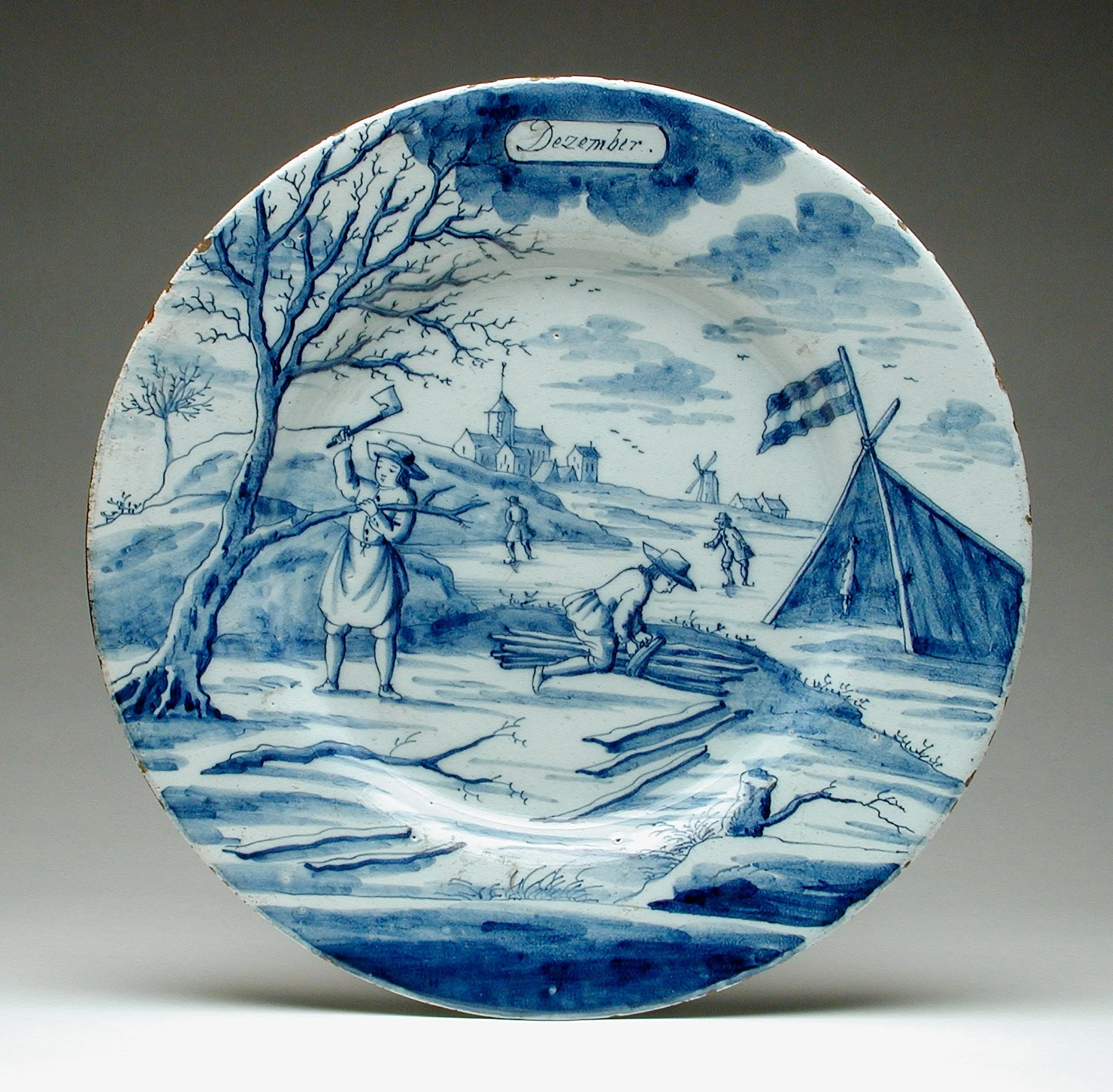Circular Delftware plate painted in cobalt blue on white glaze, depicting a December winter landscape with figures chopping and gathering wood, bare trees, a tent, and a distant church steeple