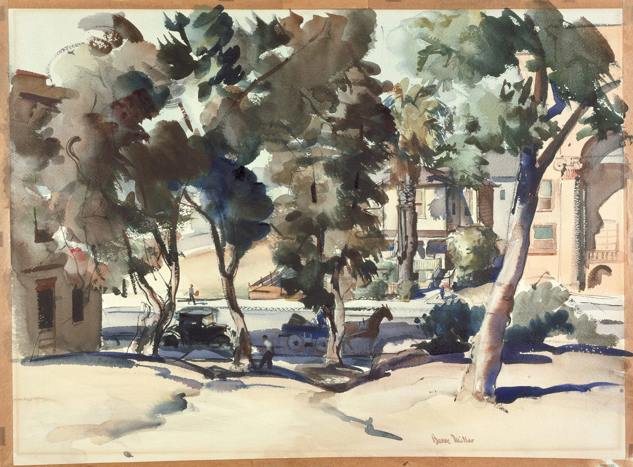 Painted on a large sheet, this watercolor depicts an ordinary street in a small California town on a sunny day. Despite the delicacy of the transparent, thin wash, Miller was able to record the dramatic contrast of cast shadows and brilliant daylight as sunlight filtered through the trees. His short, almost calligraphic strokes aptly convey the flickering light. Equally bold and modern was Miller’s color, complementary hues of intense orange, ochers and browns for the lighted objects and deep purples and bluish purples for the shadows. Of this painting Miller later noted, "It is very linear, joyous in the use of the medium but less concerned with the abstract qualities of design and color than my work following World War II."