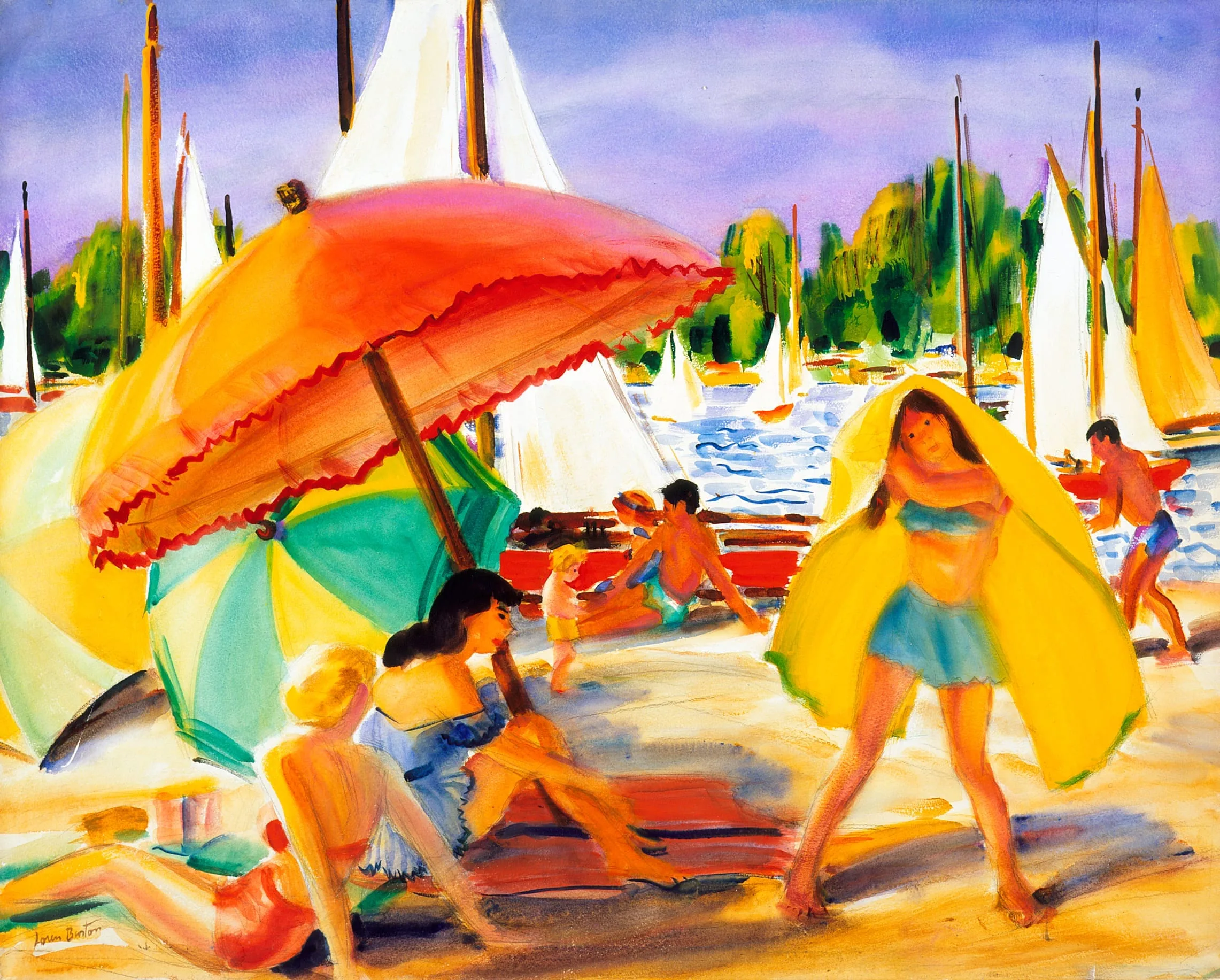 By using vivid blues and purples and exposing large areas of white paper, in Sunny Day at Balboa Barton conveys a typical California scene of bathers relaxing at the beach in the blazing sun and fresh air. In this painting her vigorous brushwork-which has been compared with that of Edouard Manet (1832-1883) in its directness-was applied dryly, and the strokes appear almost opaque.