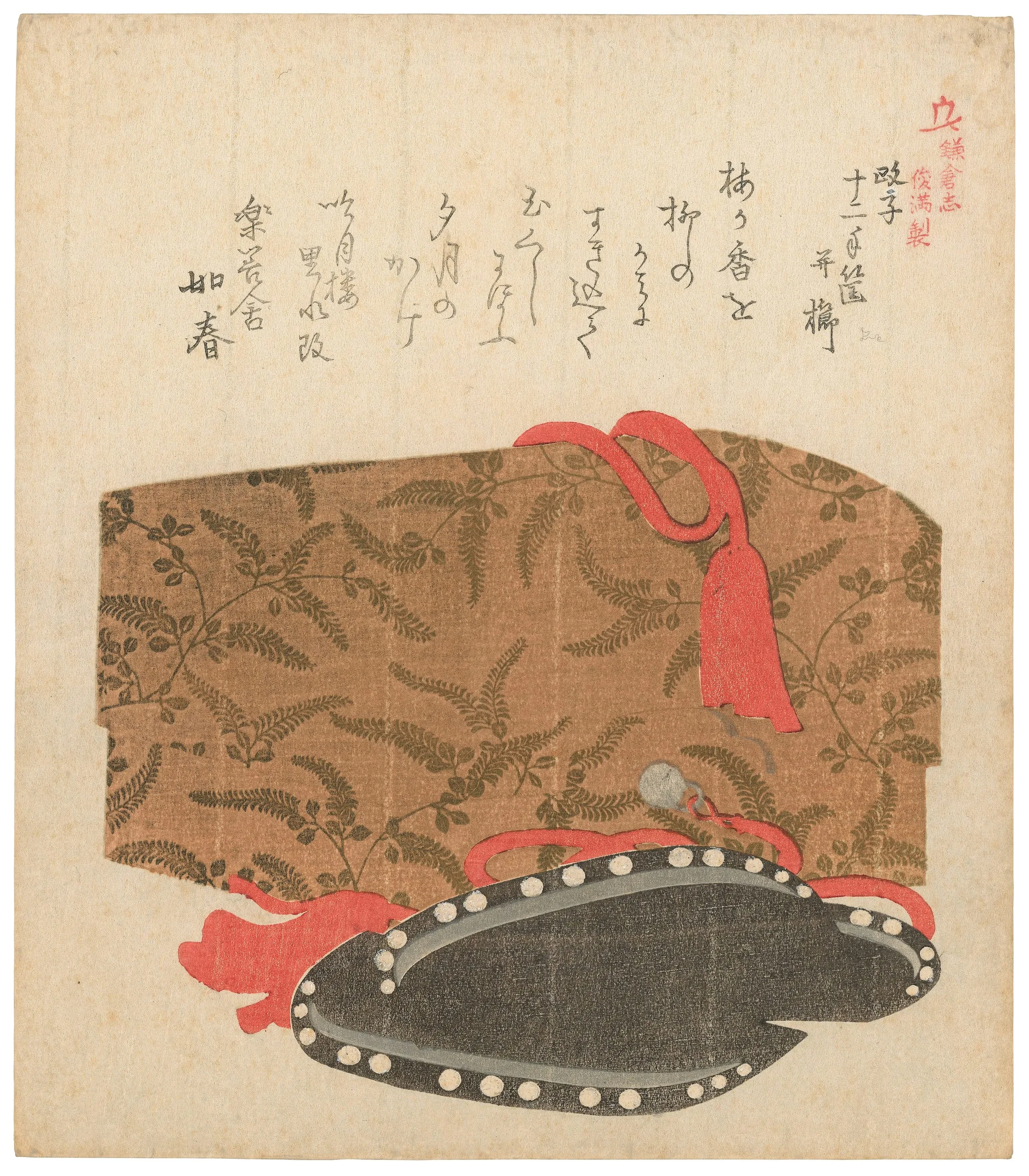 - Surimono; color woodblock print with brass, mother-of-pearl, tin, and embossing