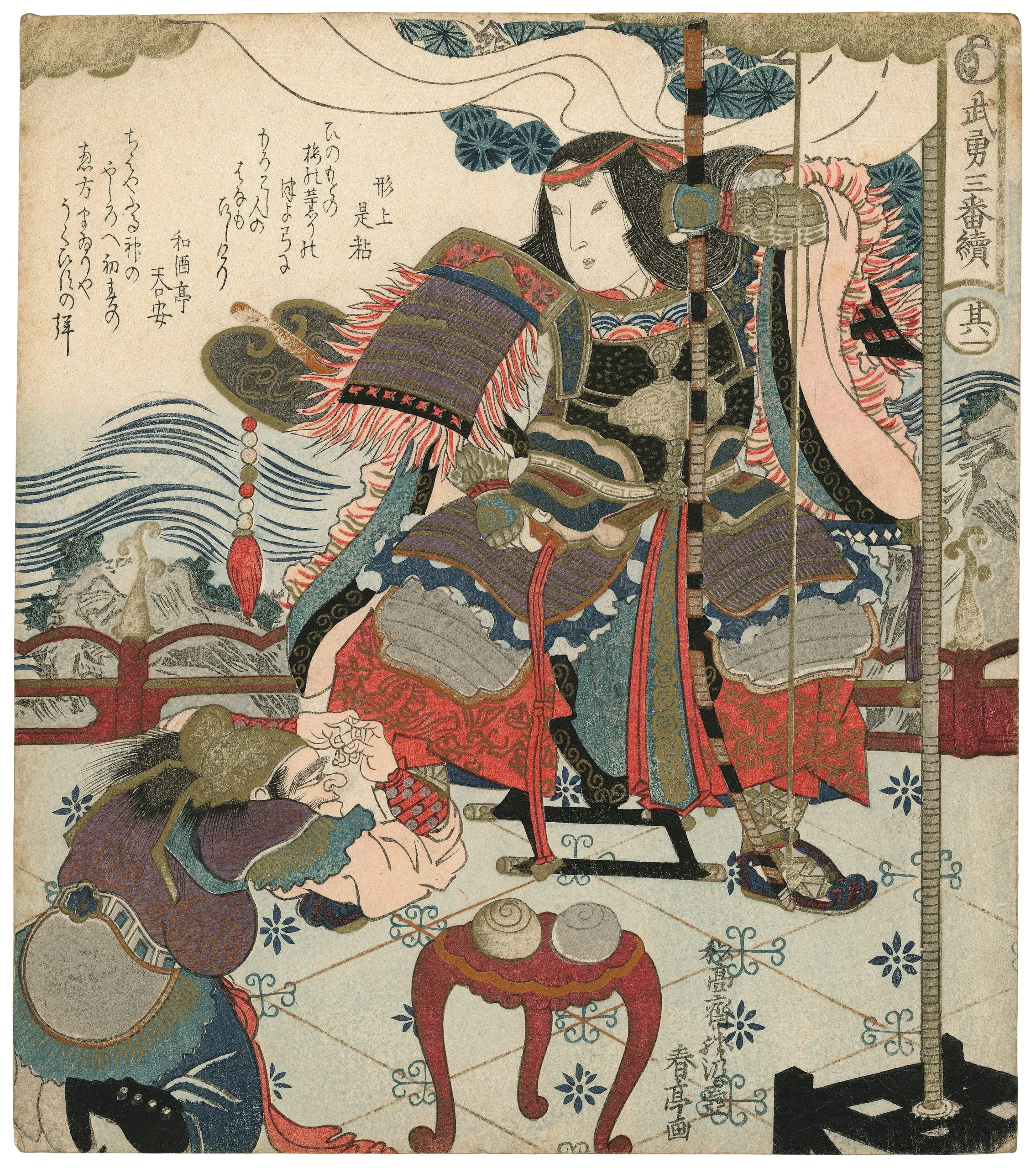 - Surimono; color woodblock print with brass, copper, tin, and embossing