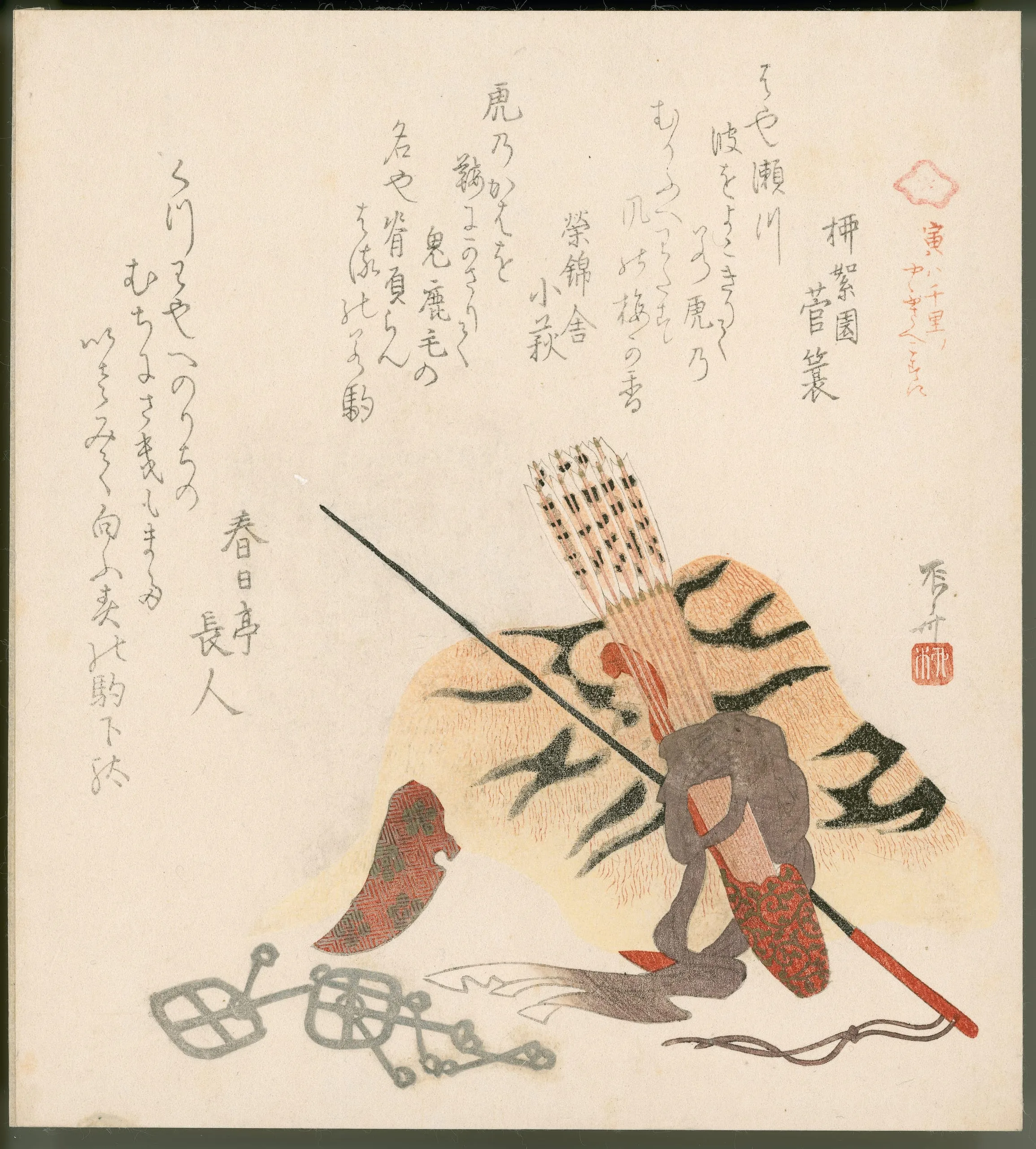 - Surimono; color woodblock print with brass and tin