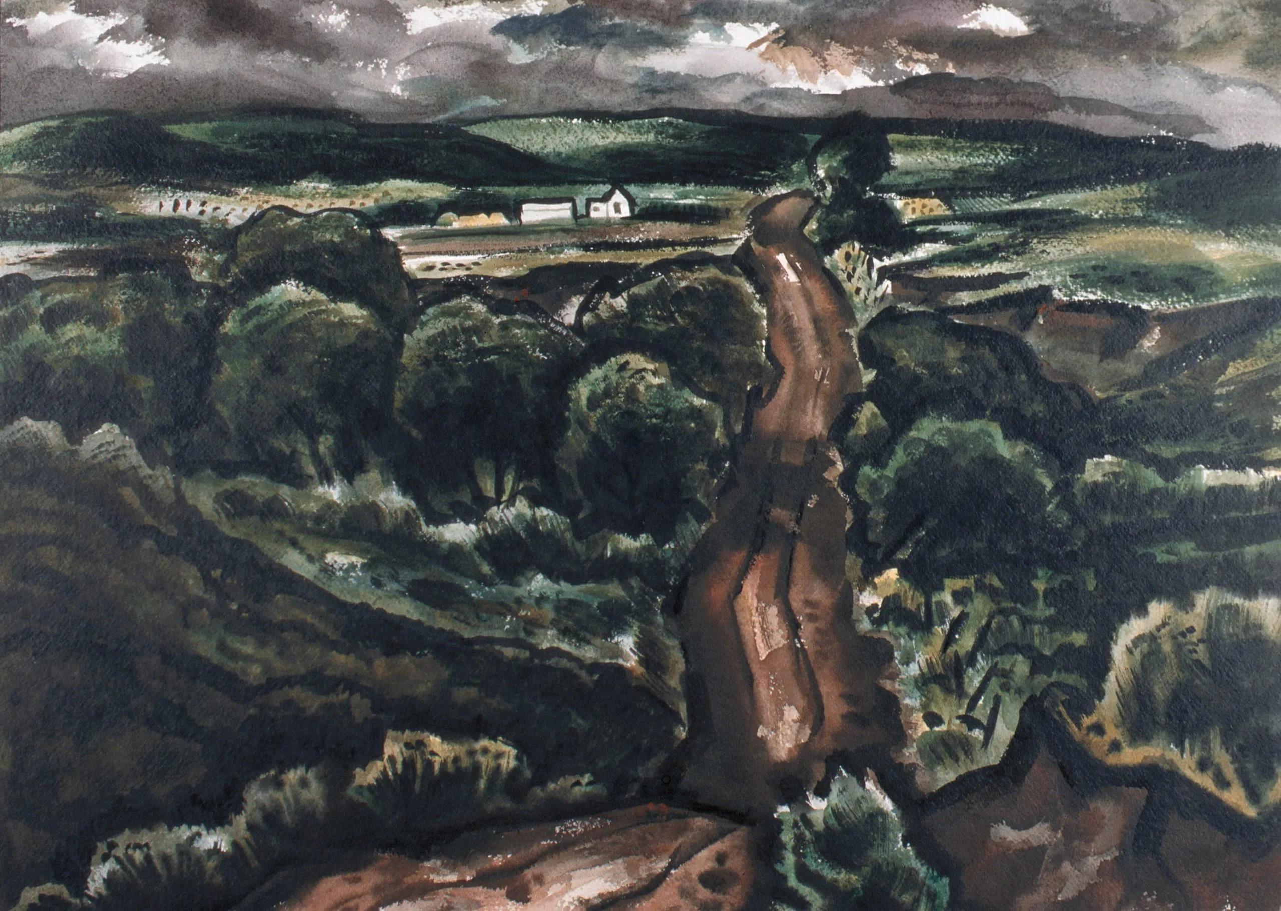 McVicker’s landscape is more forcefully painted than most of the works by members of the California Water Color Society. His dark, heavy palette of blacks, greens, and browns may be a reference to the rich Oklahoma humus McVicker’s blackish coloration and heavy brushwork also reflect his admiration for Georges Rouault (1871-1958). Payne County Road reveals McVicker as a master of technique; he added dark, black, opaque lines over large wet-into-wet passages to delineate the road and houses while applying fuzzy touches of dry brush to suggest plowed fields.