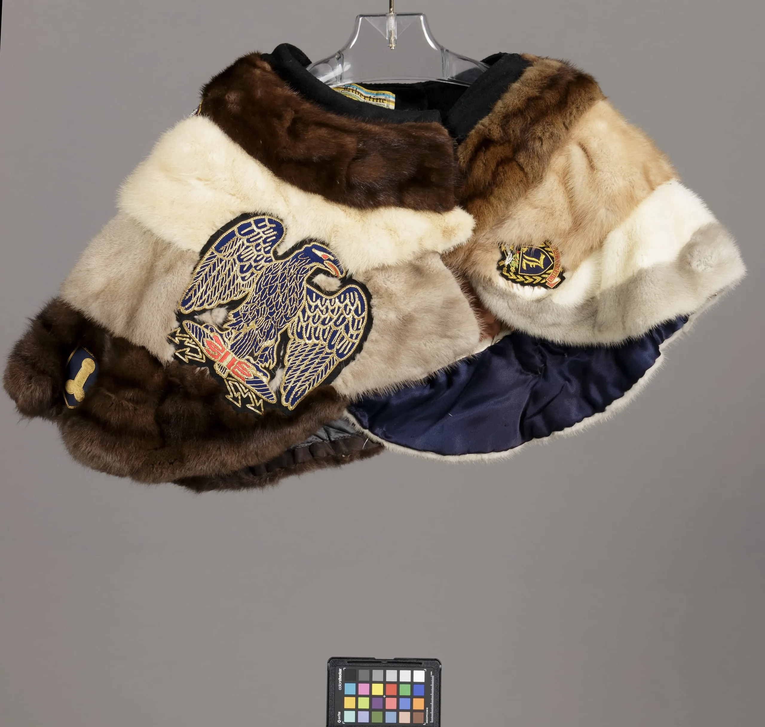 - Fur, pieced, with wool twill, wool felt and silk and metallic-thread embroidered patches