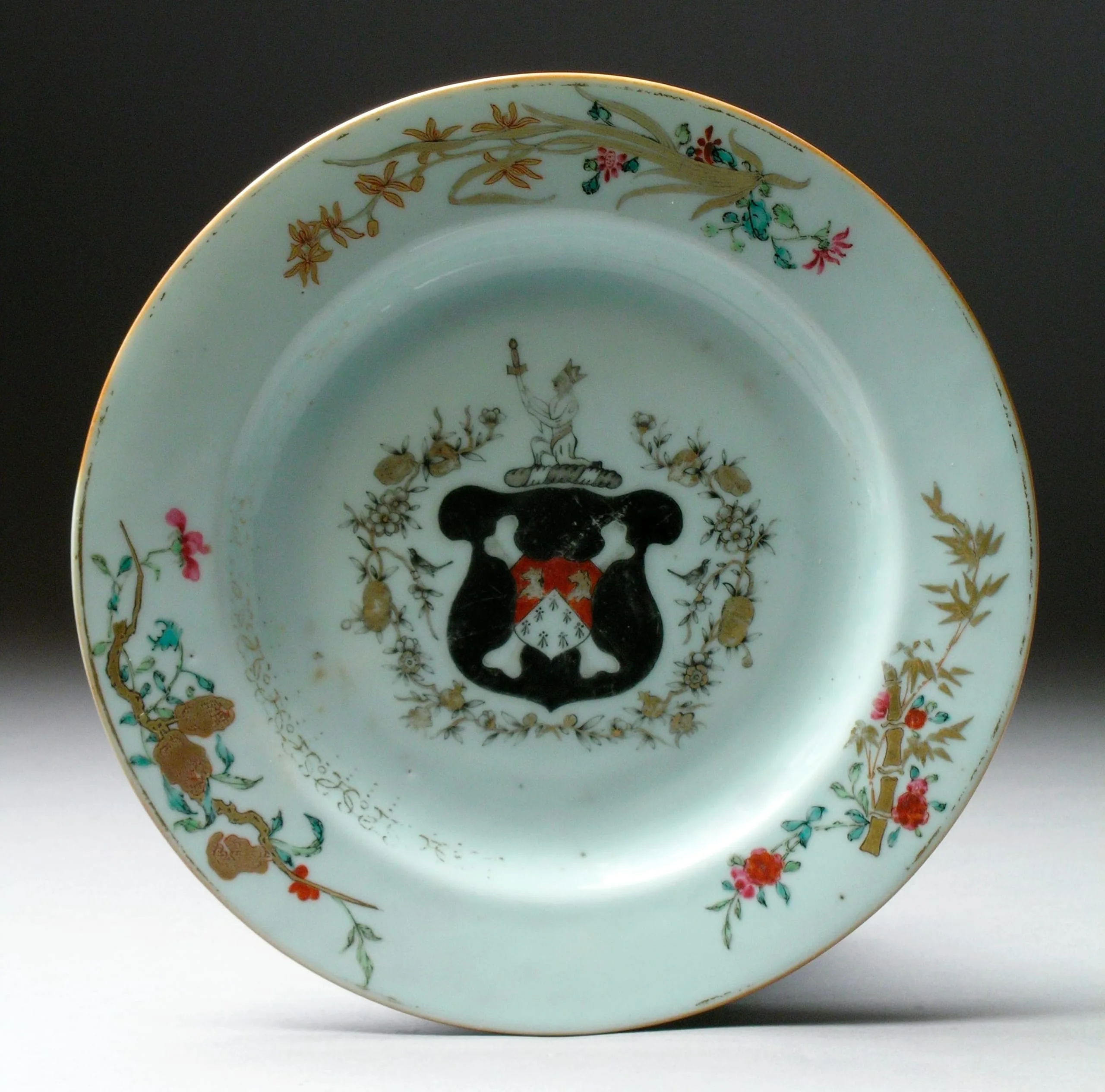 Porcelain plate with pale celadon glaze, decorated with a central heraldic coat of arms in black, red, and white, surrounded by famille rose floral motifs on the rim in coral, pink, teal, and gold