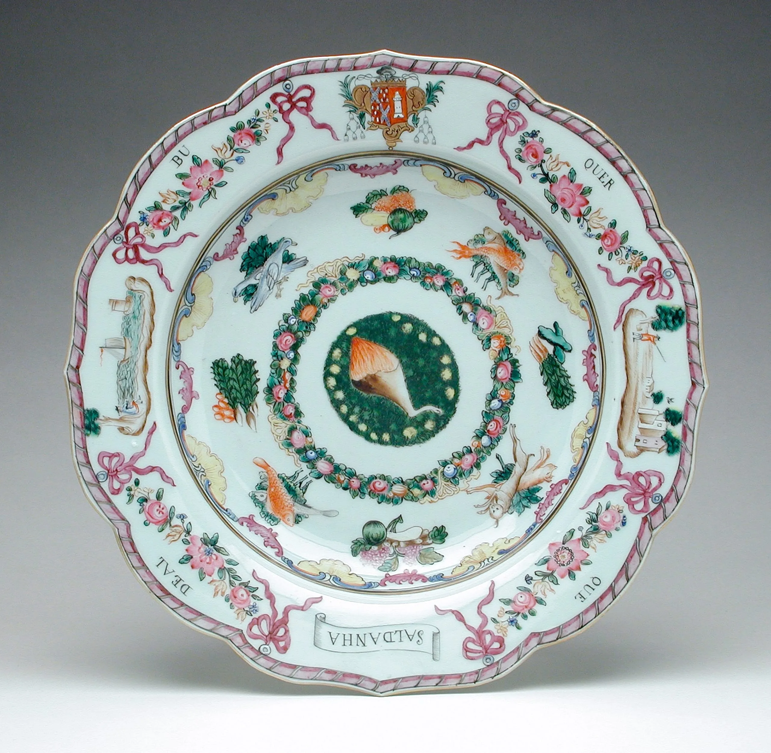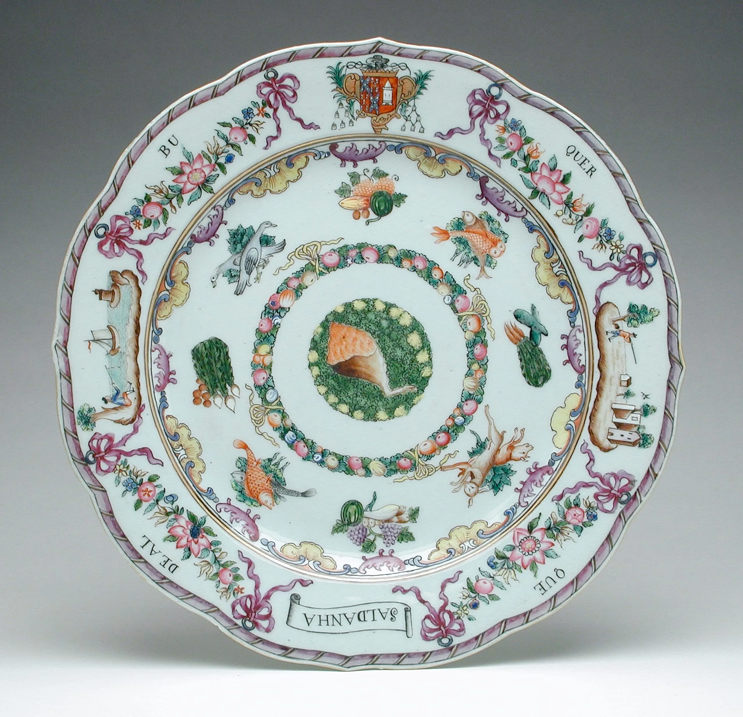 Chinese export porcelain plate with scalloped rim, decorated in famille rose enamels. Central medallion features a conch shell within a wreath of fruits and flowers. The broad white well is scattered with fish, vegetables, and marine motifs. The cavetto rim bears a European armorial cartouche, pink ribbon bows, floral sprays, small landscape vignettes, and a Latin inscription reading "SALDANHA" and "BUQUERQUE DE AL" in banderoles.