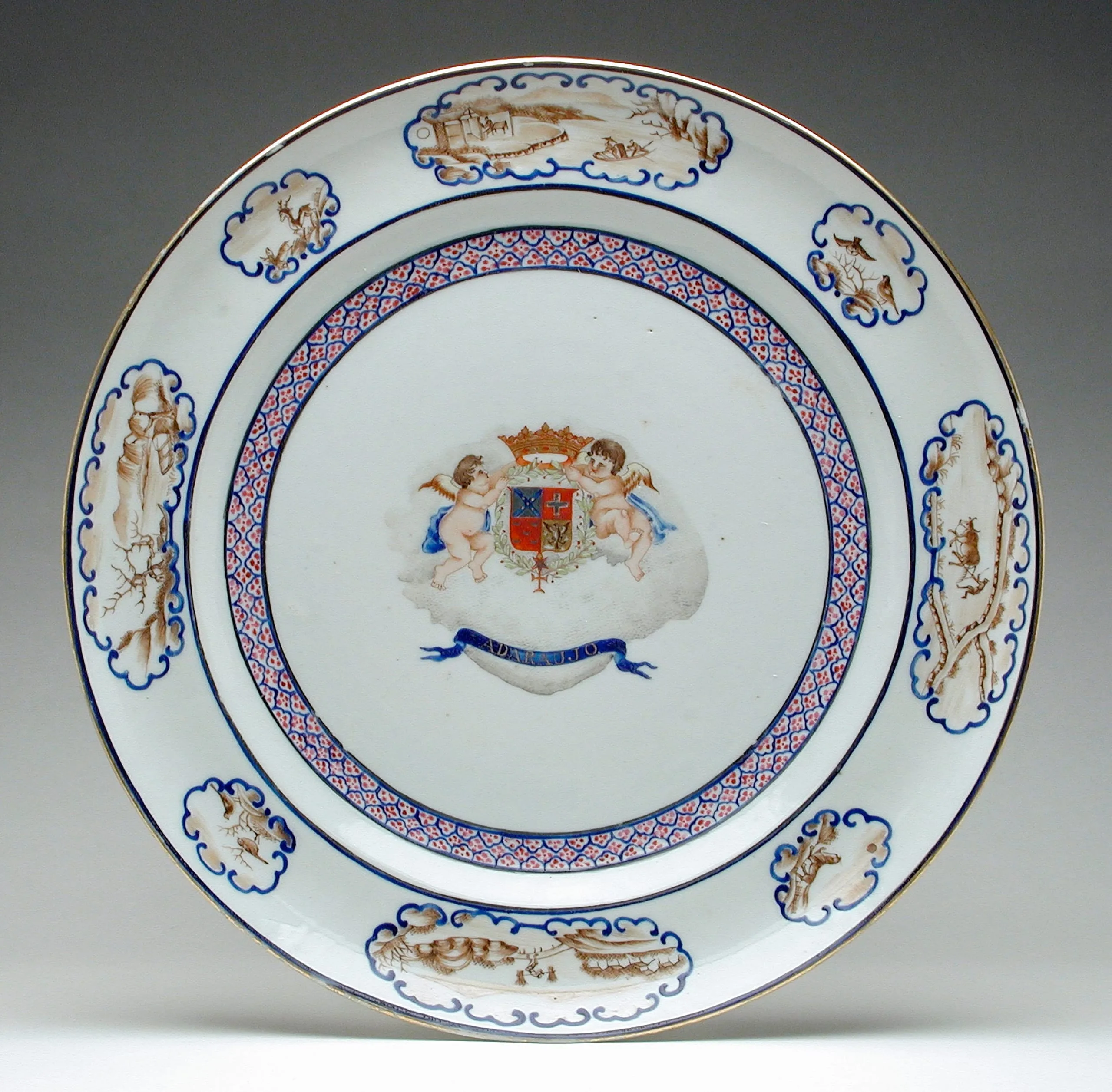 - Plate, Border with four large and four smaller vignettes framed in blue scrolls, brown-painted landscapes and smaller views with birds and animals, Inner band of diaper in red and blue, Center, a shield of arms in laurel wreath with two cupids holding crown above, 9 3/