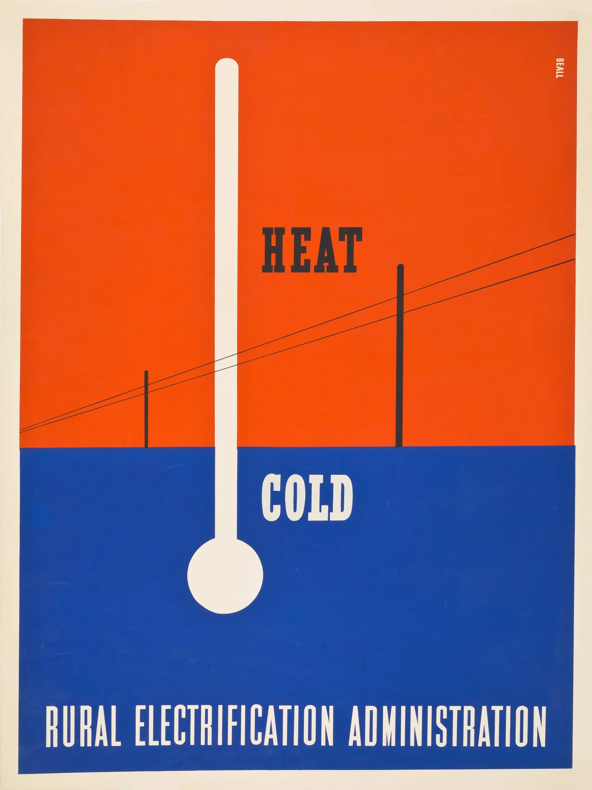 Between 1937 and 1941, Beall completed three series of screenprint posters for the organization, each comprised of six designs. For the first, which included this poster, Beall designed stark black and white icons to represent basic amenities such as heat, light, radio, running water. He contrasted these pictographs against flat two-color grounds, recalling Constructivist graphics in his use of asymmetric layouts, diagonal lines, and arrows to convey movement and energy. His sparse text reflected both his reductivist aesthetic and the minimal reading skills of his intended audience. In series two (1939) and three (1941), he added first photomontage and then bright red, white, and blue patterns to encourage citizens’ patriotic support for the bright promise of an electrified future.