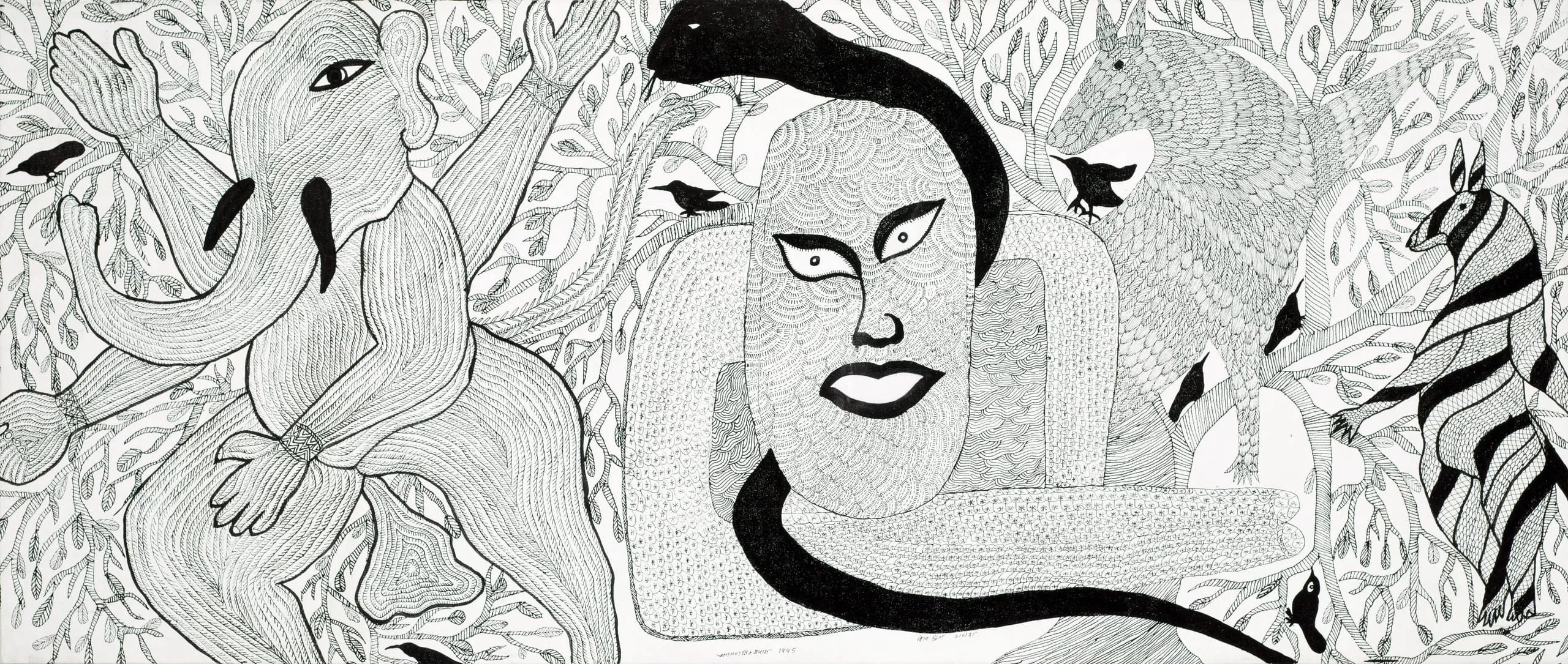 The Gonds are one of India’s largest adivasi (indigenous) communities. They are spread across a central swath of India encompassing several modern states, with a concentration in Madhya Pradesh. The Gonds are comprised of various subgroups, clans, and lineages, including the Pardhan Gonds whose priests perform recitations at important rituals and serve as the chief sustainers of the Gonds’ religious and mythological narratives, histories, and genealogies. Traditionally, Gonds painted auspicious designs on the floors and walls of their homes. In the early 1980s, Jangarh Singh Shyam (1960-2001) became the one of first Pardhan Gond contemporary artists to paint Gond imagery on paper and canvas. His subject matter includes Gond deities and cosmology, gods and goddesses assimilated from Sanskritic traditions as well as folk deities and village guardians, and lush scenes of jungle animals and the natural world.