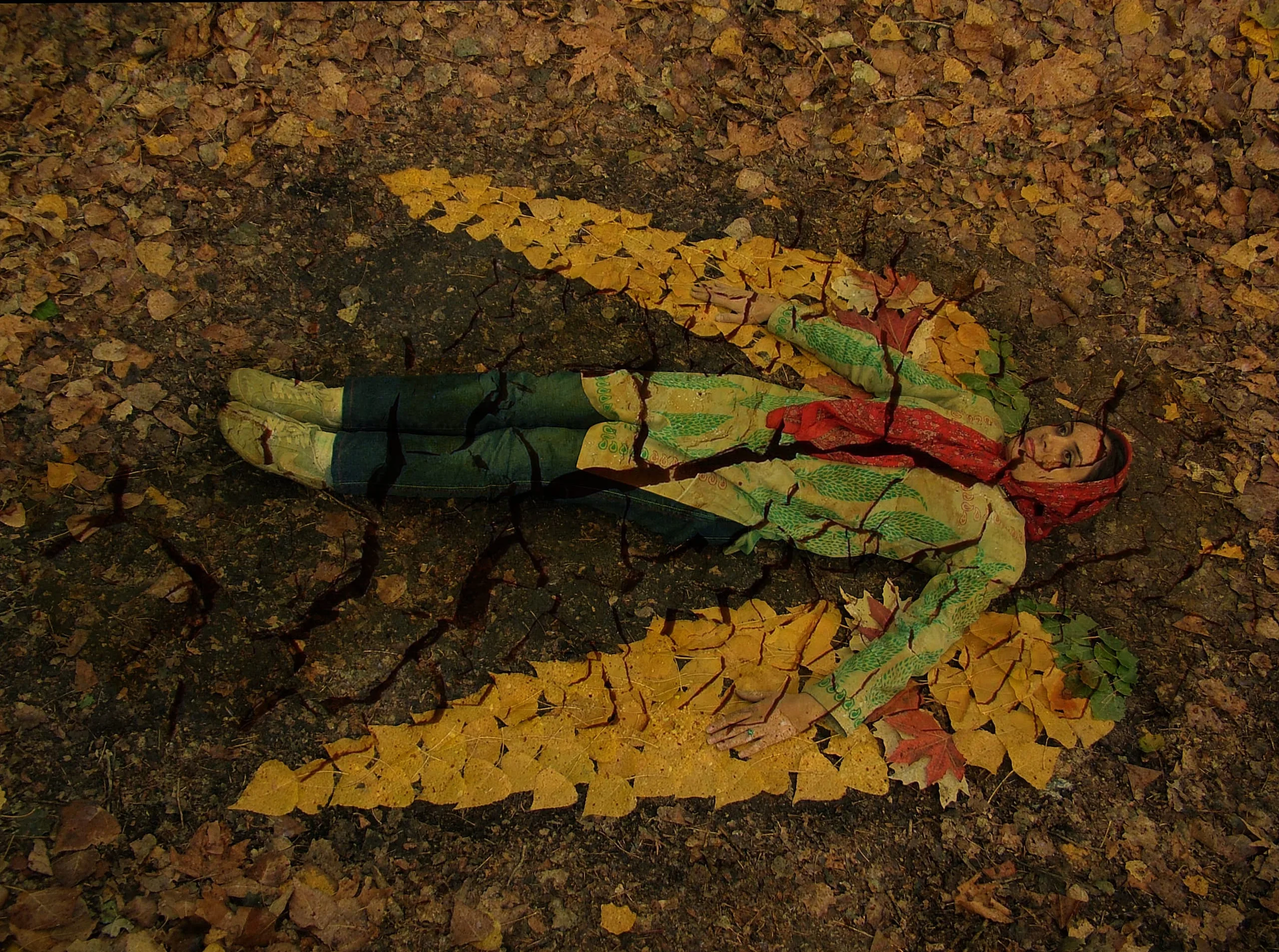 Hojat Amani is captivated by the notion of angels, which according to traditional Iranian Muslim belief are ever-present beings who accompany humans from birth to death; Muslim children are often still taught that at the conclusion of their prayers they should recite the salam gazing right and then left as a way of acknowledging the angels who record their deeds both good and bad. Amani’s angels take a variety of forms and are realized in different mediums, but his most potent versions, as here, are his fallen angels, who replicate and bear the full weight of human failings. This tragic angel, dressed in the guise of a modern young Iranian woman, appears to have literally shattered in her fall to earth; the one remaining sign of her former status—her wings, here formed of golden leaves—will soon blow away or merge with other fallen leaves.