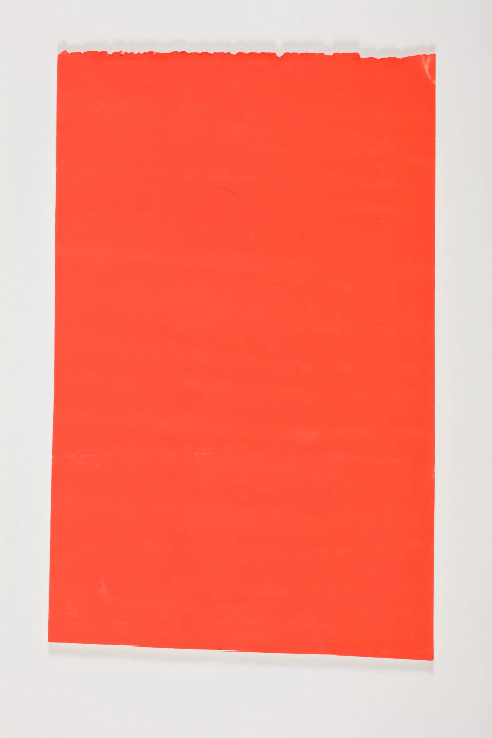 Abstract work: a single sheet of fluorescent orange-red paper with a torn top edge, mounted with tape against a pale gray wall