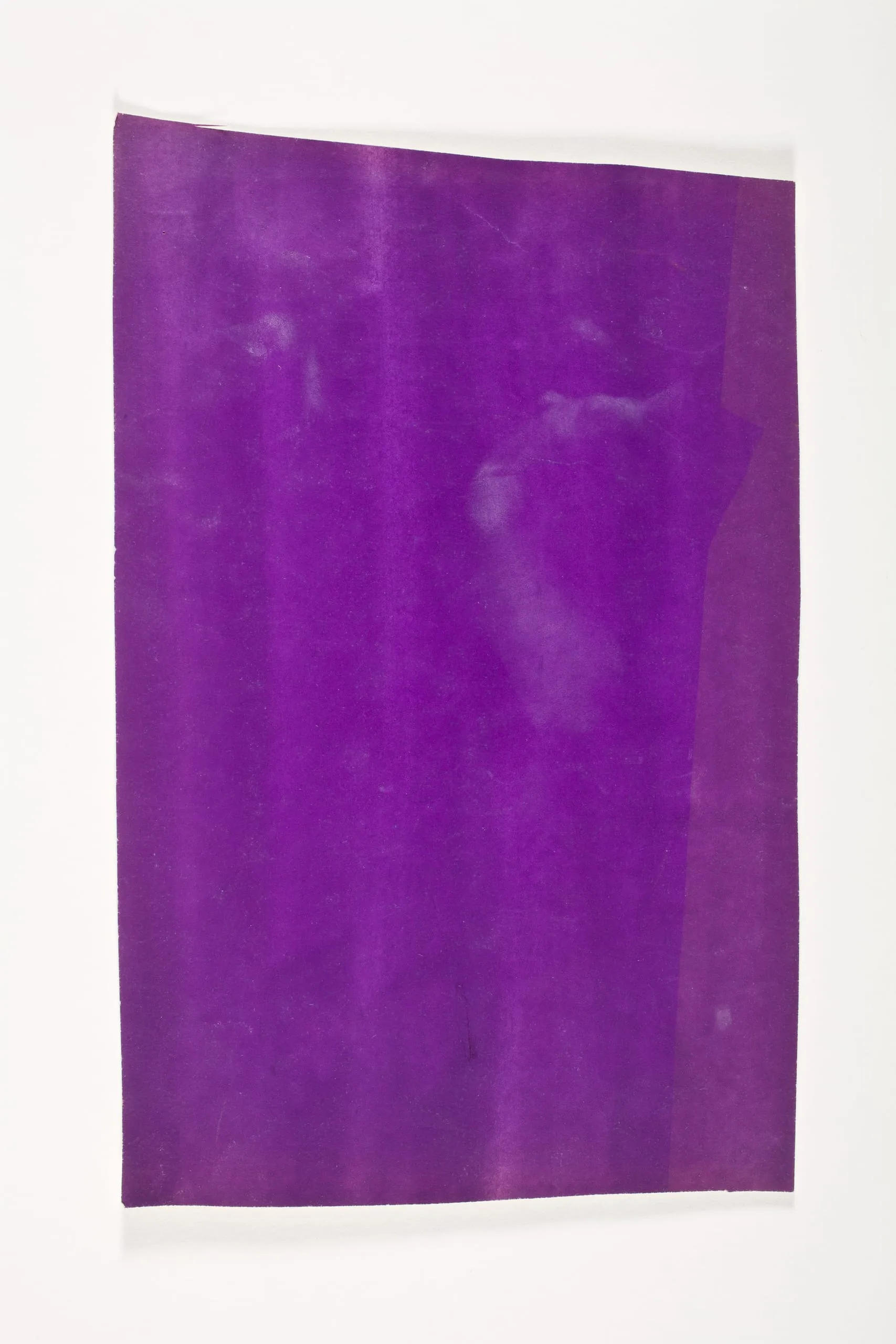 Abstract vertical work, a near-rectangular sheet of vivid violet-purple with vertical streaking and pale cloud-like areas near the center, hung against a white wall
