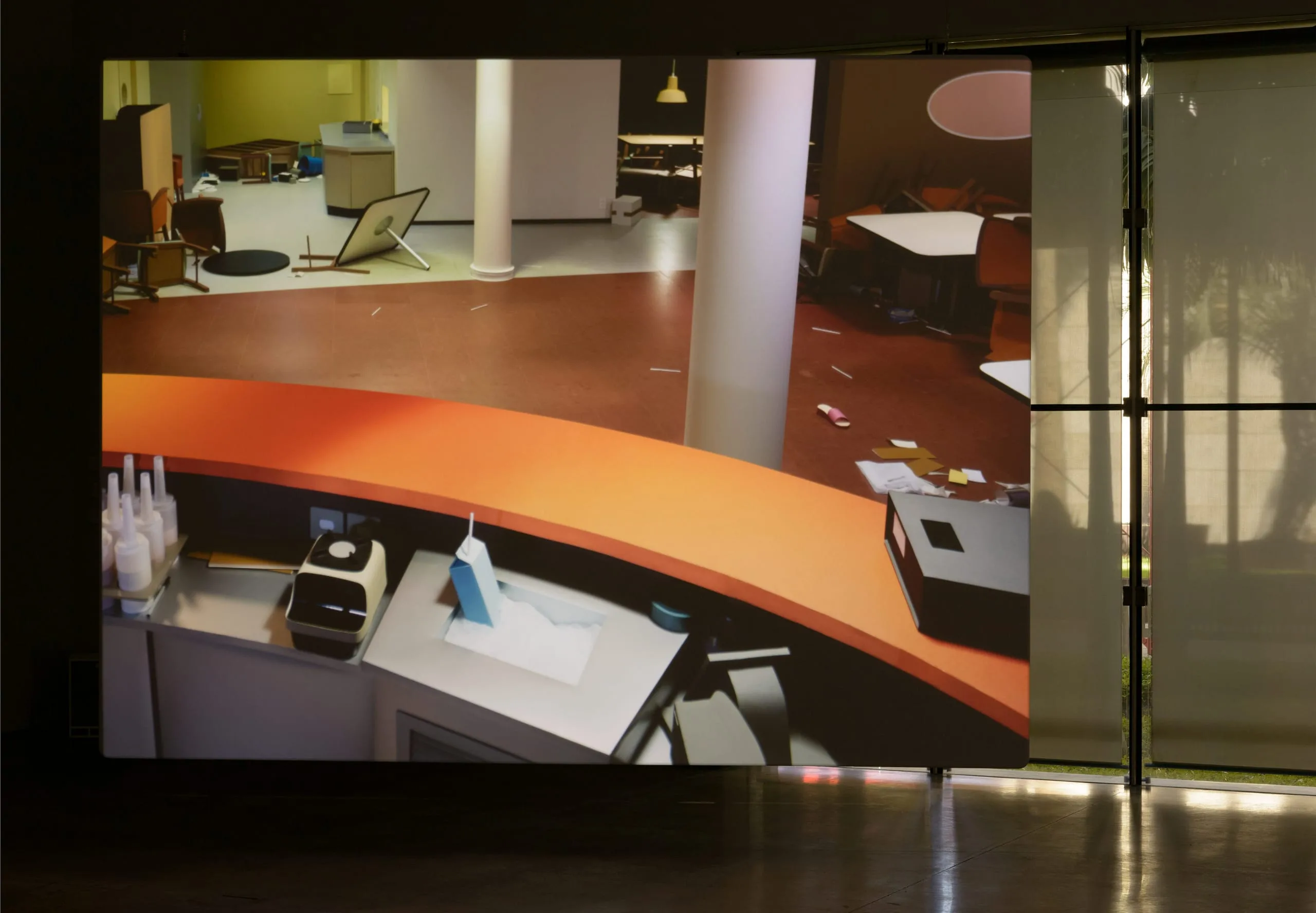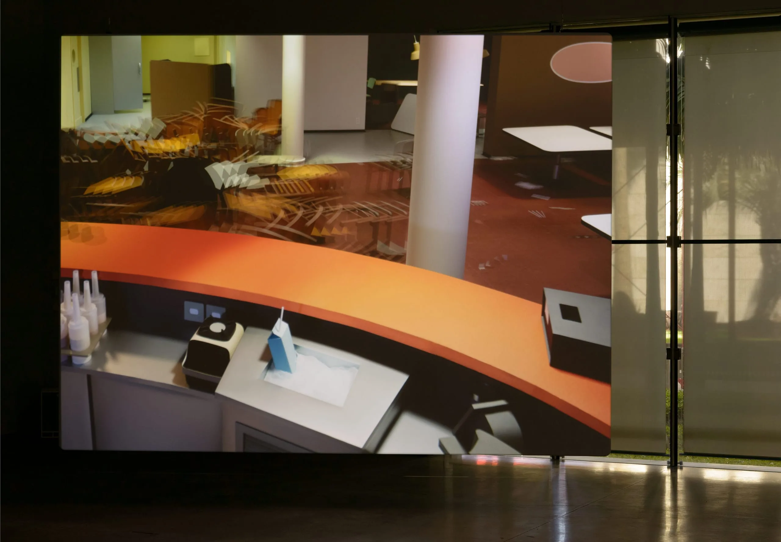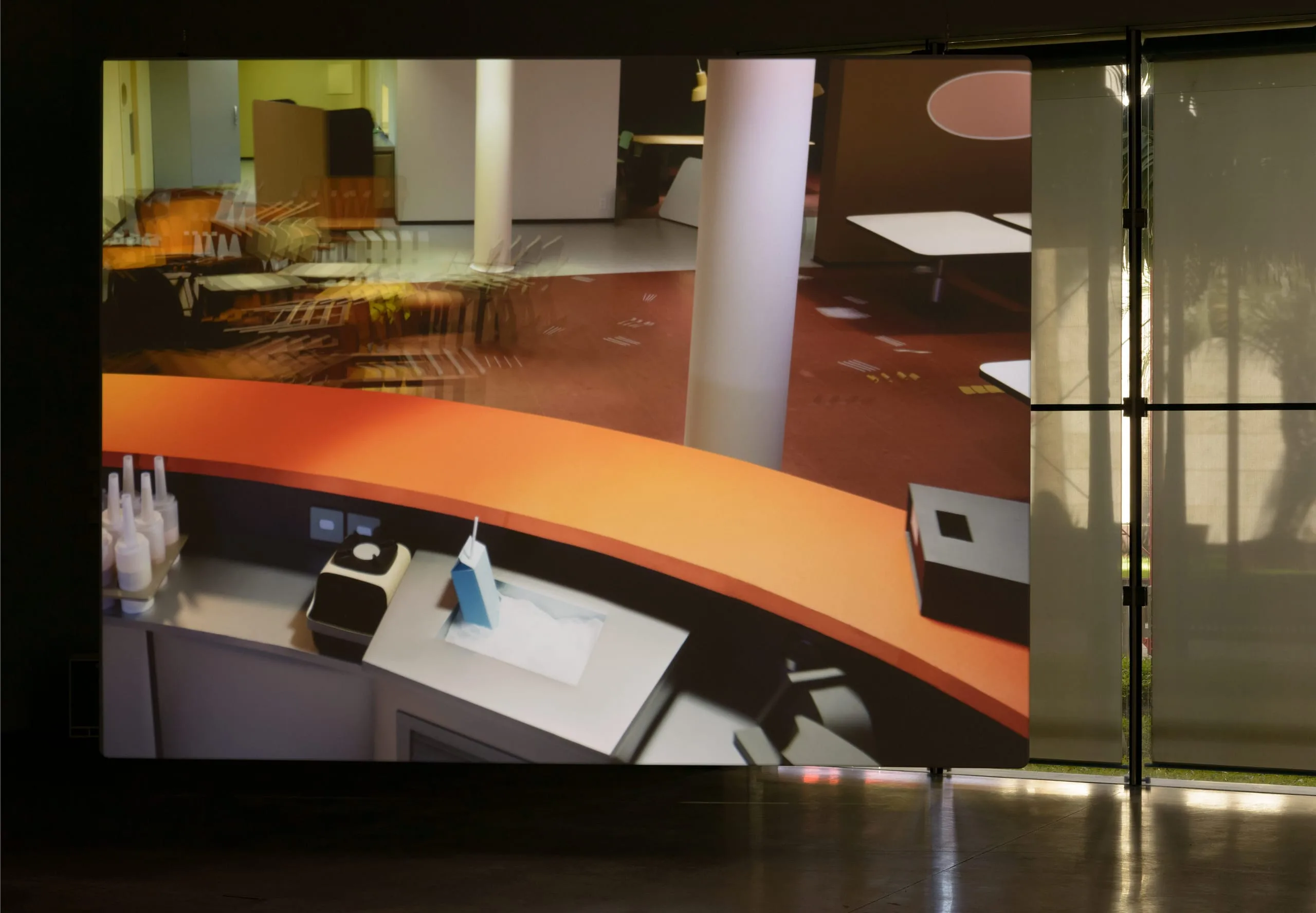 For Pacific Sun, Demand set out to recreate the setting of a 2 minute-long clip he saw on YouTube: the sliding and toppling of furniture and objects in the eponymous cruiser caught in a raging South Pacific storm between the Republic of Vanuatu and New Zealand. With the help of crew members who had worked on Zack Snyder’s 2013 film Man of Steel, the artist programmed a wireframe model of the room as seen from a security camera in order to analyze movement and developed a “script” for each of the 350 visible objects. A group of animators meticulously followed 3,000 pages of these scripts, moving objects millimeters at a time and photographing them over three and a half months, which yielded a stop-motion animation of 2,400 frames. Demand eschewed digital animation for stop-motion with the aim of rendering objects’ movements as realistically as possible, and thus, in the absence of struggling human passengers, these take on an uncannily anthropomorphic quality; the objects become the artist’s true protagonists.