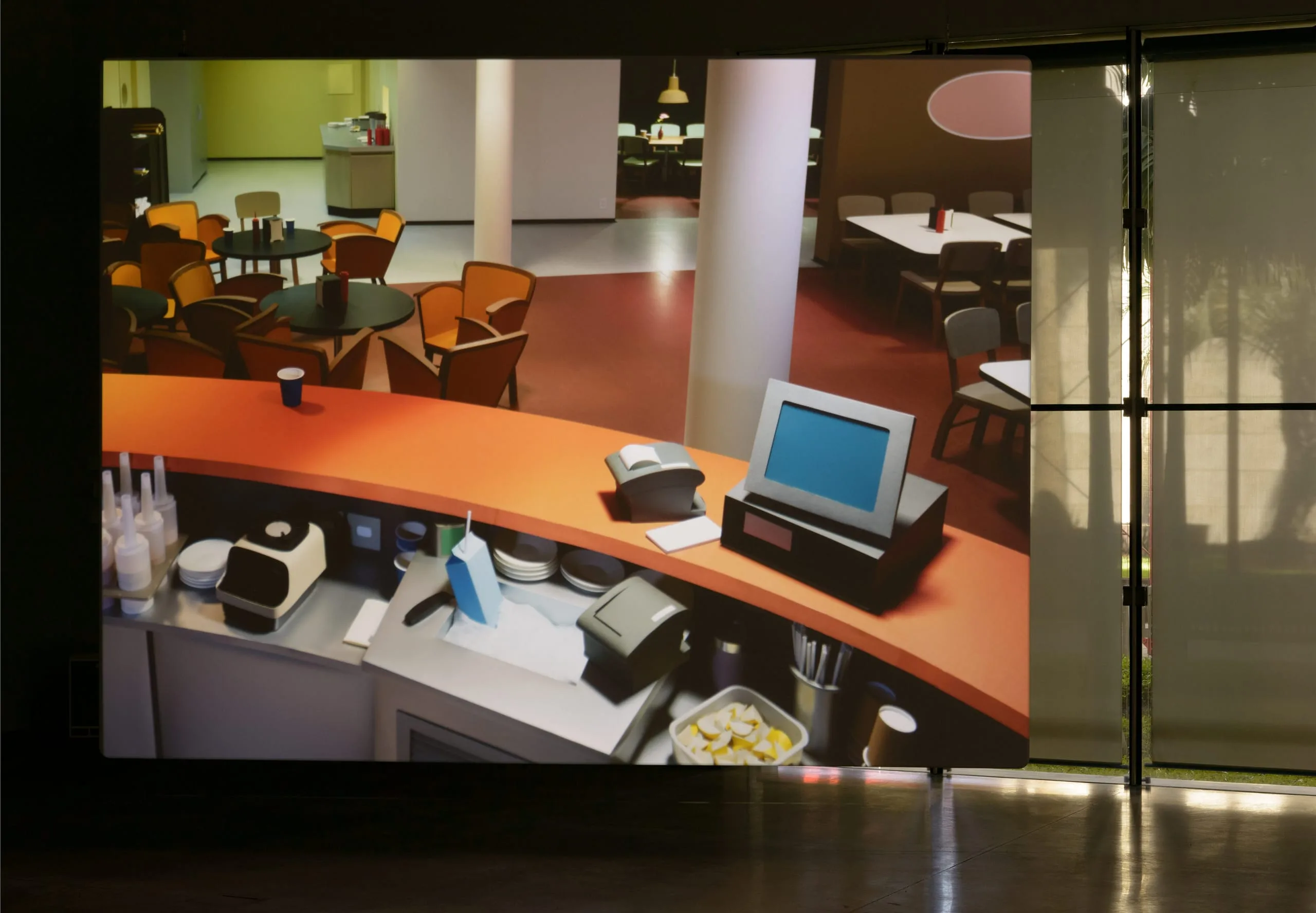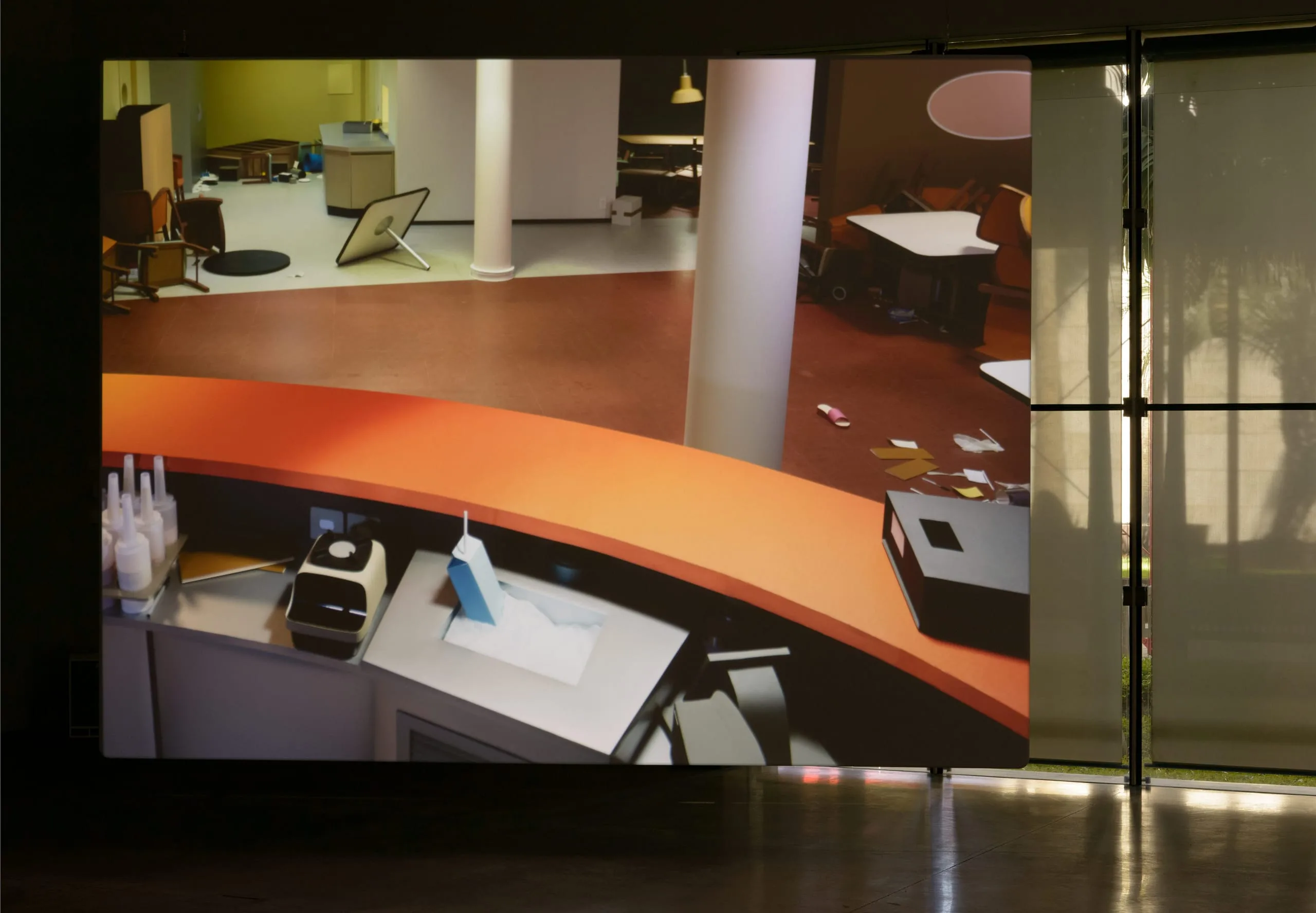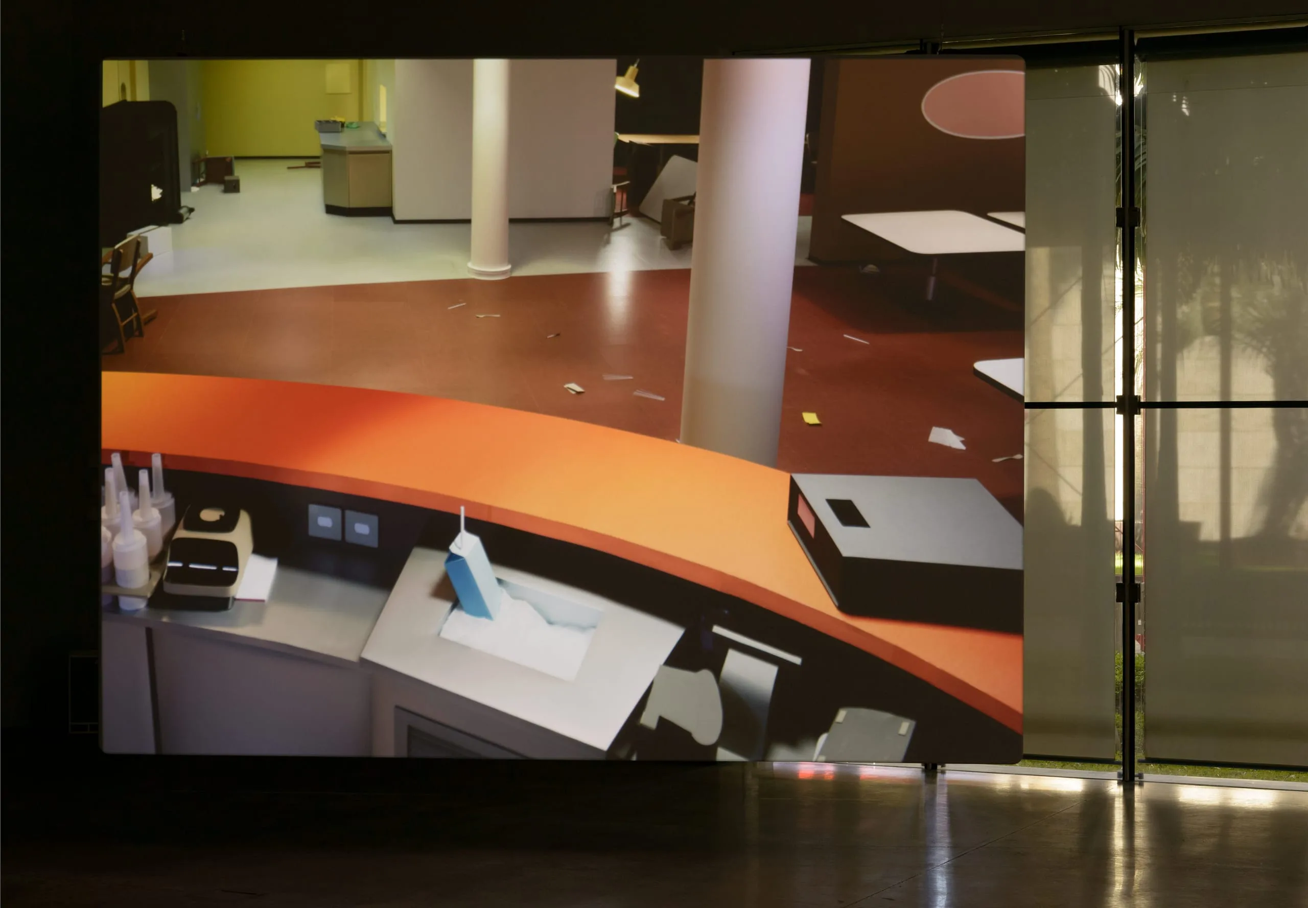 For Pacific Sun, Demand set out to recreate the setting of a 2 minute-long clip he saw on YouTube: the sliding and toppling of furniture and objects in the eponymous cruiser caught in a raging South Pacific storm between the Republic of Vanuatu and New Zealand. With the help of crew members who had worked on Zack Snyder’s 2013 film Man of Steel, the artist programmed a wireframe model of the room as seen from a security camera in order to analyze movement and developed a “script” for each of the 350 visible objects. A group of animators meticulously followed 3,000 pages of these scripts, moving objects millimeters at a time and photographing them over three and a half months, which yielded a stop-motion animation of 2,400 frames. Demand eschewed digital animation for stop-motion with the aim of rendering objects’ movements as realistically as possible, and thus, in the absence of struggling human passengers, these take on an uncannily anthropomorphic quality; the objects become the artist’s true protagonists.
