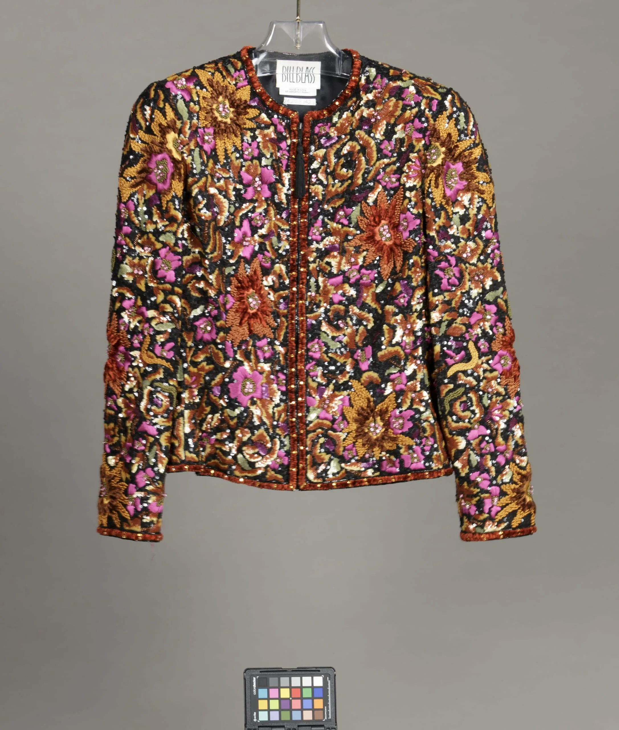 - Silk plain weave, silk- and silk-chenille-thread-embroidery, plastic sequins, glass and crystal beads