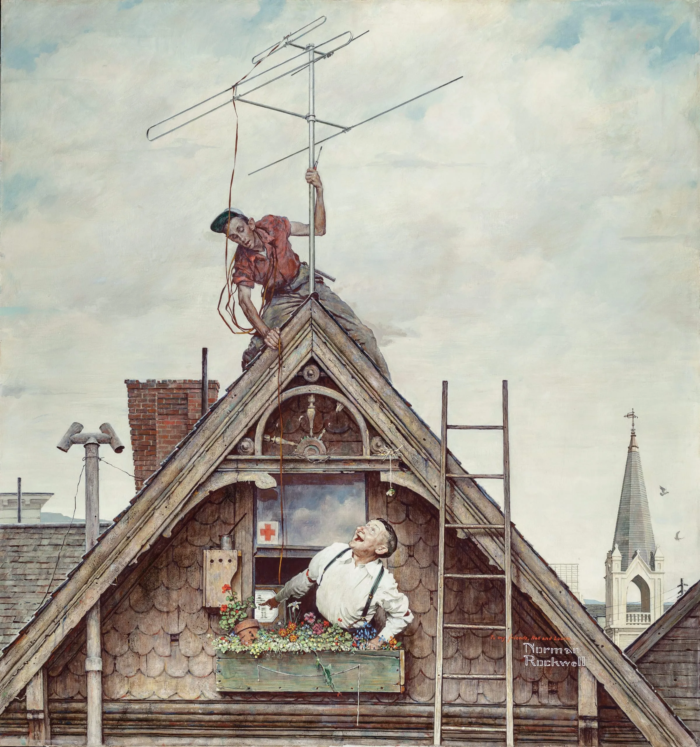 During the decade Rockwell increasingly used photographs in his preparatory work so that he could pay more attention to the setting, rather than the figures, as he had earlier. Consequently a new concern for architectural subjects, seen most often in detailed interiors, appeared in his art. He depicted architectural exteriors less frequently. By setting The New Television Set on the roof of a house, Rockwell used architecture not only to structure the composition but also to convey the contrast of the old, the house, with the new, the television. The scene epitomizes the rapid modernization of America, for the house was one of many large Victorian structures characteristic of the district around Adams Street in Los Angeles, where it was painted.
