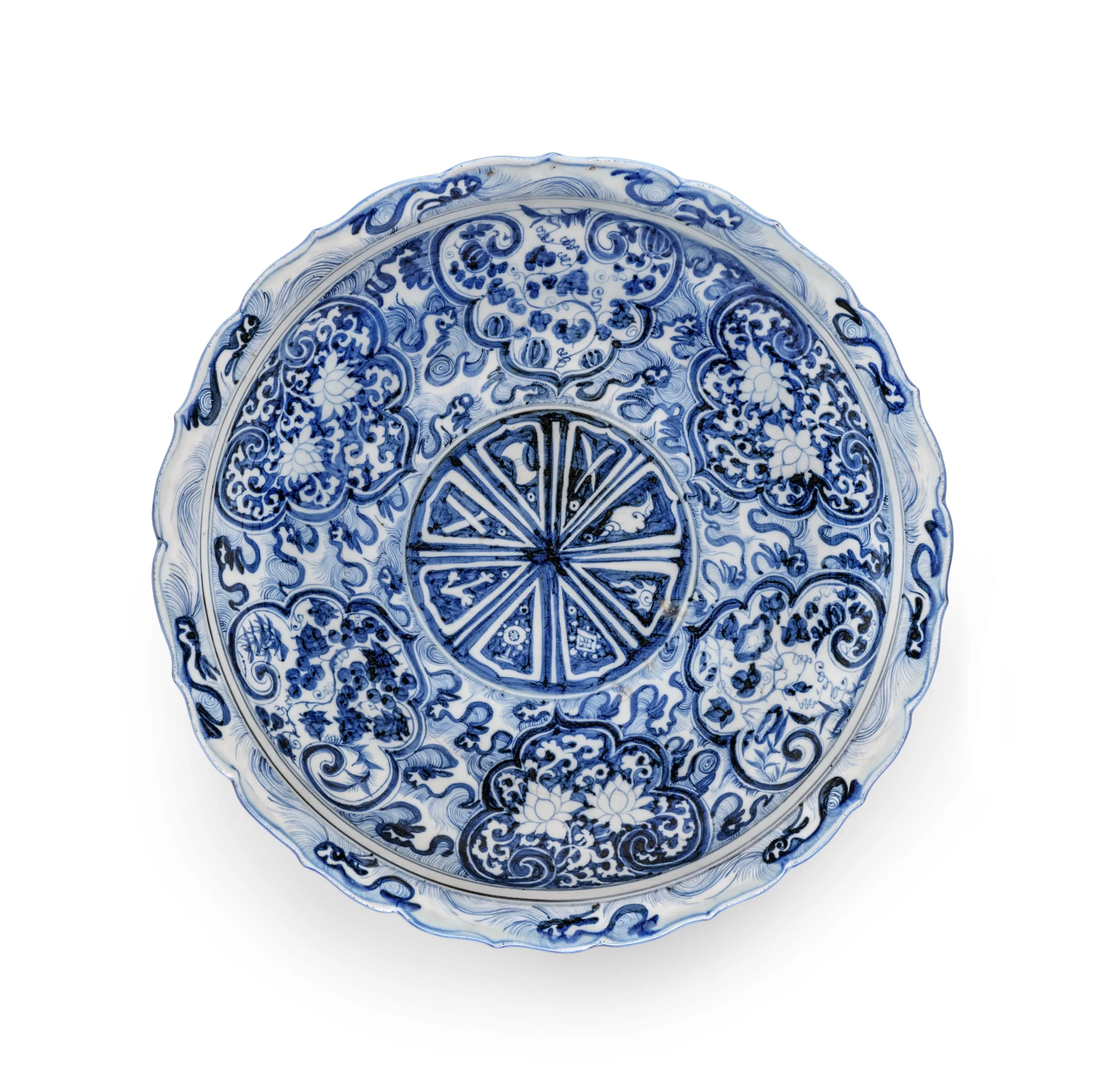 The feathery wave motif circles the plate's rim. Three additional concentric tiers of waves give the plate's surface a lively and unpredictable pattern. The two middle wave tiers are interrupted by six lobed cloud-collar patterns, which echo the rim shape. Designs in the cloud collars include lotuses, abstract foliage, melons, grapes, bamboo, and morning glories. Some scholars believe the cloud-collar shape derives from designs in Persian metalwork or Mongol and Tatar embroideries; others suggest that it derives from Buddhist designs representing the four cardinal directions.