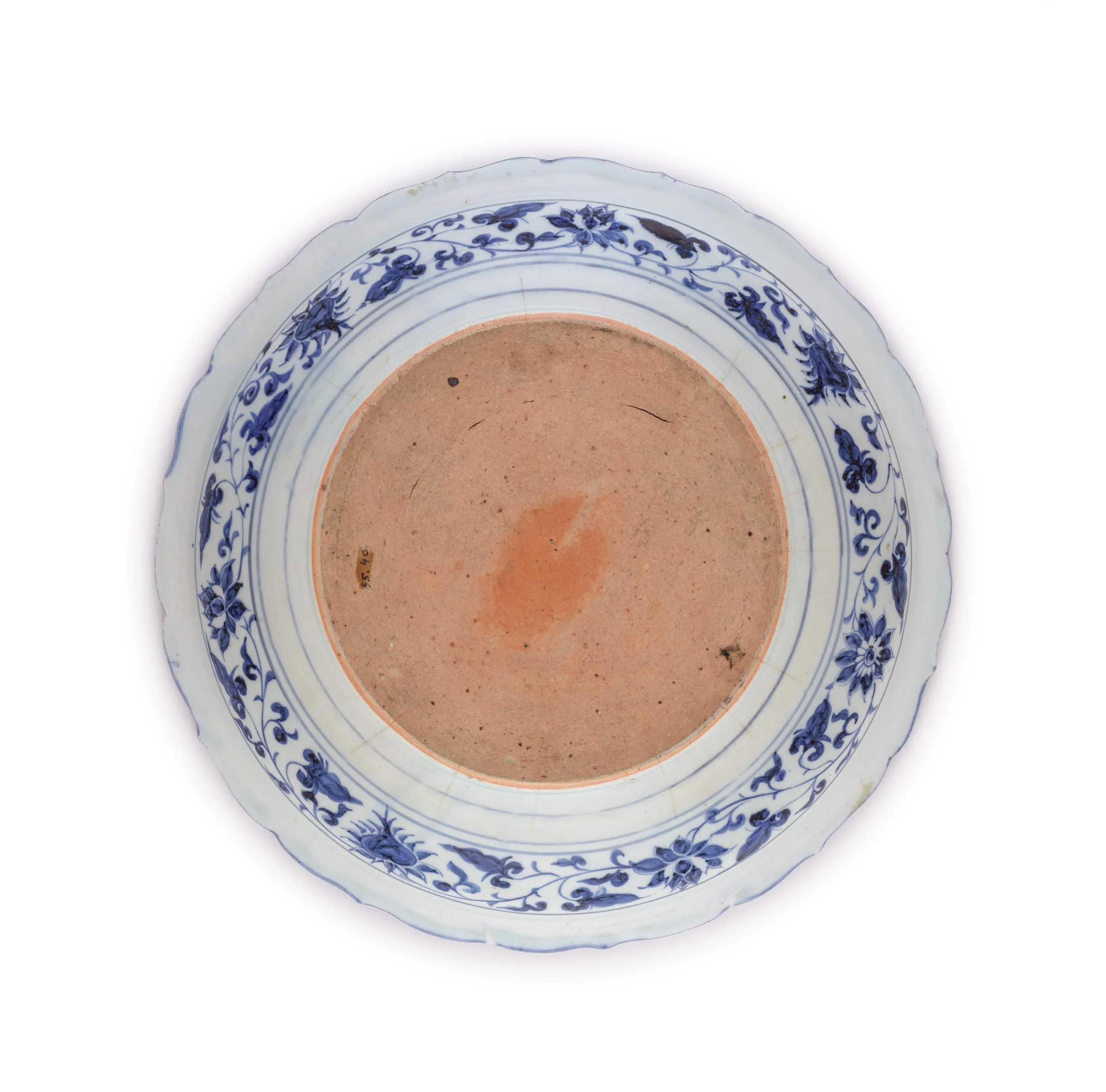 This example is typical of early blue-and-white Yuan ceramics, with its foliated rim, unglazed base, and freely drawn wave motif. The technique of blue underglaze with white reserved areas, all with a clear feldspathic overglaze, emerged from innovative Yuan ceramic experiments.