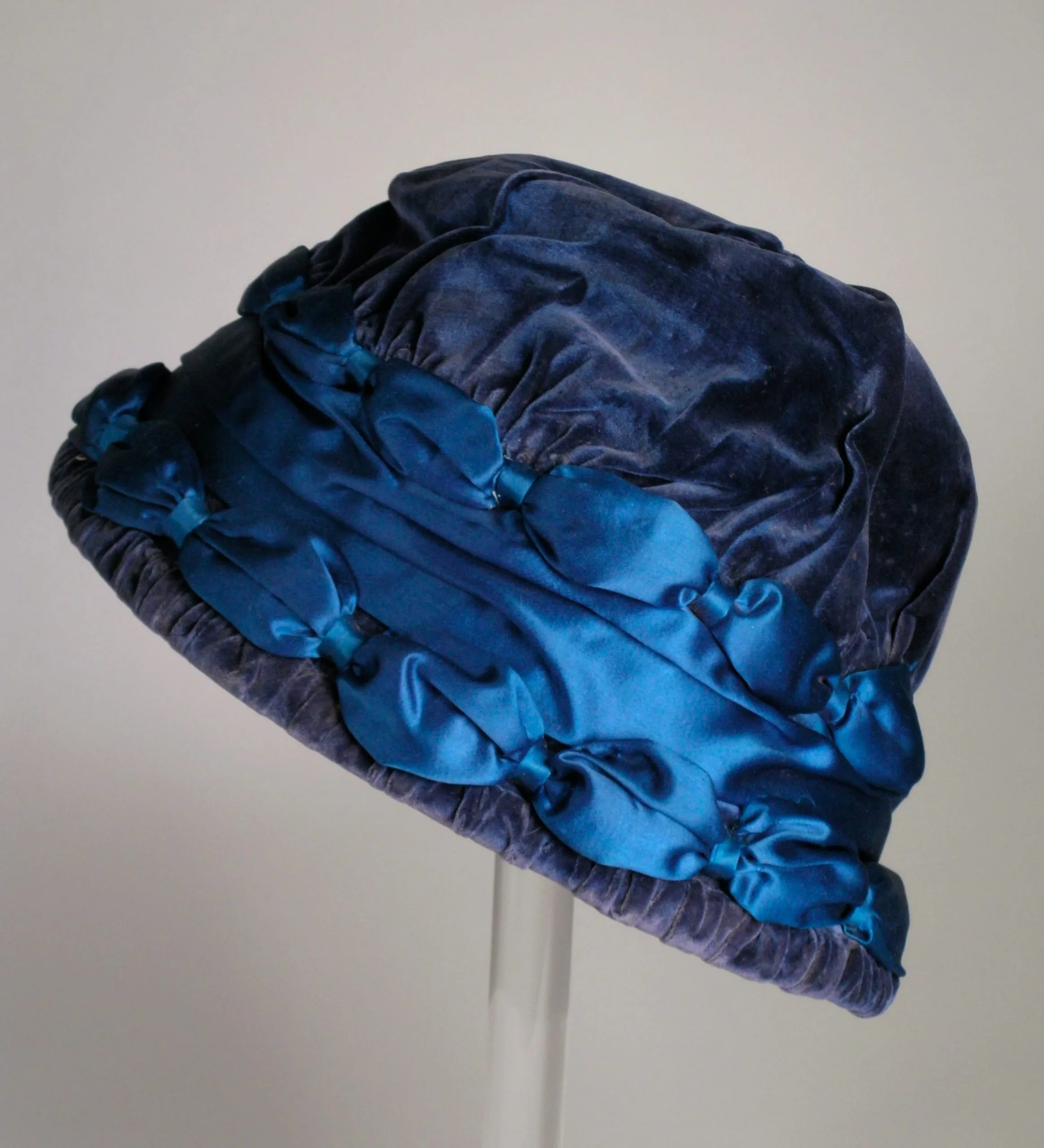 Navy blue velvet bucket hat with cerulean satin gathered band and small satin bows, displayed on a clear acrylic stand