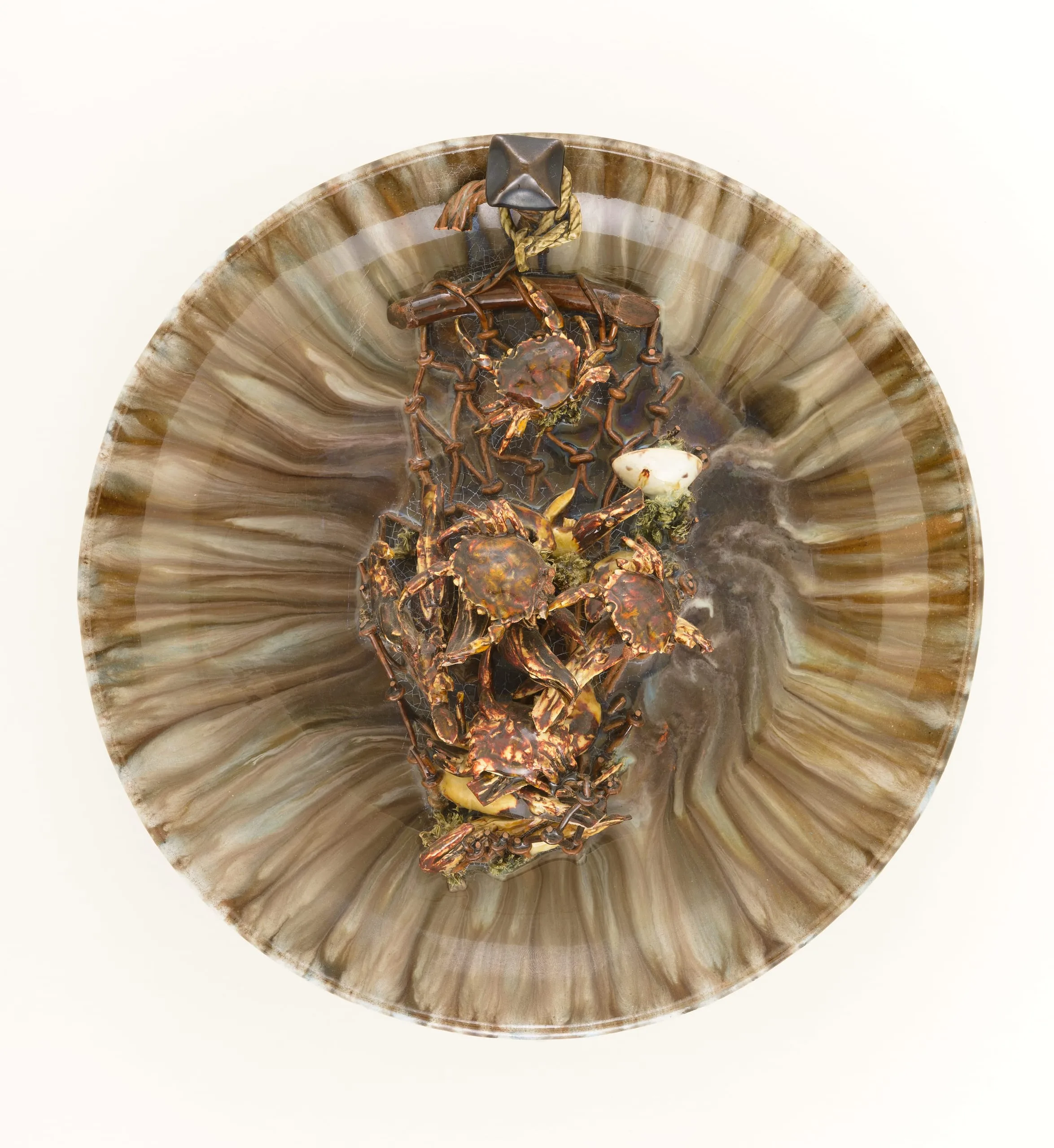 In Portugal, manufacturing was concentrated in the town of Caldas da Rainha, where, in the 1850s, Manuel Cipriano Gomes Mafra (1830-1905) began to adapt Palissy’s style. The Portuguese Palissy revival culminated with the virtuosic trompe l’oeil compositions of Rafael Bordalo Pinheiro (1846-1905). Pinheiro is the undisputed star of the Portuguese Palissyists. This plate with netted crabs suspended from a nail is dated 1889, the year his company received gold and silver medals at the Paris Exposition Universelle and he was awarded the Legion of Honor.
