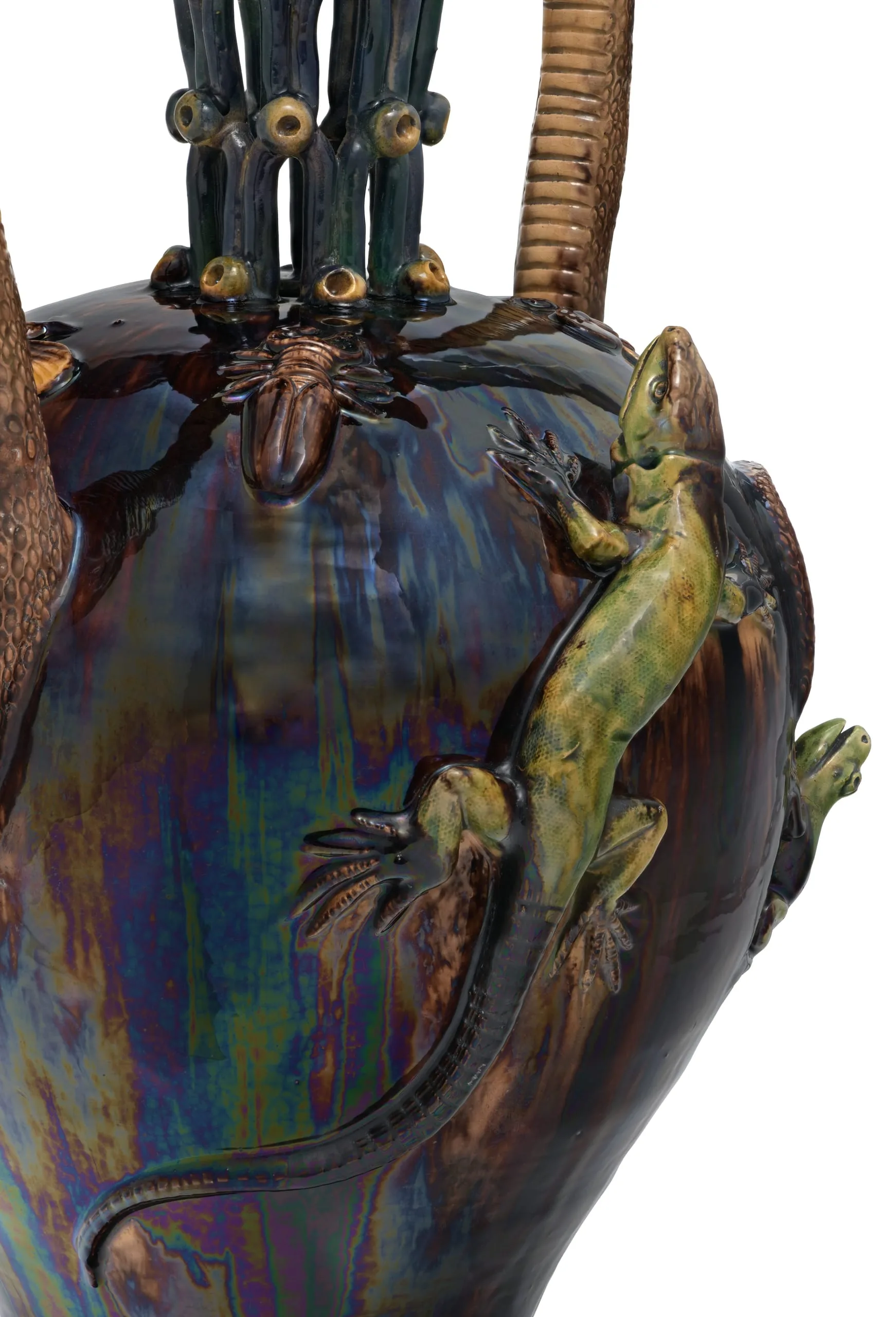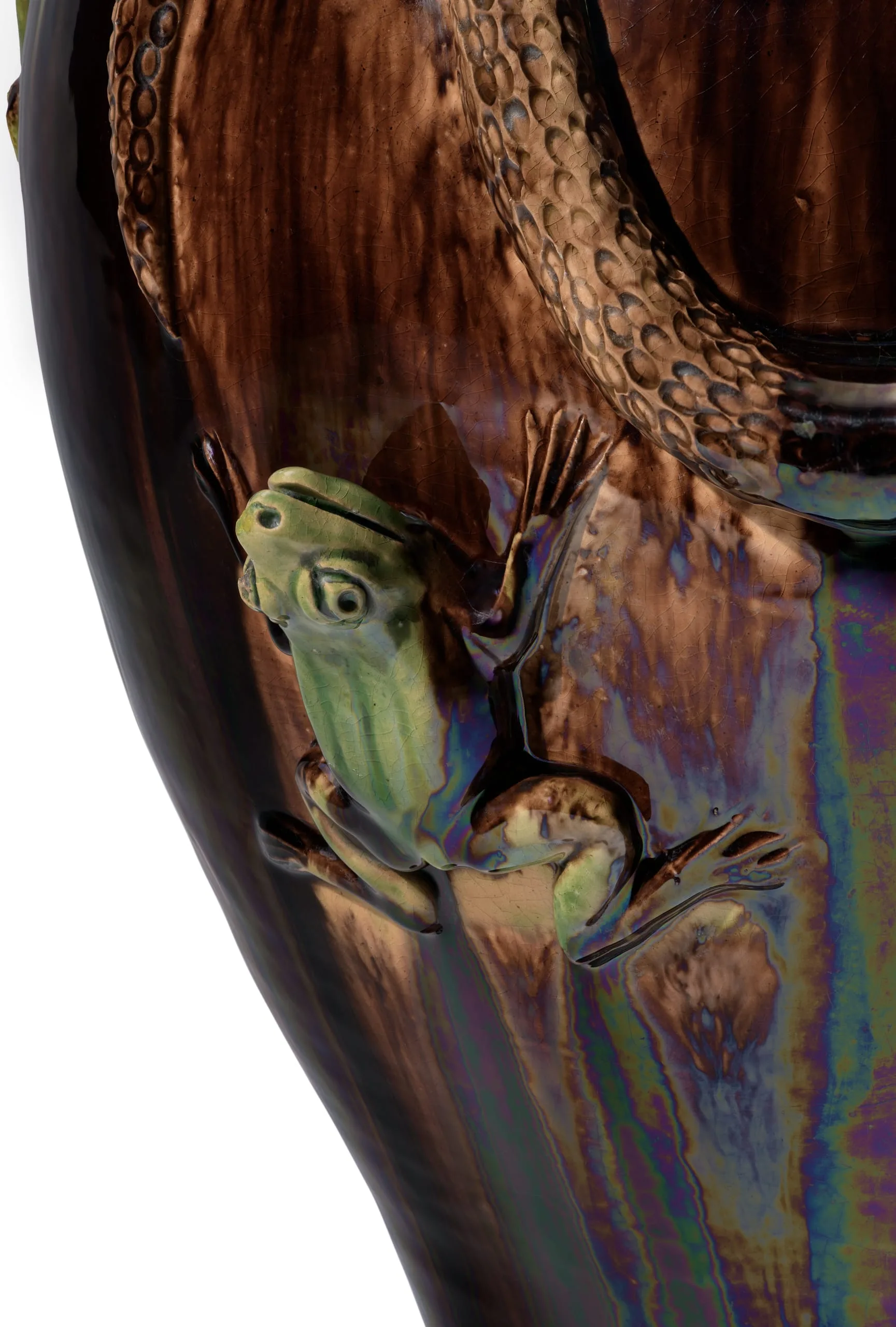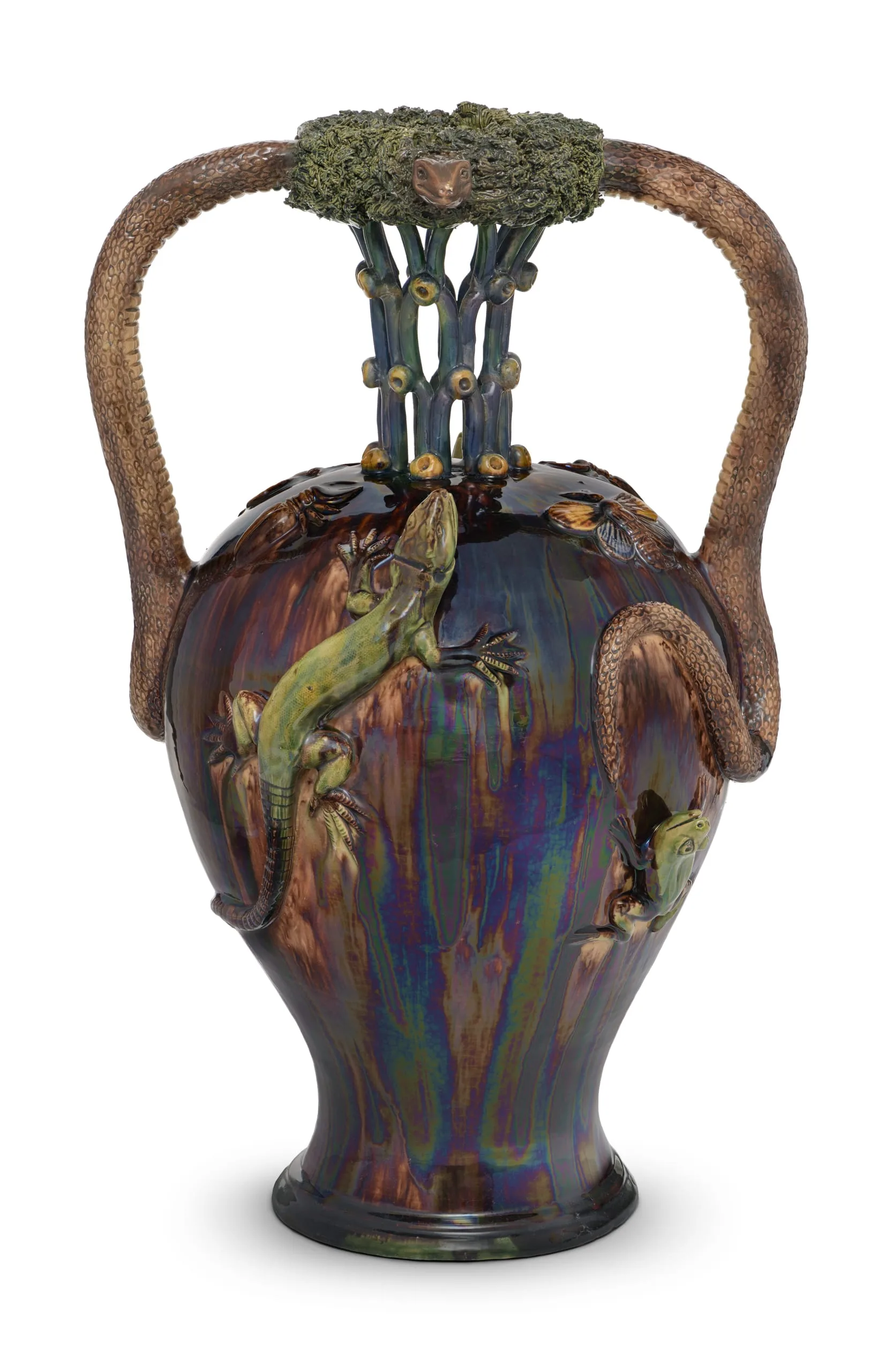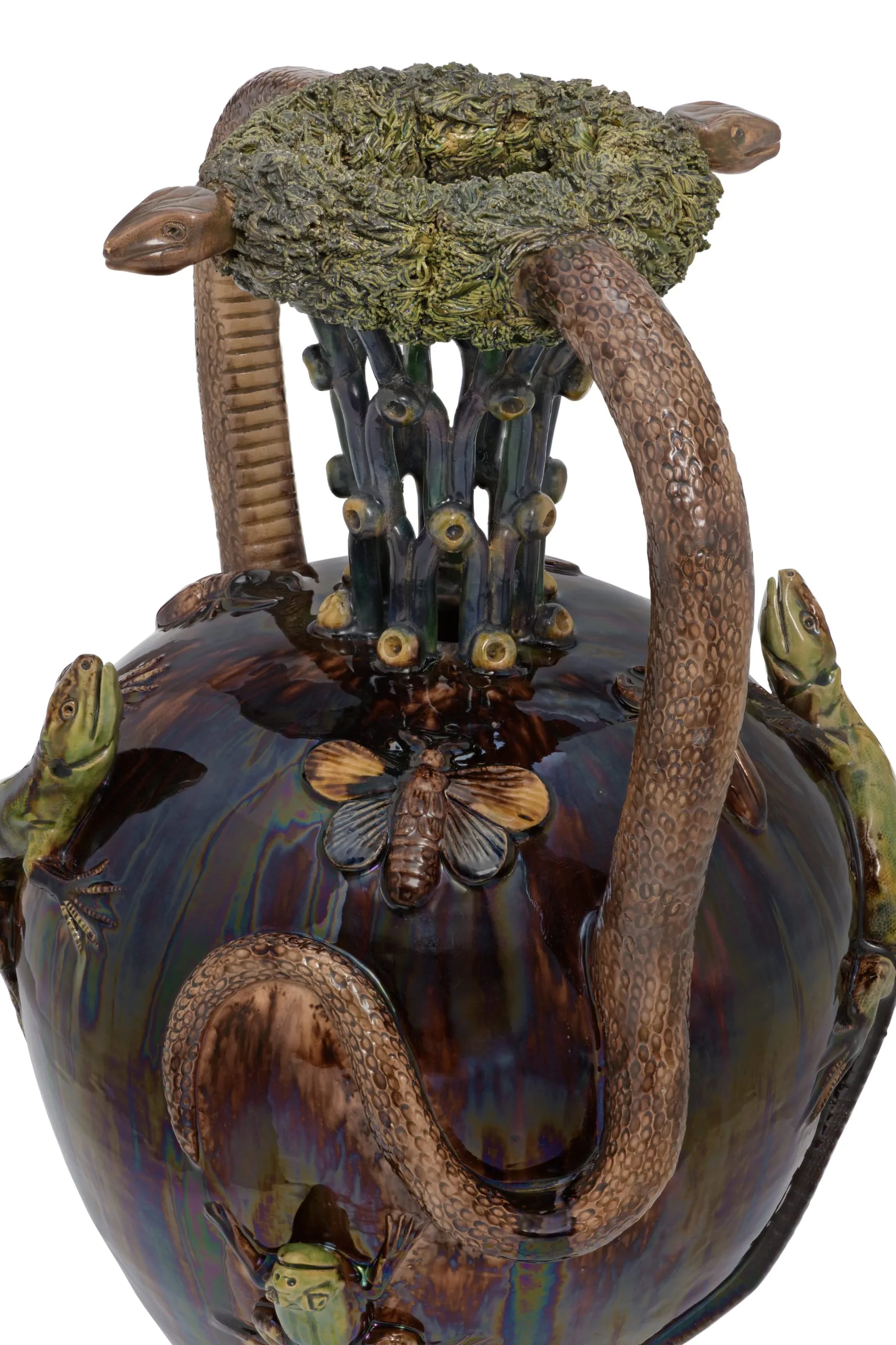 In Portugal, manufacturing was concentrated in the town of Caldas da Rainha, where, in the 1850s, Manuel Cipriano Gomes Mafra (1830-1905) began to adapt Palissy’s style in a strikingly different direction, quite unlike that of his French counterparts. He incorporated the technique of pressing wet clay through a sieve to create the effect of moss as his principal background and expanded the subject matter, introducing narrative elements and extending the nature morte metaphor. This urn with snake handles is one of Mafra’s best-known designs.