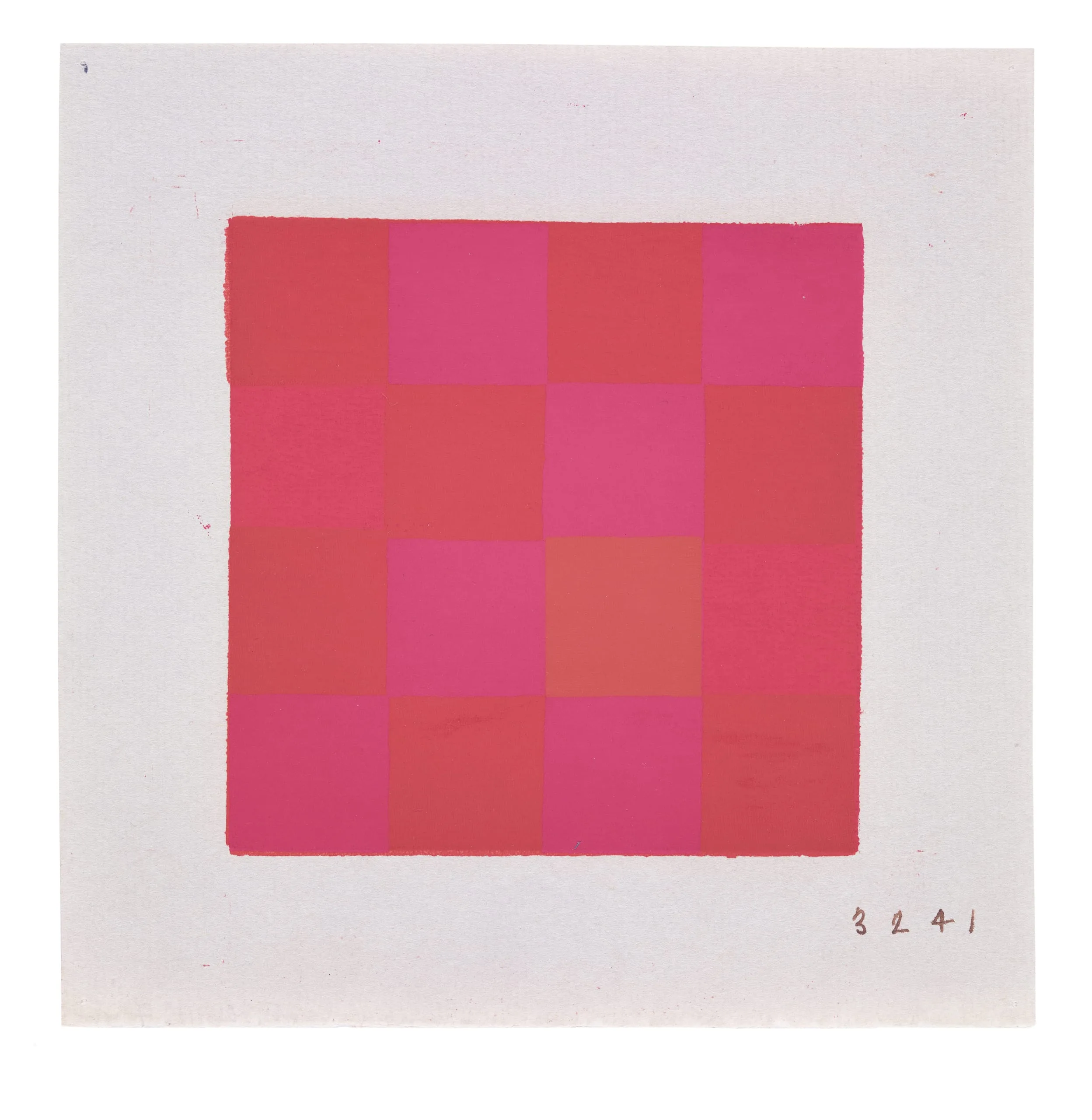 Abstract work on paper, checkerboard grid of sixteen squares alternating between tomato red and hot magenta pink, centered on a pale gray-white ground, with handwritten numerals "3 2 4 1" in the lower right