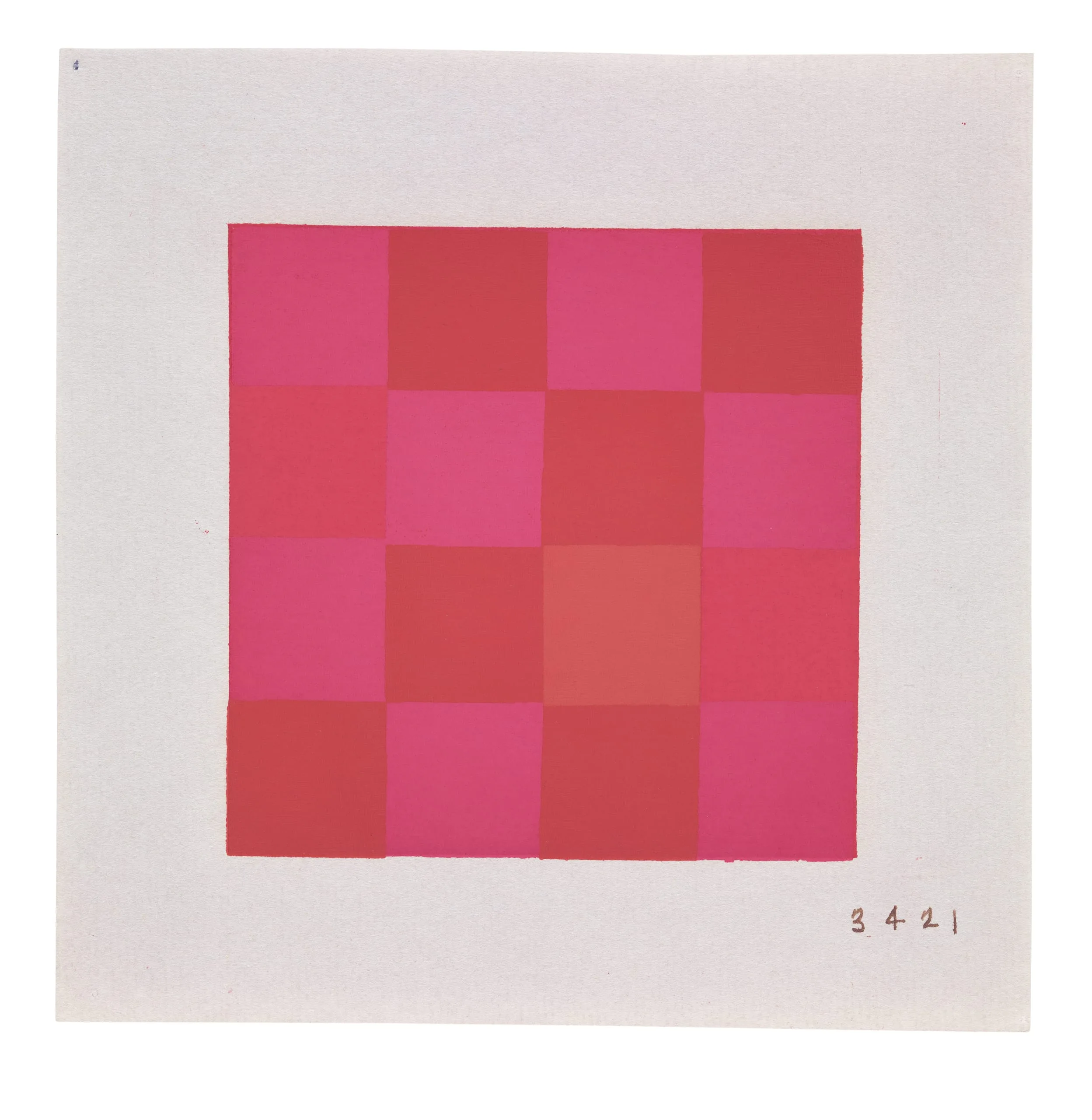 Abstract work on paper with a four-by-four checkerboard grid in alternating magenta-pink and crimson red squares, fading to pale rose at the center, surrounded by an off-white border; handwritten '3 4 2 1' in lower right