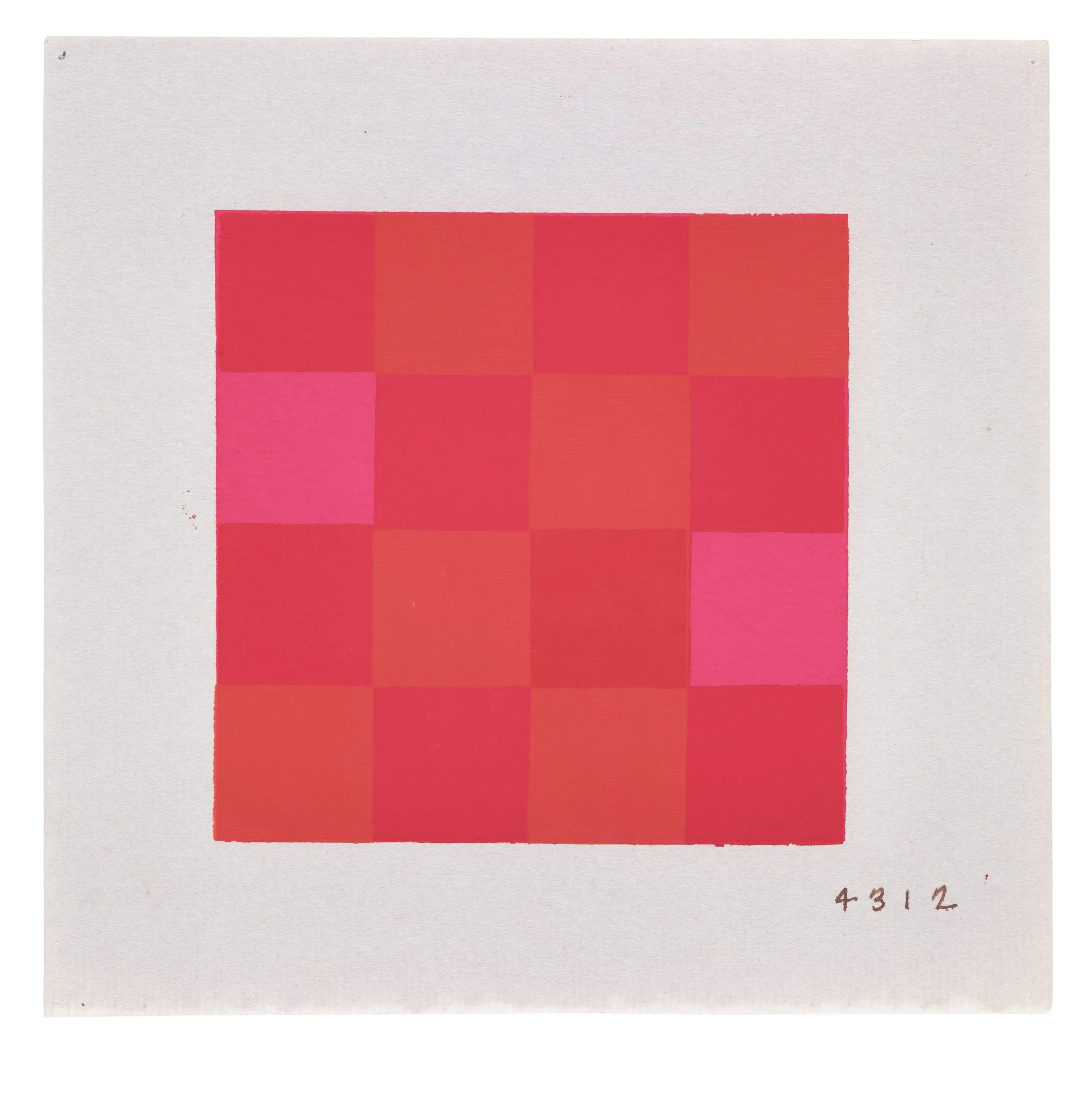 Abstract painting of a four-by-four grid of hard-edged squares in varying shades of red, coral, and magenta pink on a pale gray-white ground