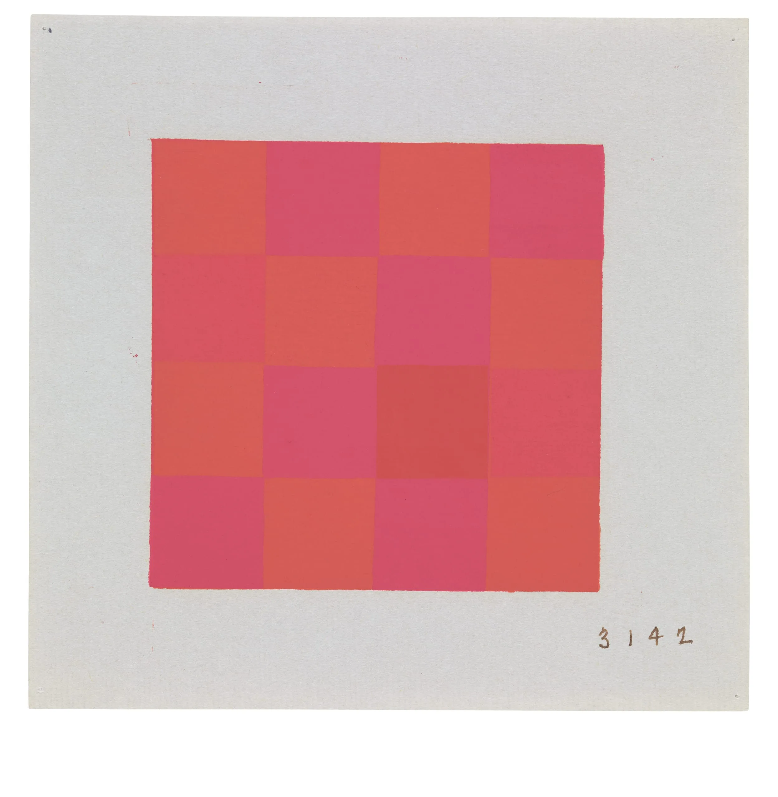 Abstract gouache or paint study, four-by-four checkerboard grid alternating tomato-red and magenta-pink squares on pale gray paper, numbered "3142" in lower right corner