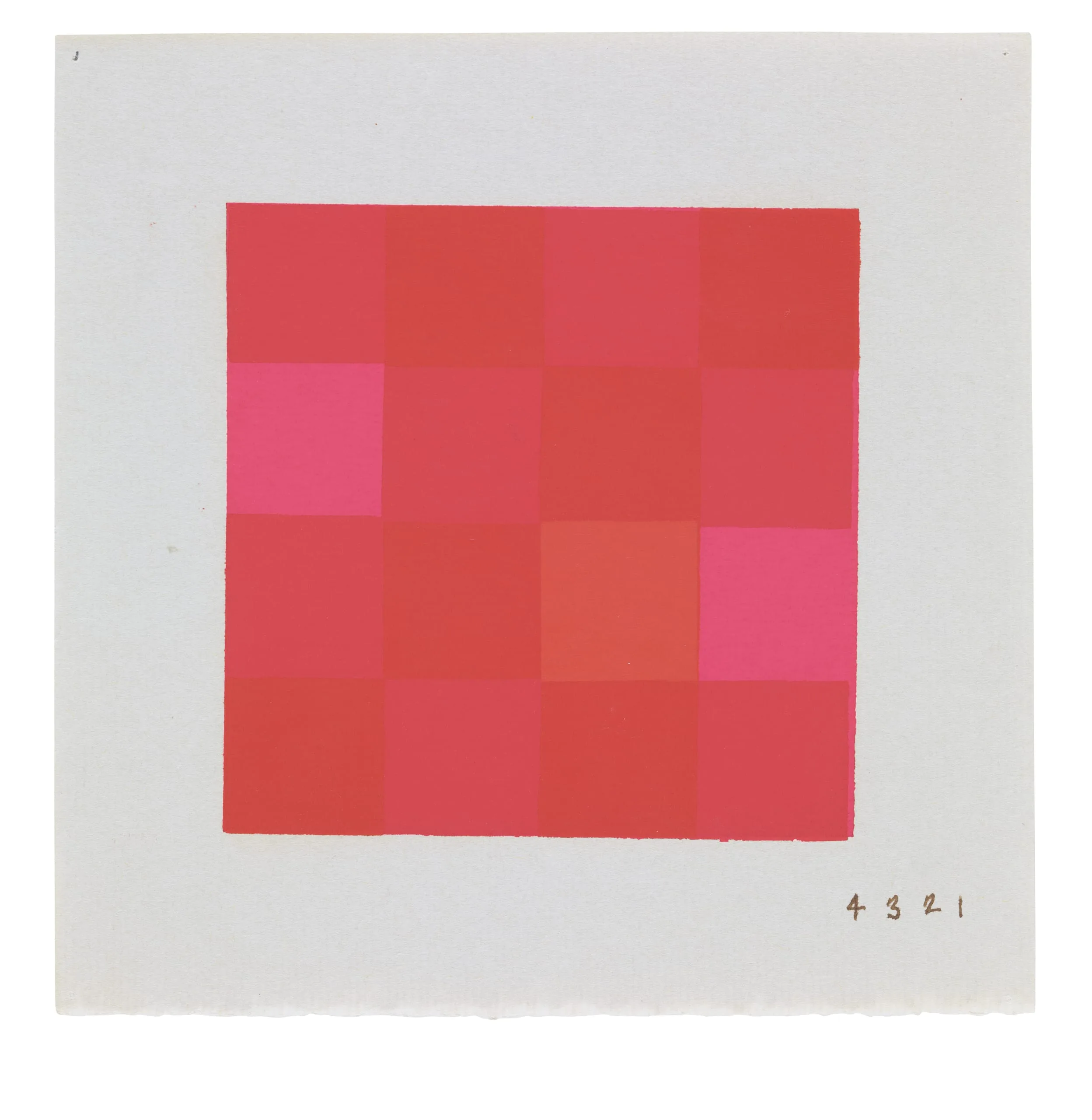 Abstract gouache or screenprint study, four-by-four grid of flat squares in shades of red, coral, and magenta on pale gray paper, with handwritten notation '4 3 2 1' at lower right
