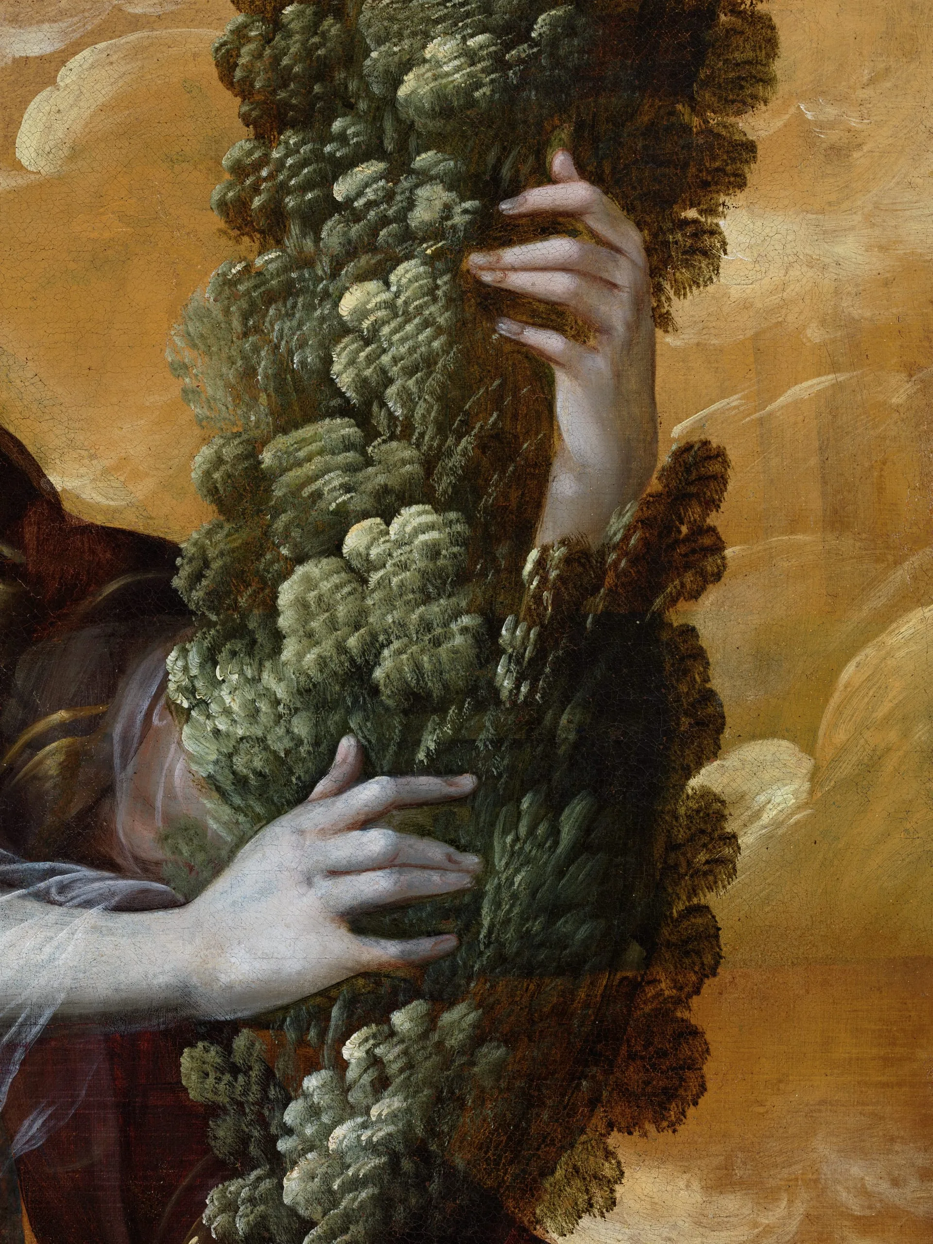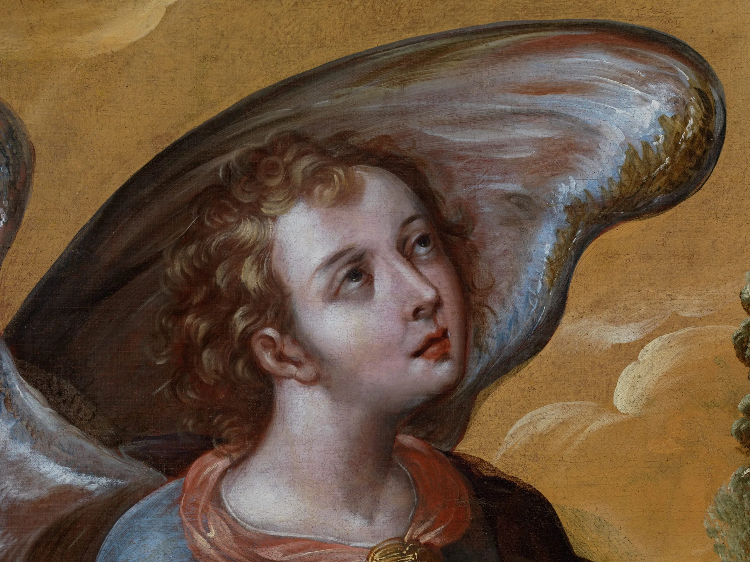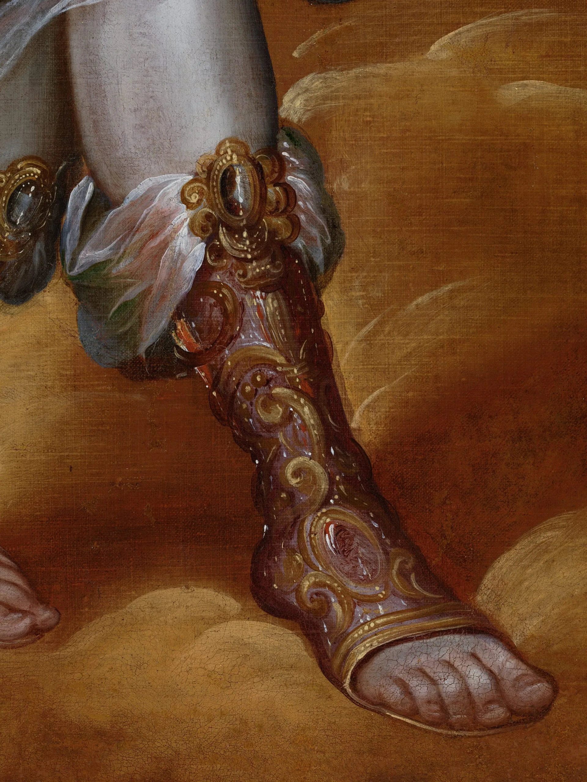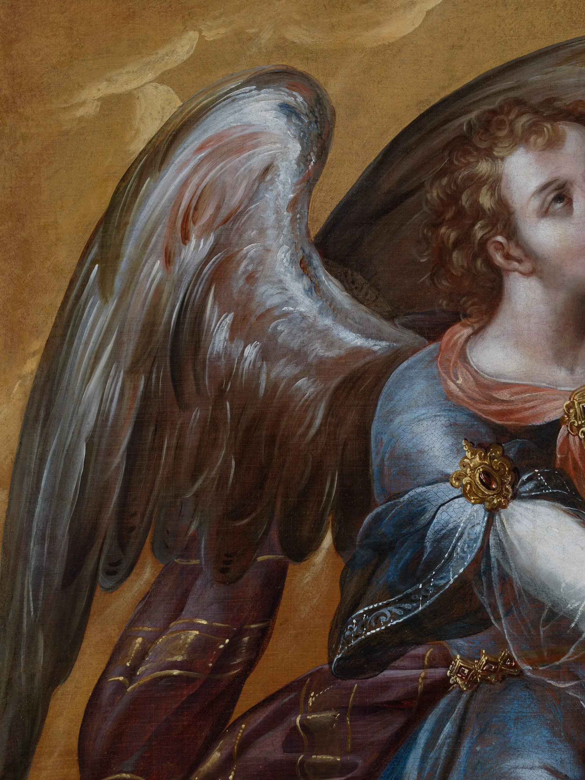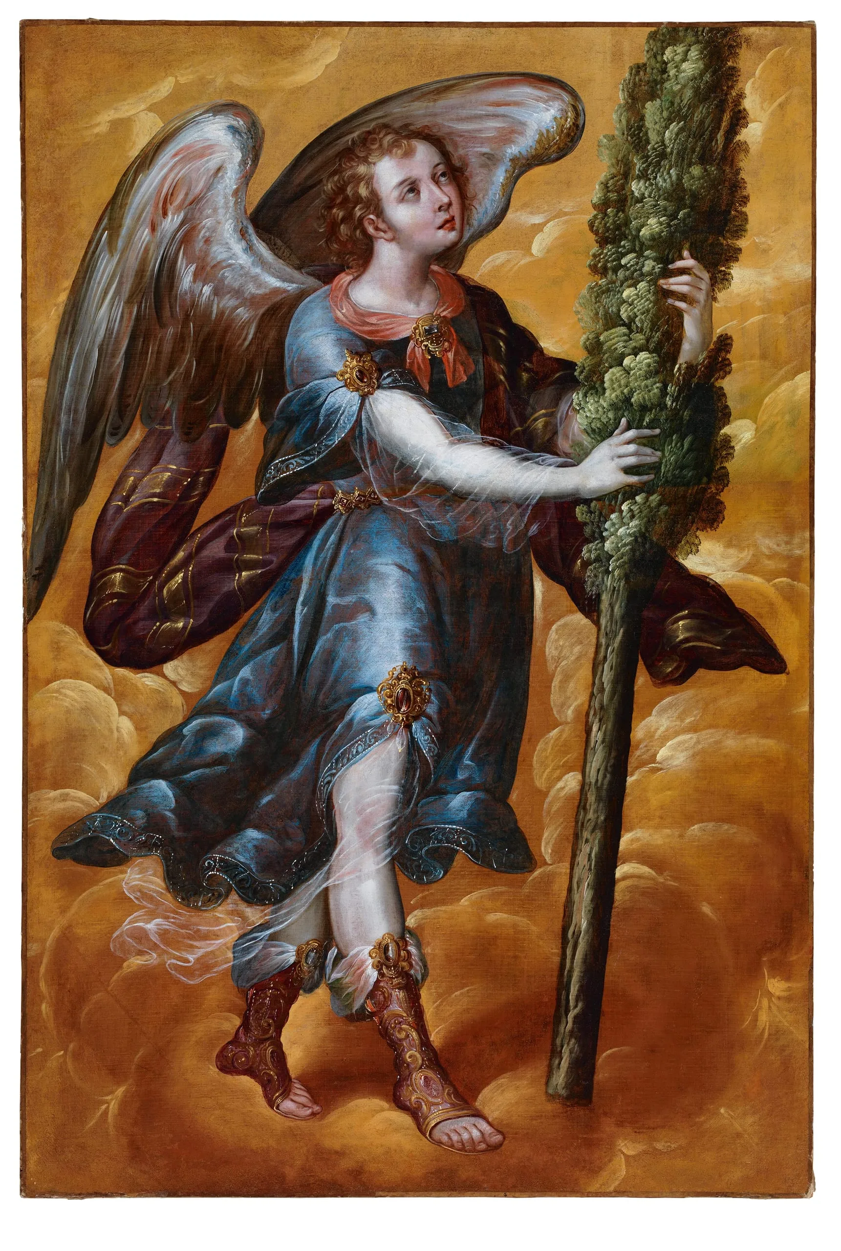 This painting depicts an angel standing in a golden cloud and carrying a cypress, a symbol associated with the purity of the Virgin Mary; it probably formed part of a lost altarpiece devoted to the Immaculate Conception. Stylistically, the picture is characteristic of Correa’s work from the period between 1670 and 1690 in terms of its vibrant palette, elegant composition and overall emphasis on decorative details (e.g., the diaphanous veils and cabochons of the angel’s attire). The figures’ proportions, with prominent muscular white arms, are also typical of Correa’s works of this period, as are the finely detailed hands, with elongated fingers. Another element that is characteristic of Correa’s style is the impressionistic detailing of the cypress’s foliage, painted by pressing the tip of the brush against the canvas and then quickly dragging it down. Correa was a master at creating subtle color gradations and providing a sense of iridescence, contributing to the overall mystical effect of the composition, seen here in the wings and the fabric of the angel’s boots.